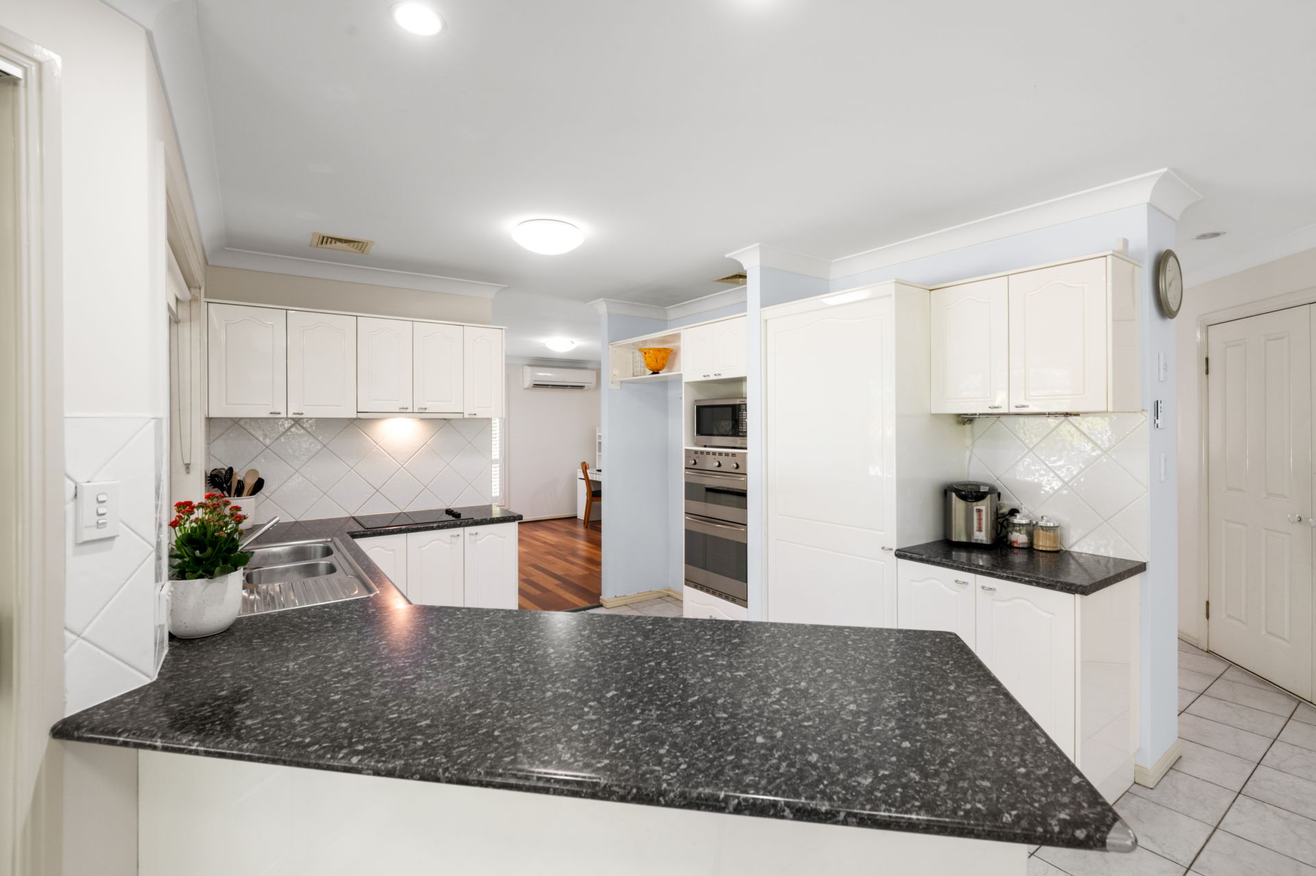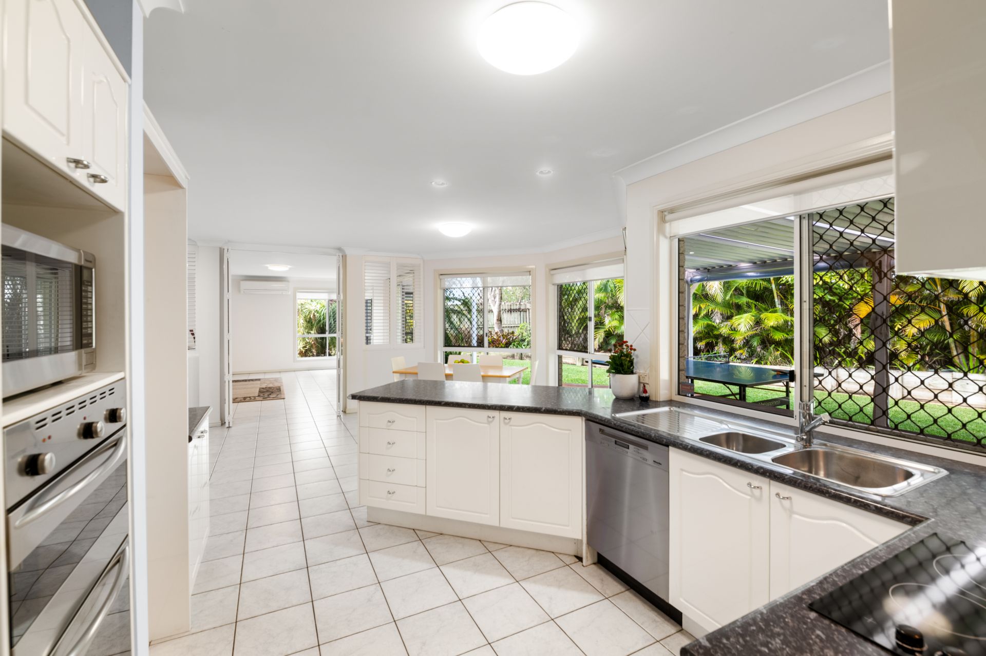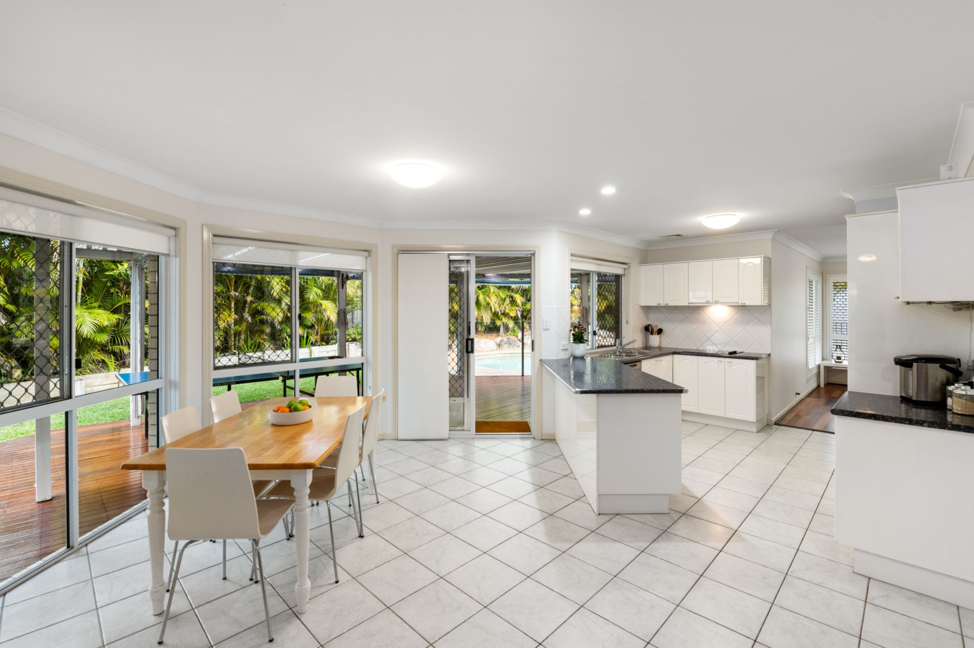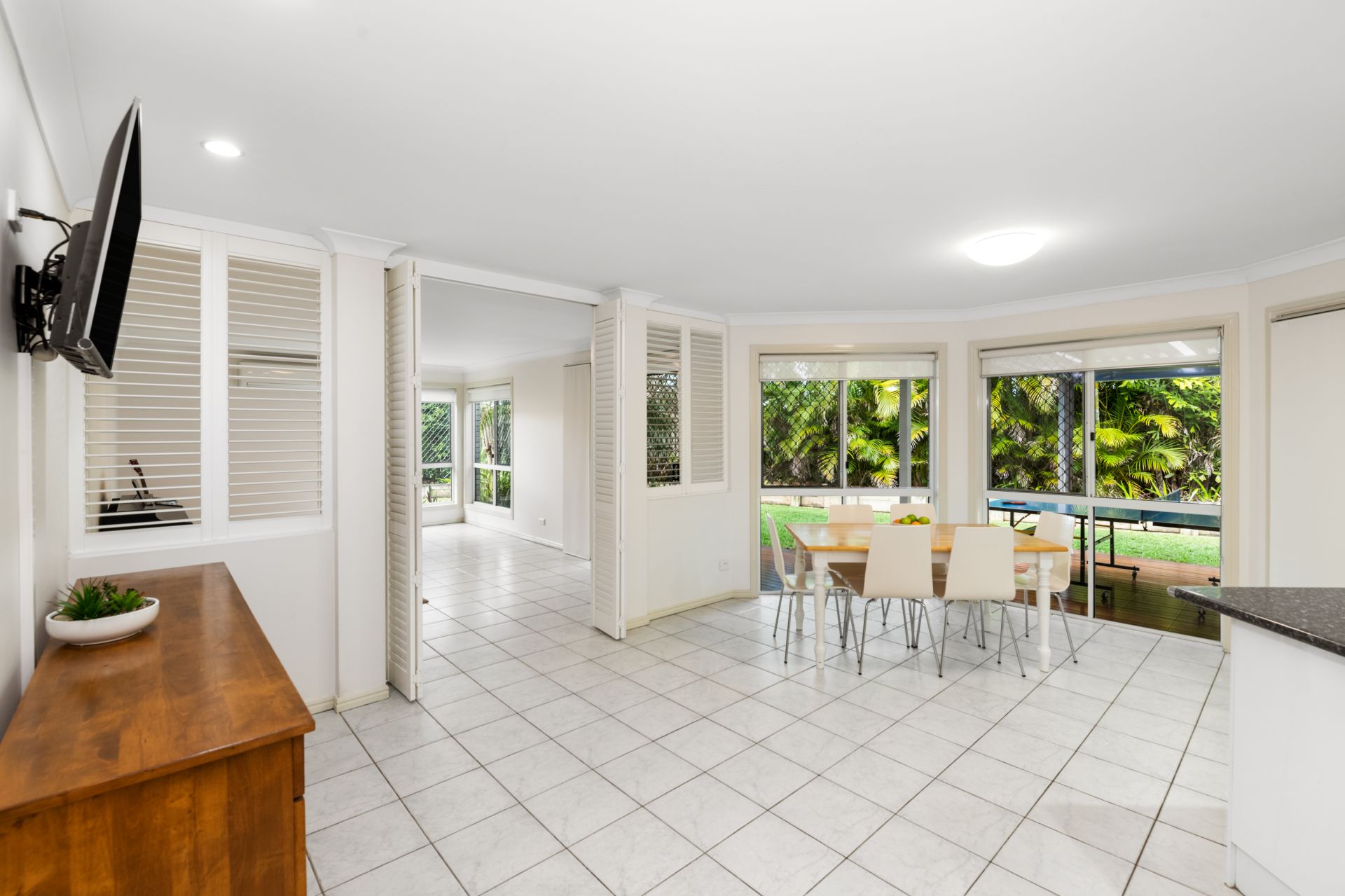 - Family room or meals area located beside the kitchen features tiled flooring and access to the outdoor entertaining area.