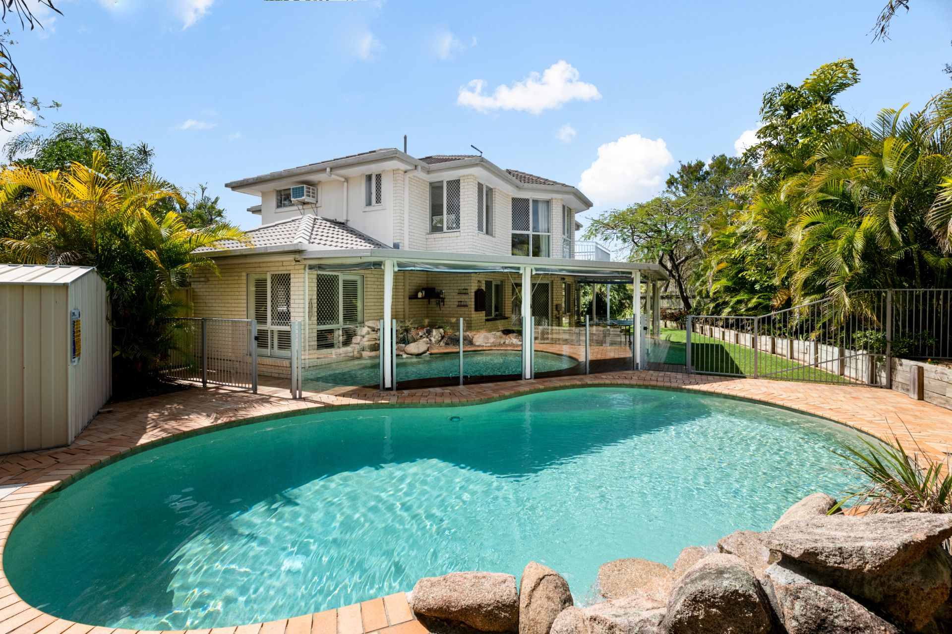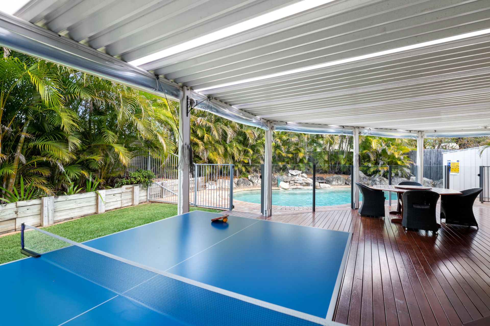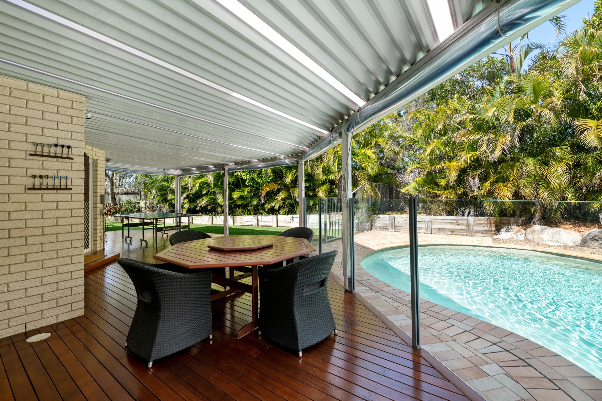 - Covered outdoor entertaining deck is perfectly position beside the stunning resort-style in-ground pool and features lighting and outdoor power points.