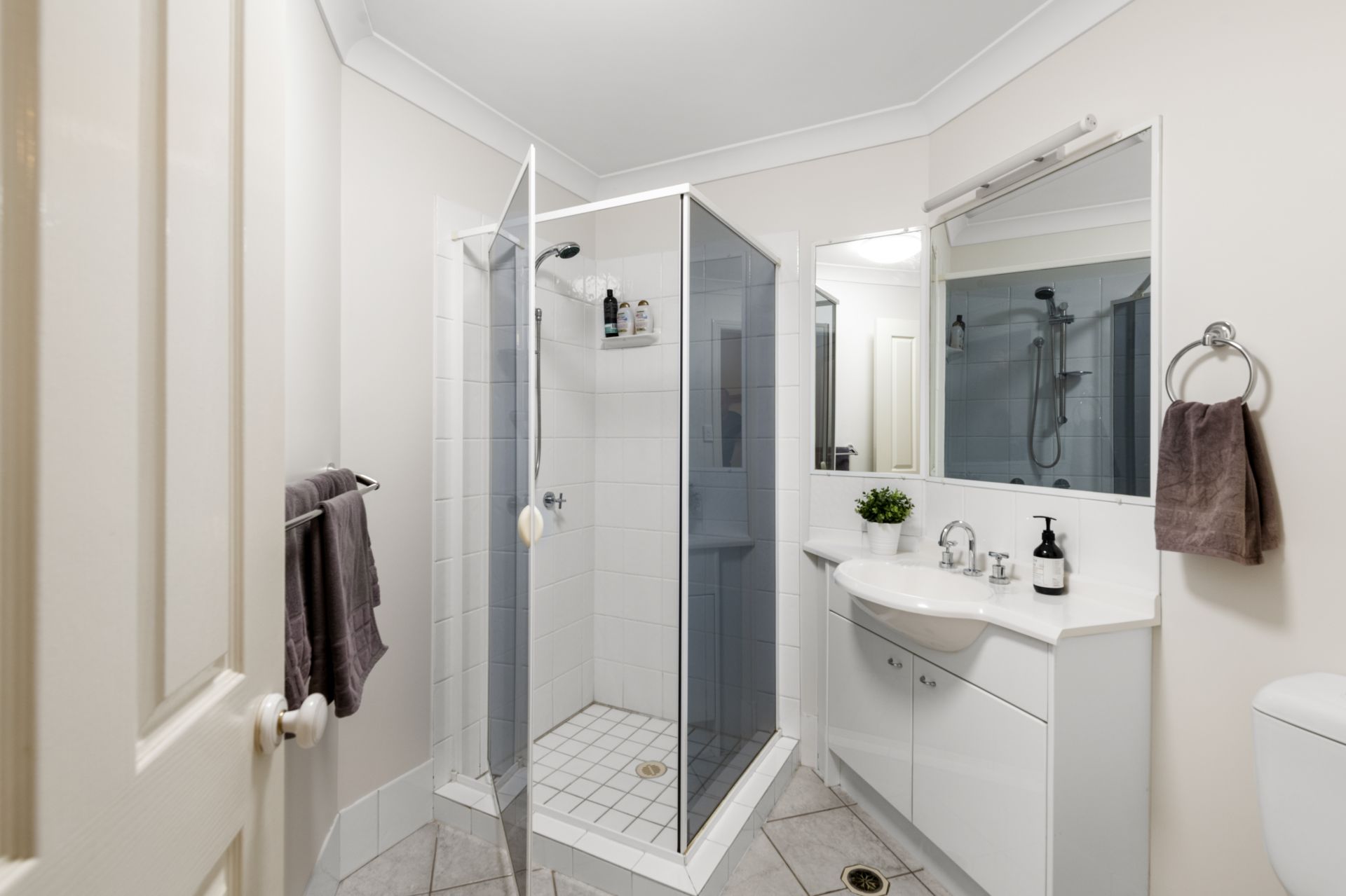 - Bathroom two is the spacious ensuite to the Master bedroom and features tiled flooring, oversized shower with detachable showerheads, single vanity, and toilet.