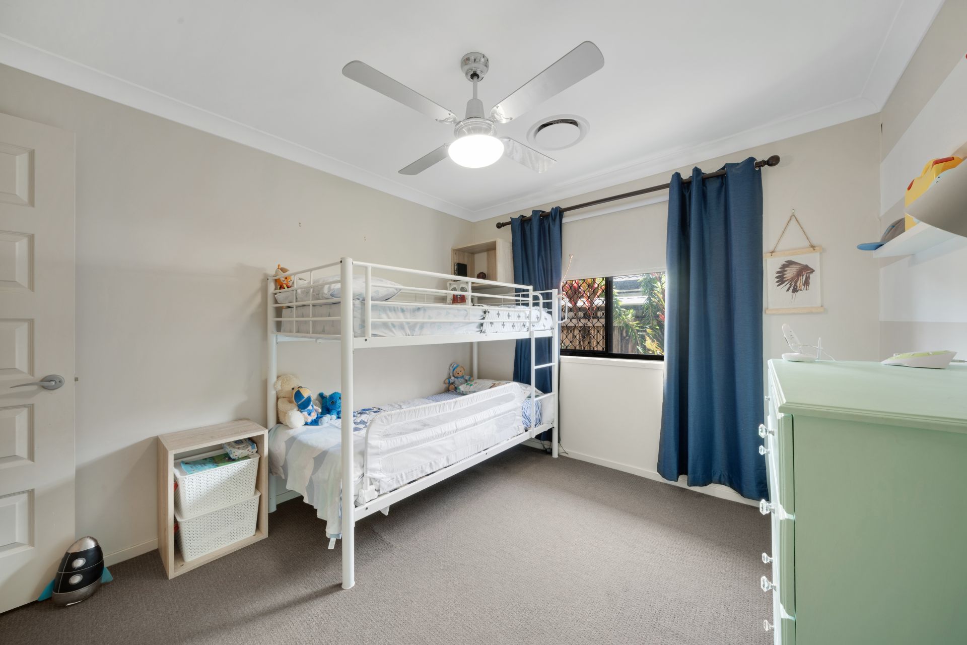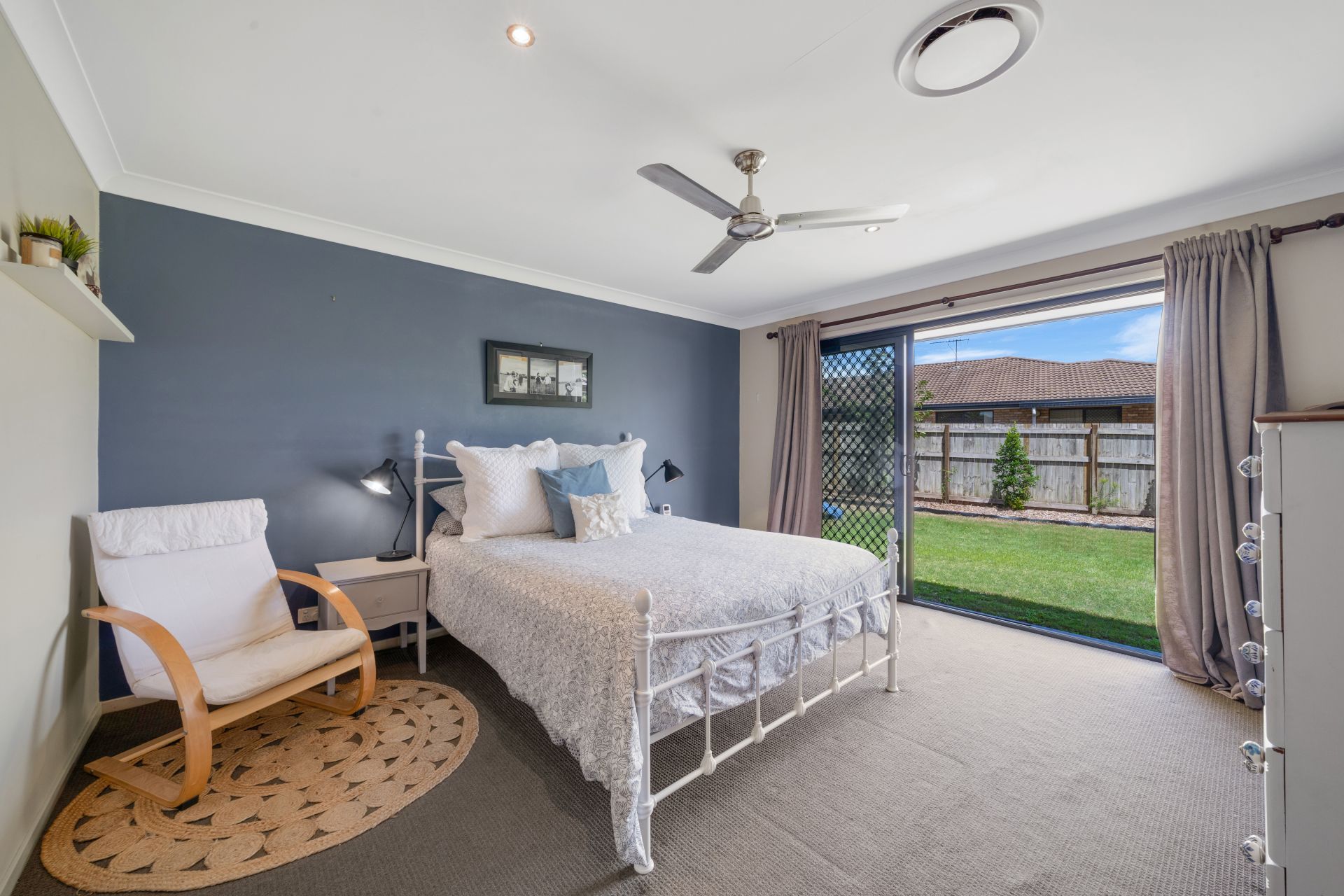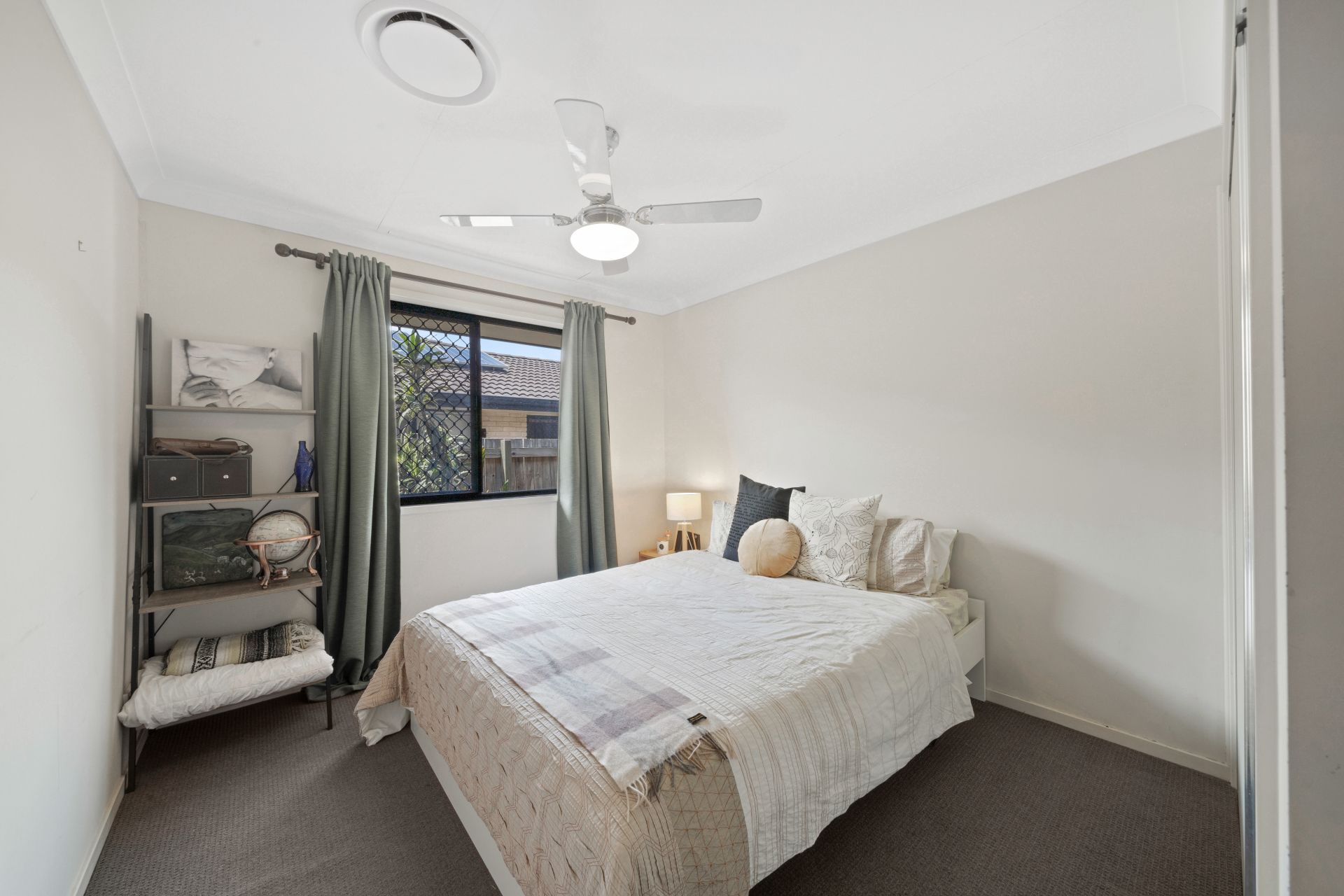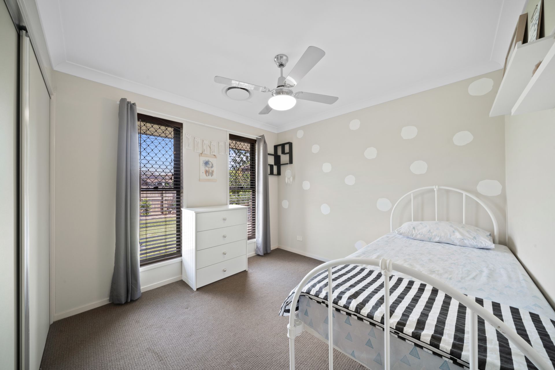 > Bedroom 3 features Dakin ducted air-conditioning, carpet flooring, ceiling fan with built-in light, built-in robes, security + fly screens, layered window trimmings with curtains + roller blind and modern traditional sliding windows.
