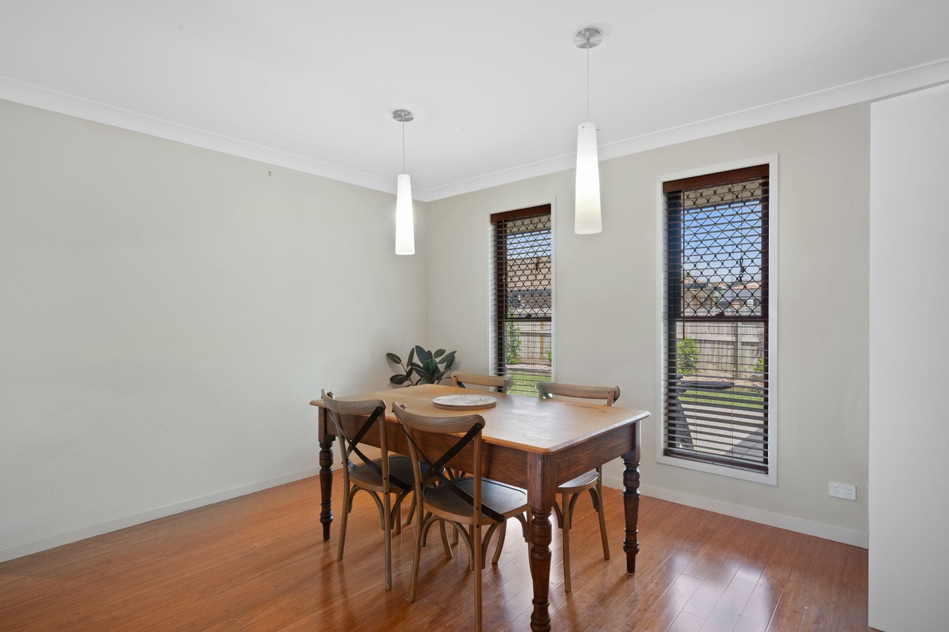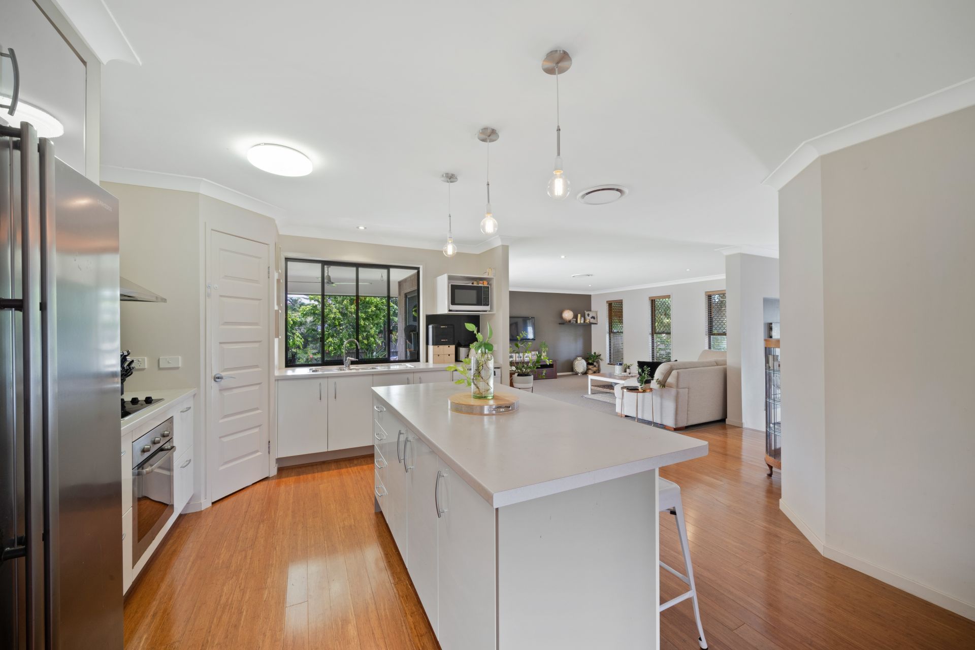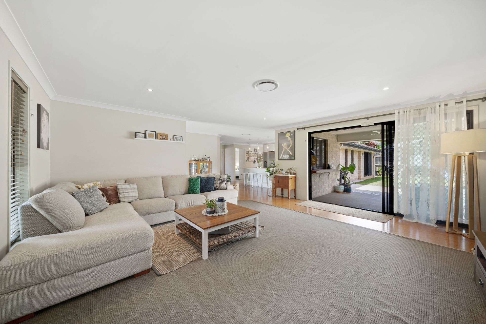 > The main living and dining areas flows effortlessly to the kitchen and out to the covered outdoor entertaining area. The light filled spaces are thanks to all the windows and doors add to the expansive nature of this home featuring a combination of bamboo wood + carpet flooring, Dakin ducted air-conditioning, combination of modern sash + sliding windows, security + fly screens, timber look venetian blinds as well as pendant + down-lighting throughout.