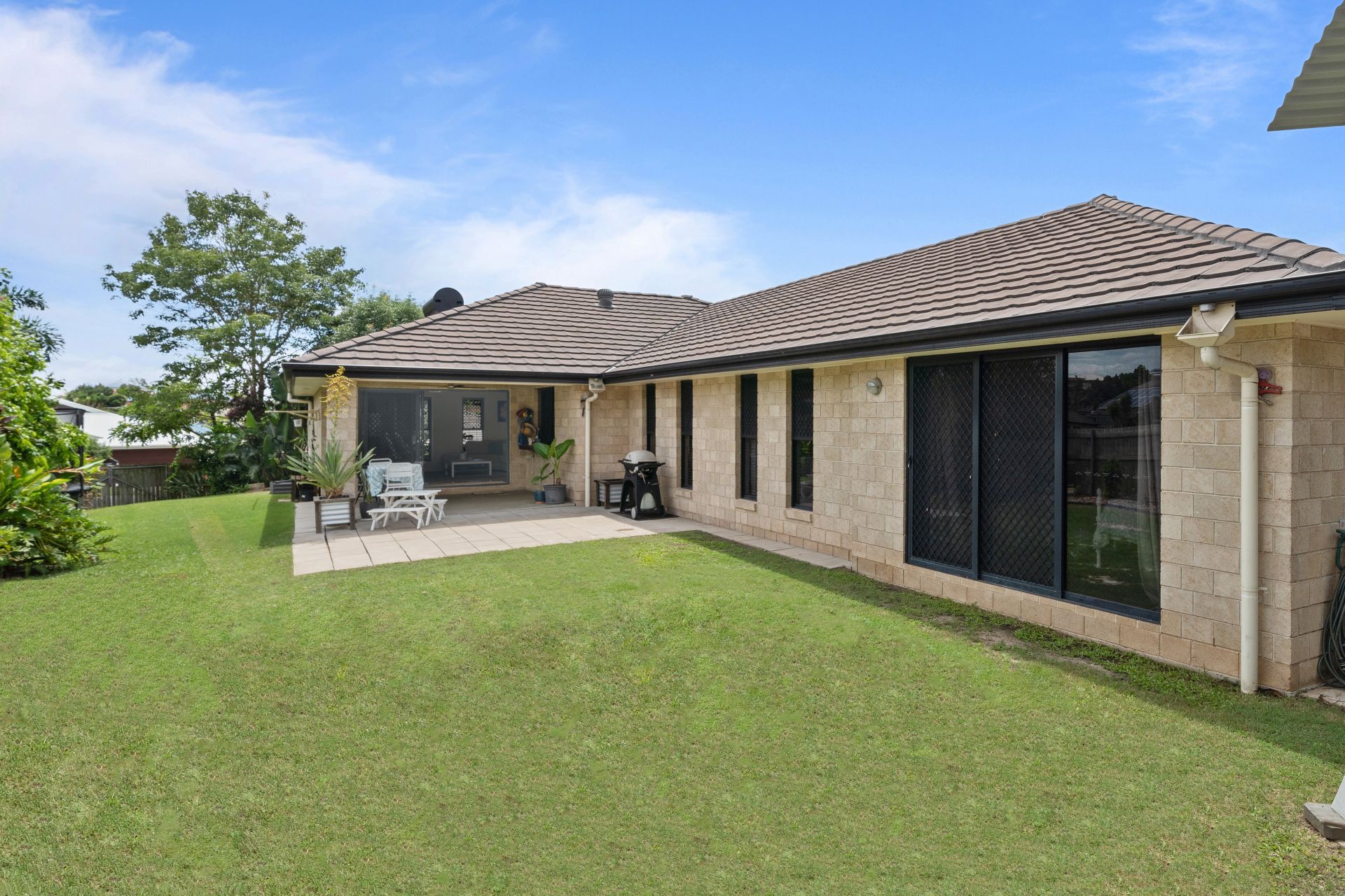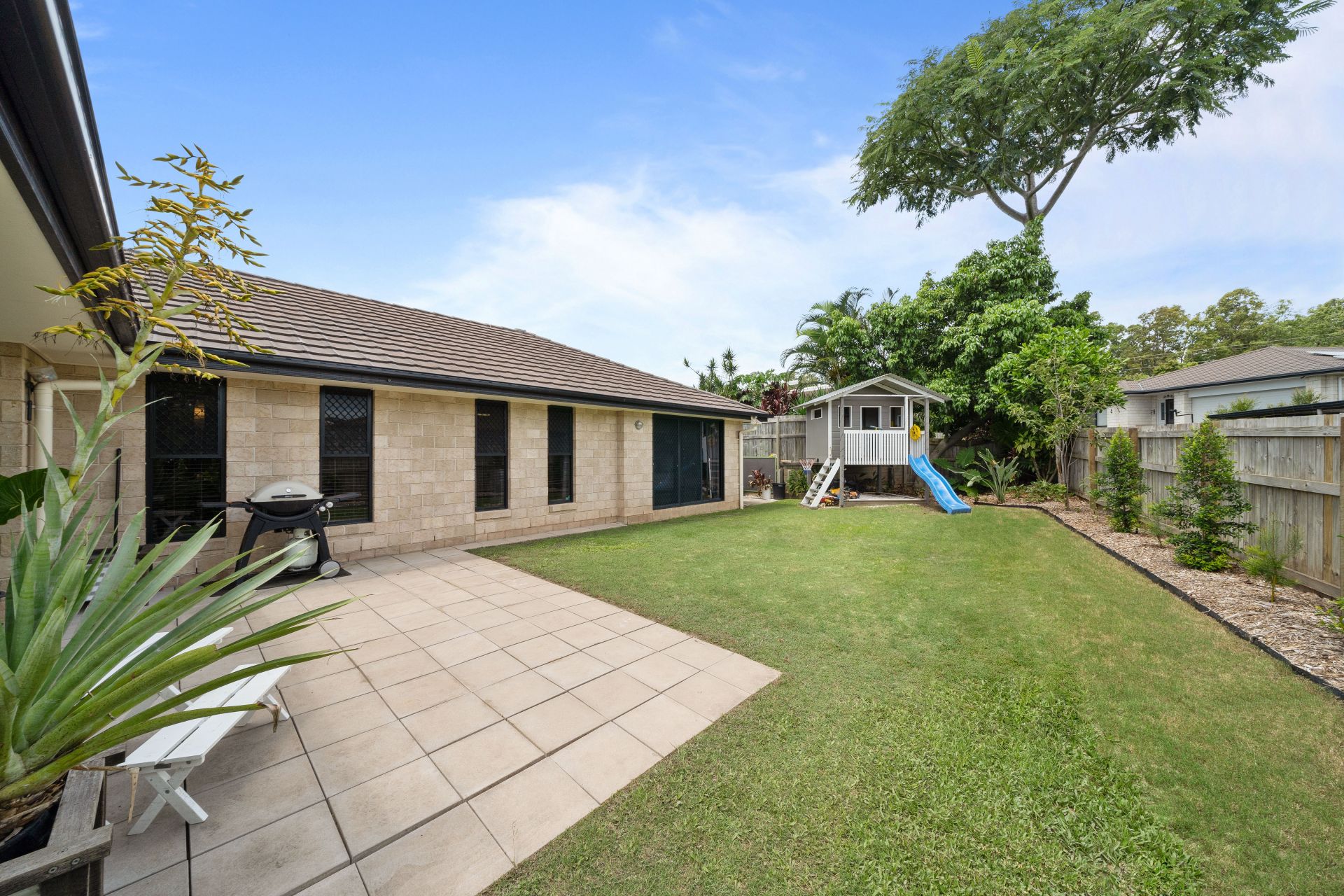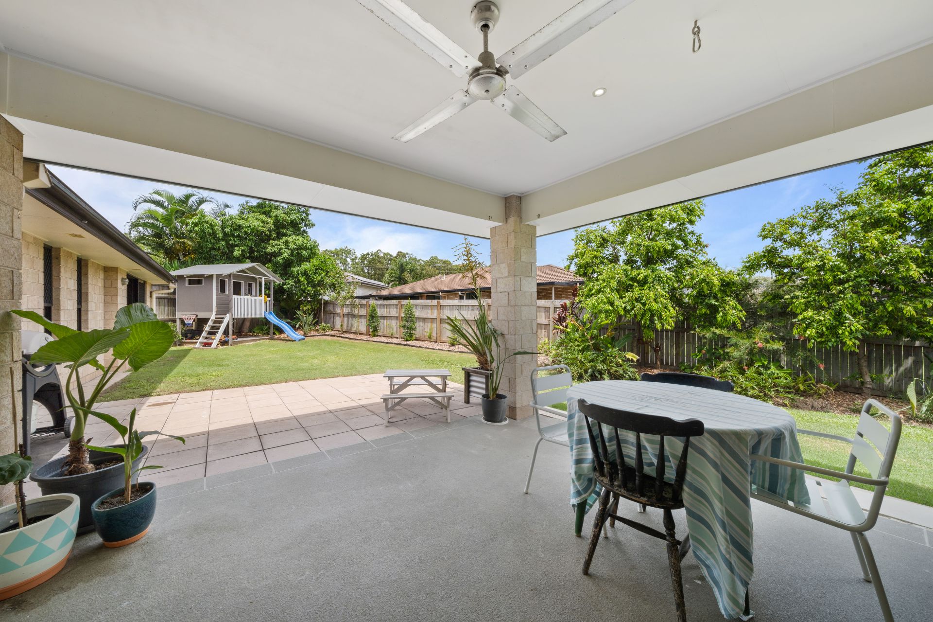 > Outdoor entertaining will be a breeze thanks to the covered patio that flows seamlessly from the main living/dining boasting outdoor lighting, pass window from the kitchen and outdoor power points. All this teamed up with the fully fenced kid and pet friendly yard encapsulates everything there is to love about our Queensland lifestyle making it the perfect space to relax and unwind with family and friends.