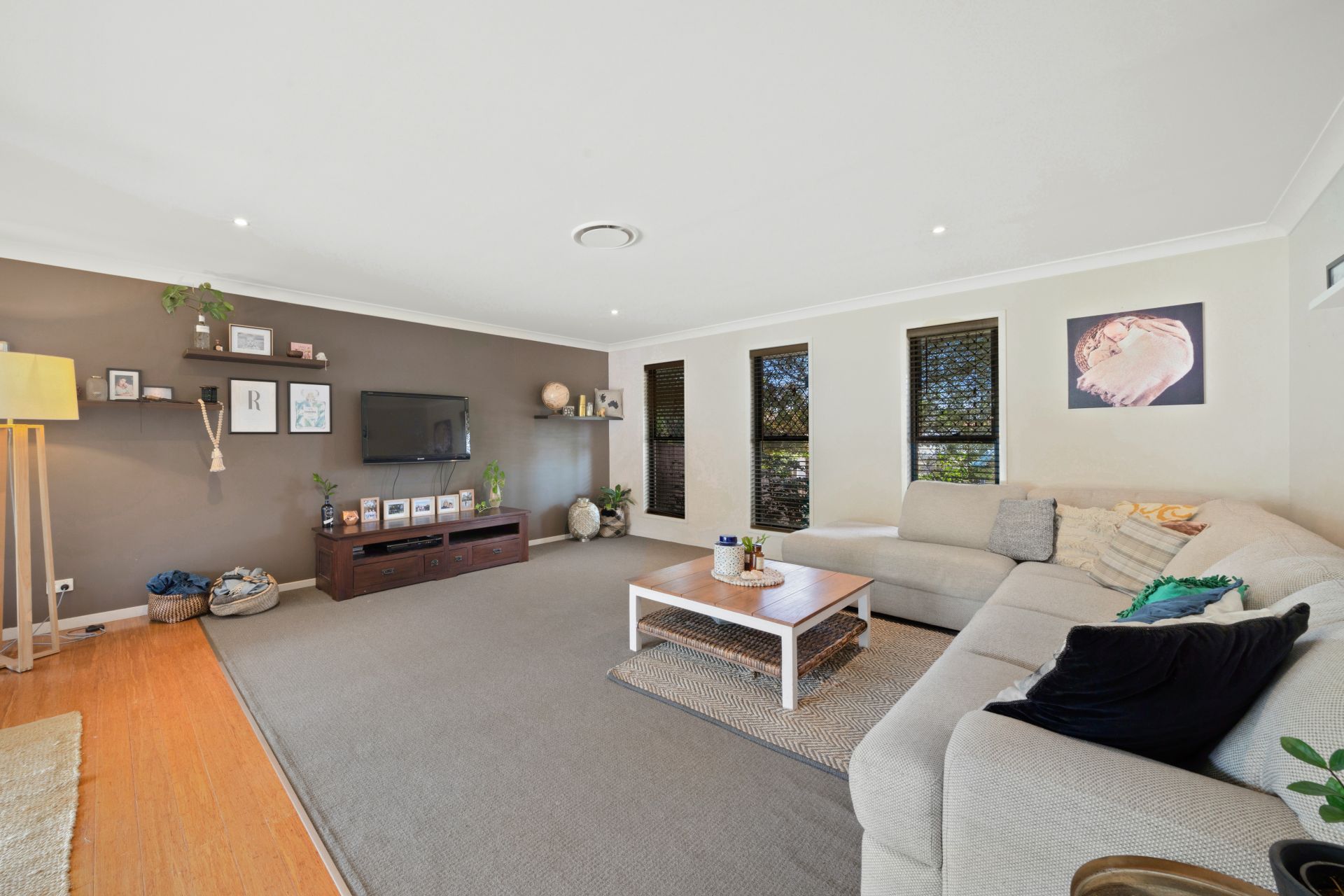 > Located in the middle of the home is the second living area featuring Dakin ducted air-conditioning, bamboo wood flooring, down lighting, modern traditional sliding windows with roller blind, security + fly screens and is the perfect place for teenagers to enjoy their own space or as an informal/formal living area.