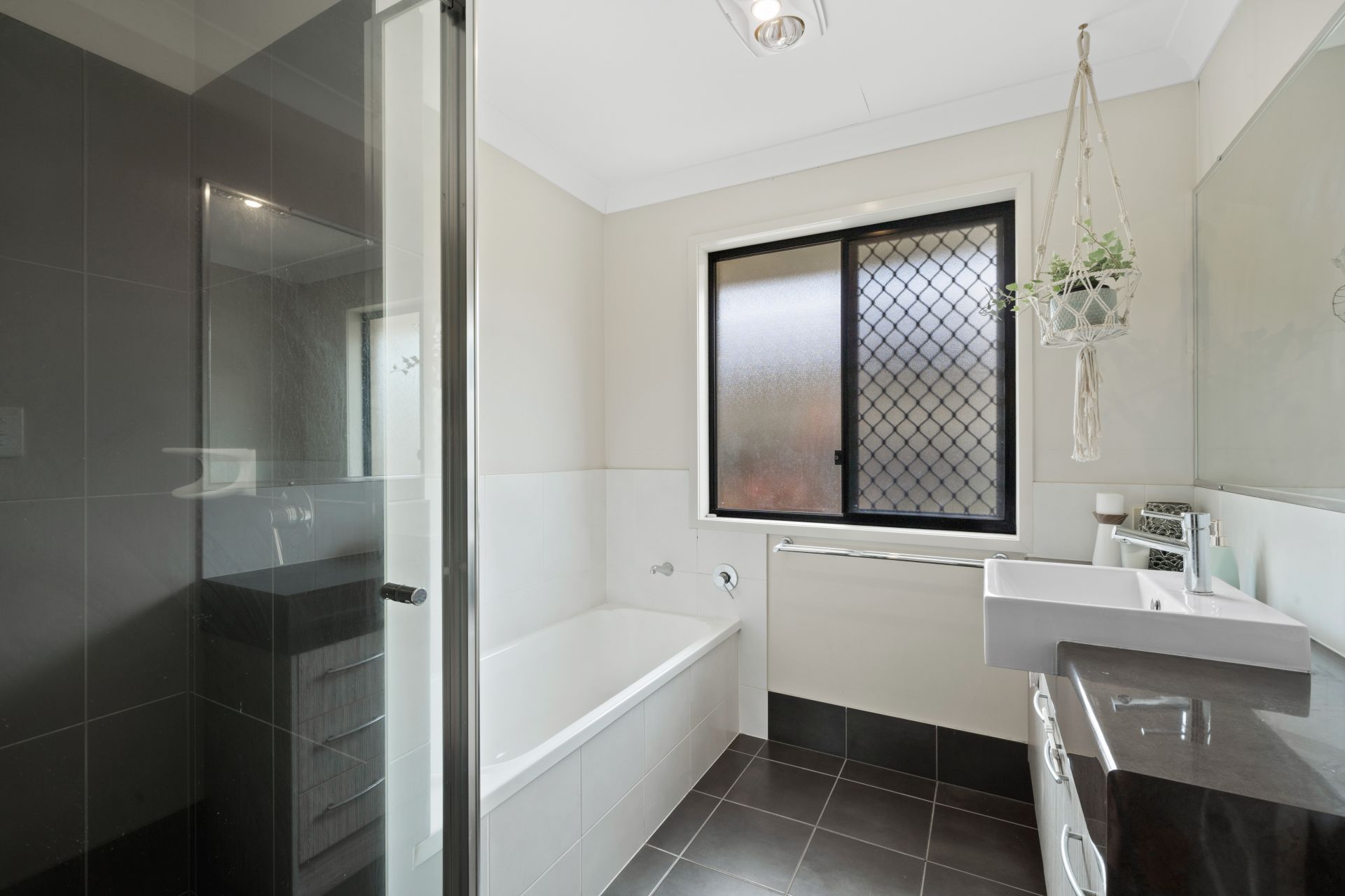 > The main bathroom features a shower with separate bath configuration, top mounted basin vanity, framed vanity mirror, towel rack, heat/extractor/light combo, and separate toilet.