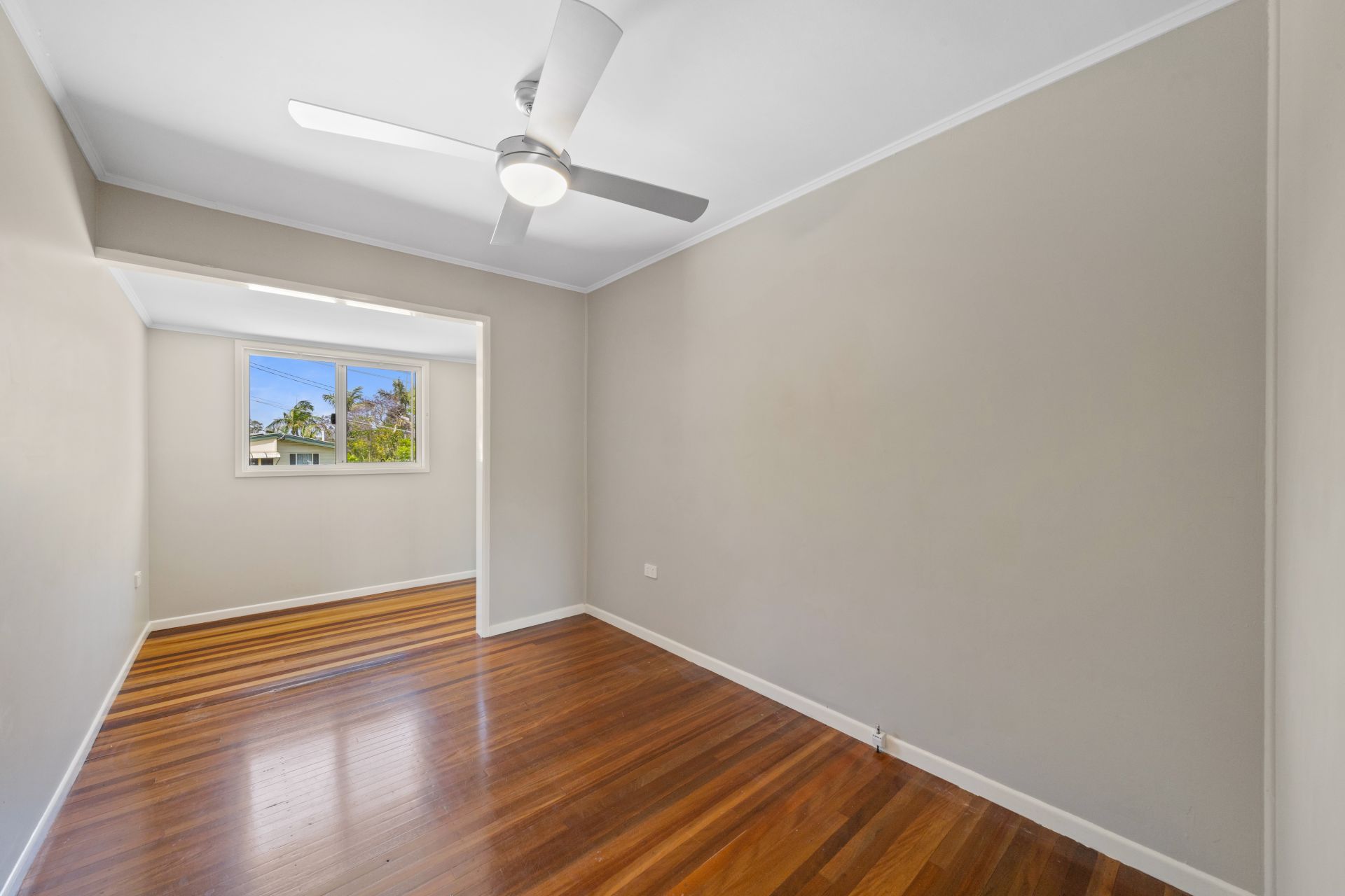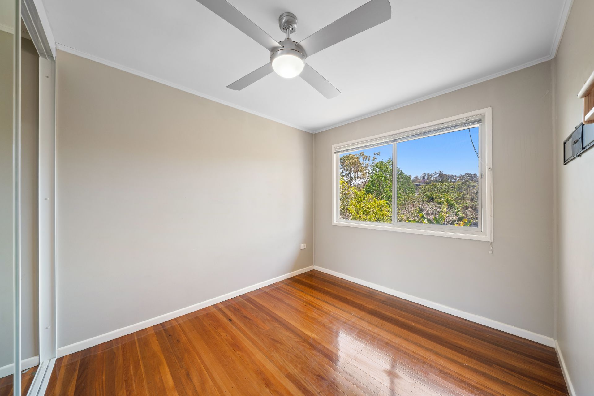 > Bedroom 3 features ceiling fan with in-built lighting, sliding windows, rich timber flooring and space perfect for a study nook.