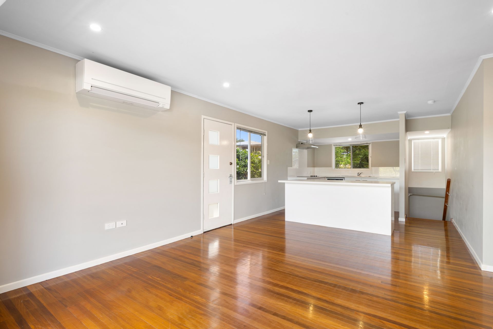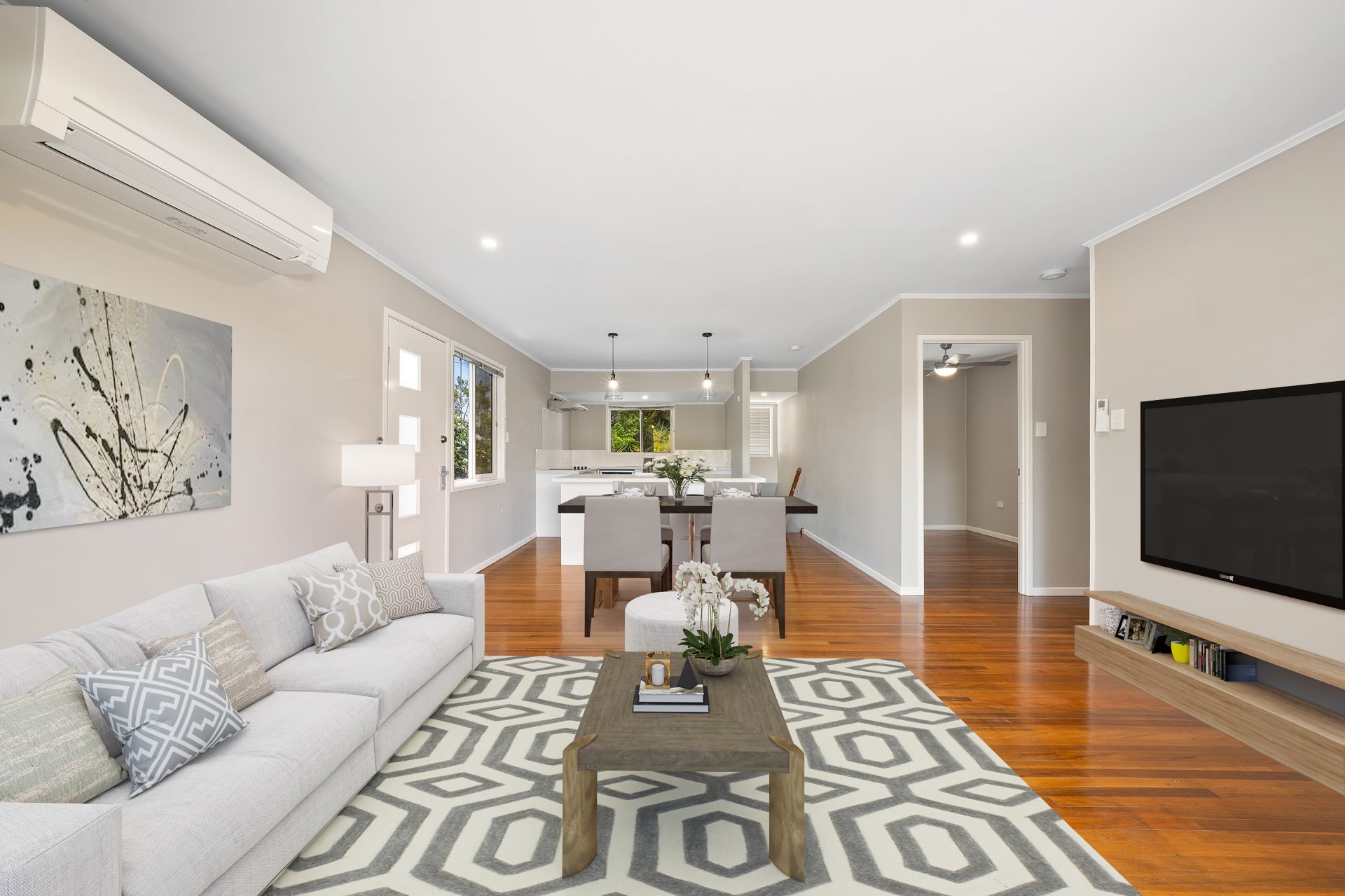 > The open plan main lounge/dining areas located at the heart of the home flow effortlessly to the kitchen and through to the external of the property. The light colour scheme adds to the expansive nature of the home, boasting split-system air-conditioning, down-lighting, rich timber flooring and bi-fold doors giving you access to the deck.