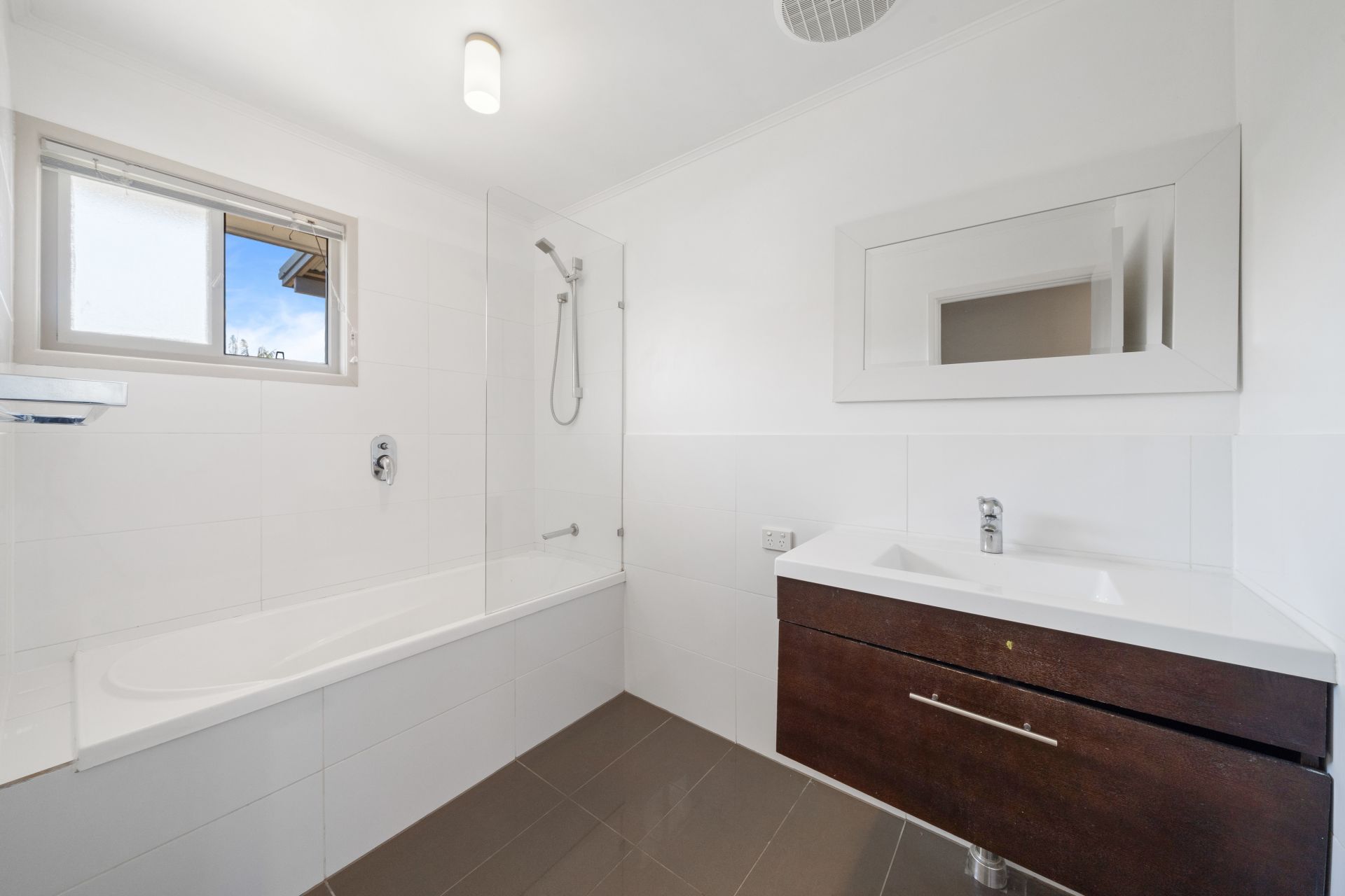 > The main bathroom located upstairs features shower over bath configuration, detachable shower head, floating vanity with storage, vanity mirror, extractor, standard light, sliding window with venetian blind and separate toilet.