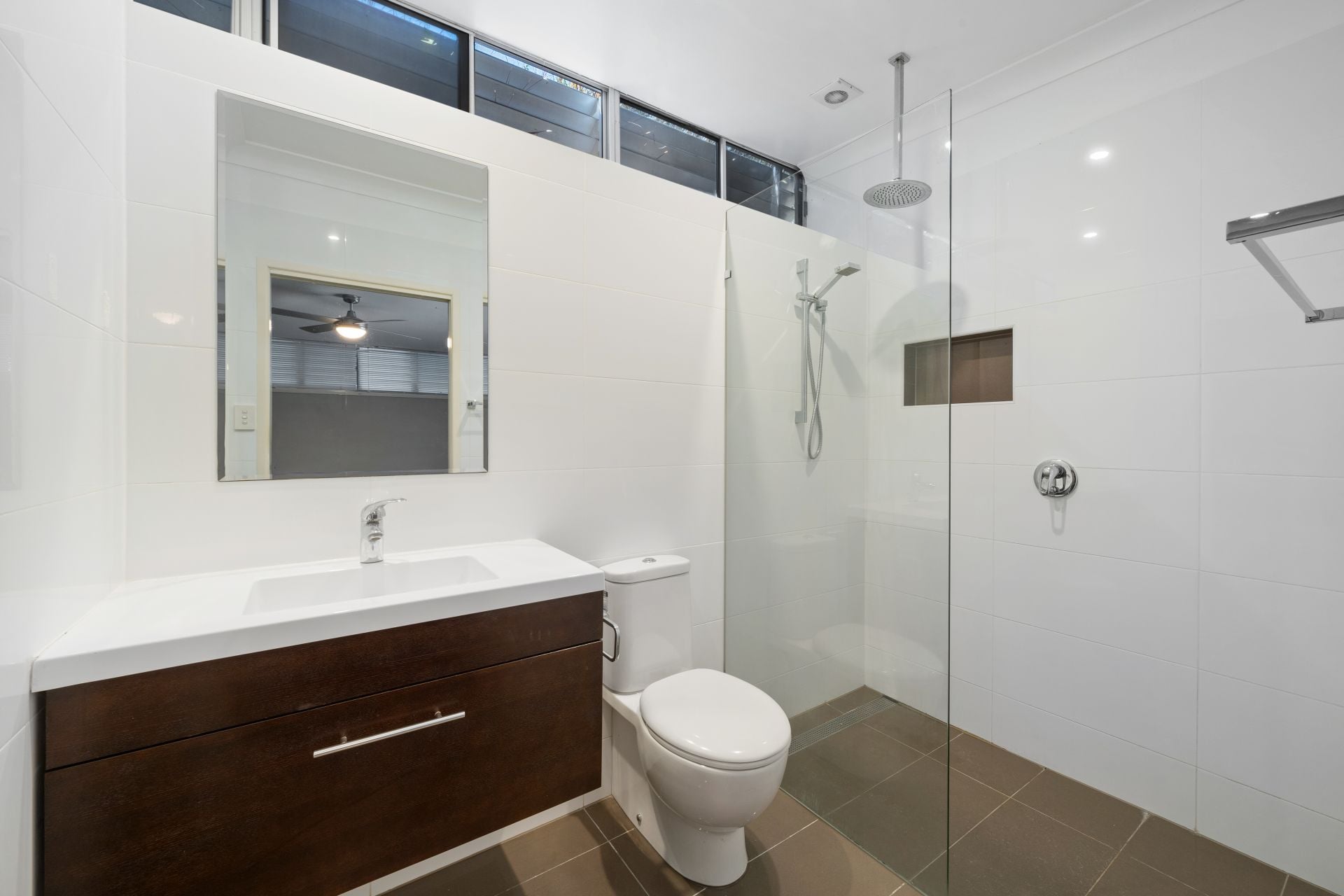 > Located on the lower level of the property is a wet room offering a shower with dual shower heads (detachable and monsoon), floating vanity with storage, vanity mirror, extractor, standard light, sliding windows and toilet.