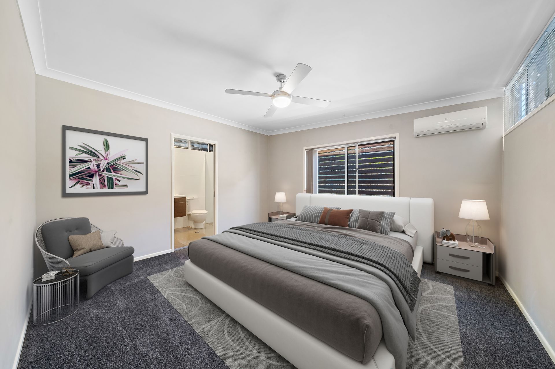 > Located just off the entry to the home on the lower level is a large multipurpose room boasting carpet flooring, split-system air-conditioning, sliding windows with blinds leading through a wet room (full bathroom facilities) to another multipurpose room (previously used as a walk-in-wardrobe) with sliding windows and wall shelving.