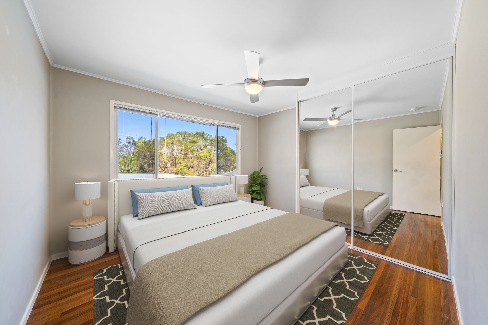 > Bedroom 2 features ceiling fan with in-built lighting, sliding windows, fly screens, venetian blinds, rich timber flooring and built-in robe.
