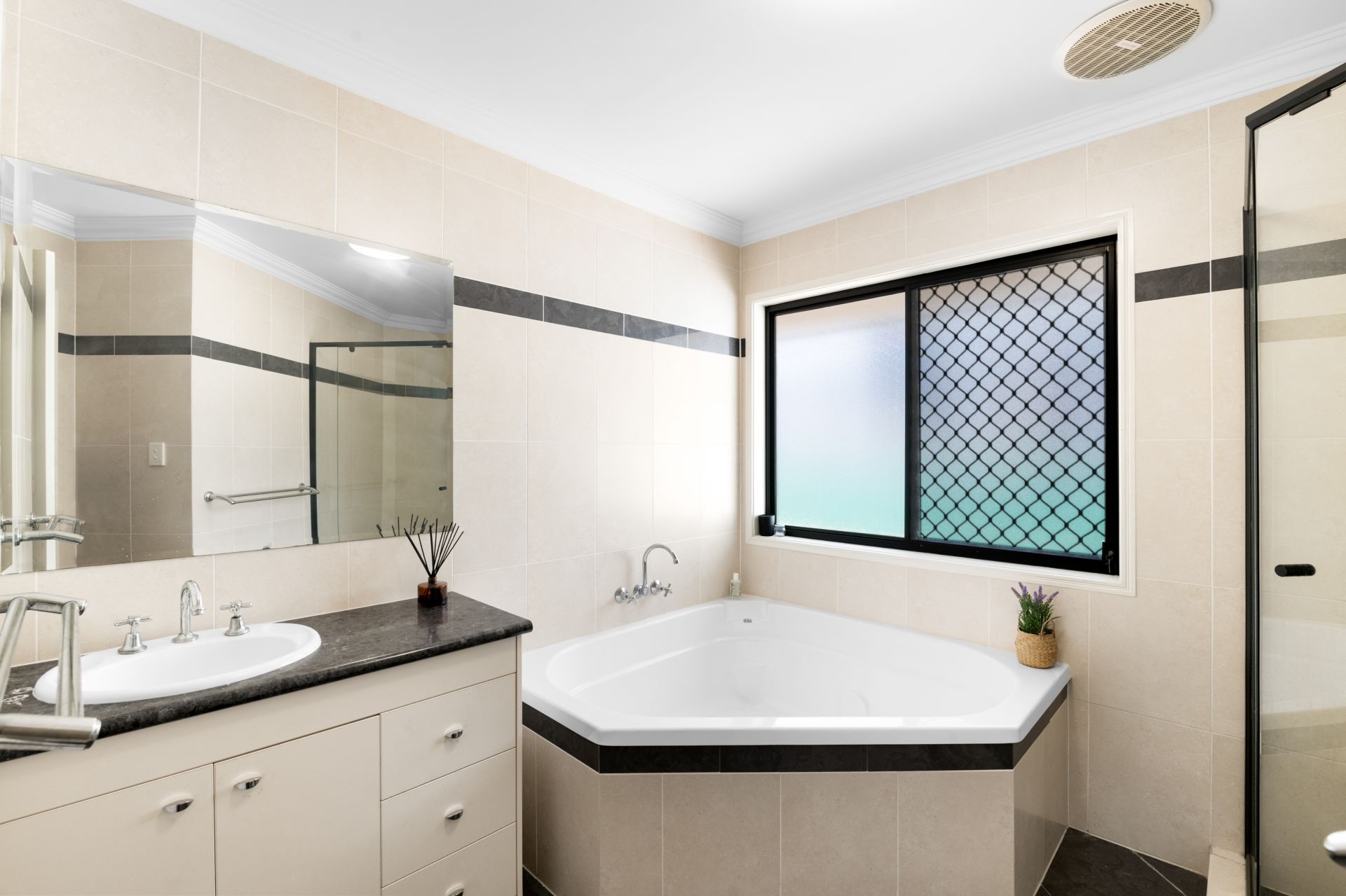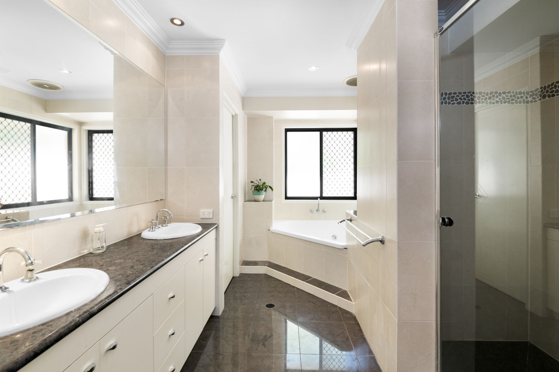 - Bathroom two is the spacious ensuite to the Master bedroom featuring tiled flooring, oversized shower, spa bath, dual vanity, floor-to-ceiling tiles, and separate toilet.