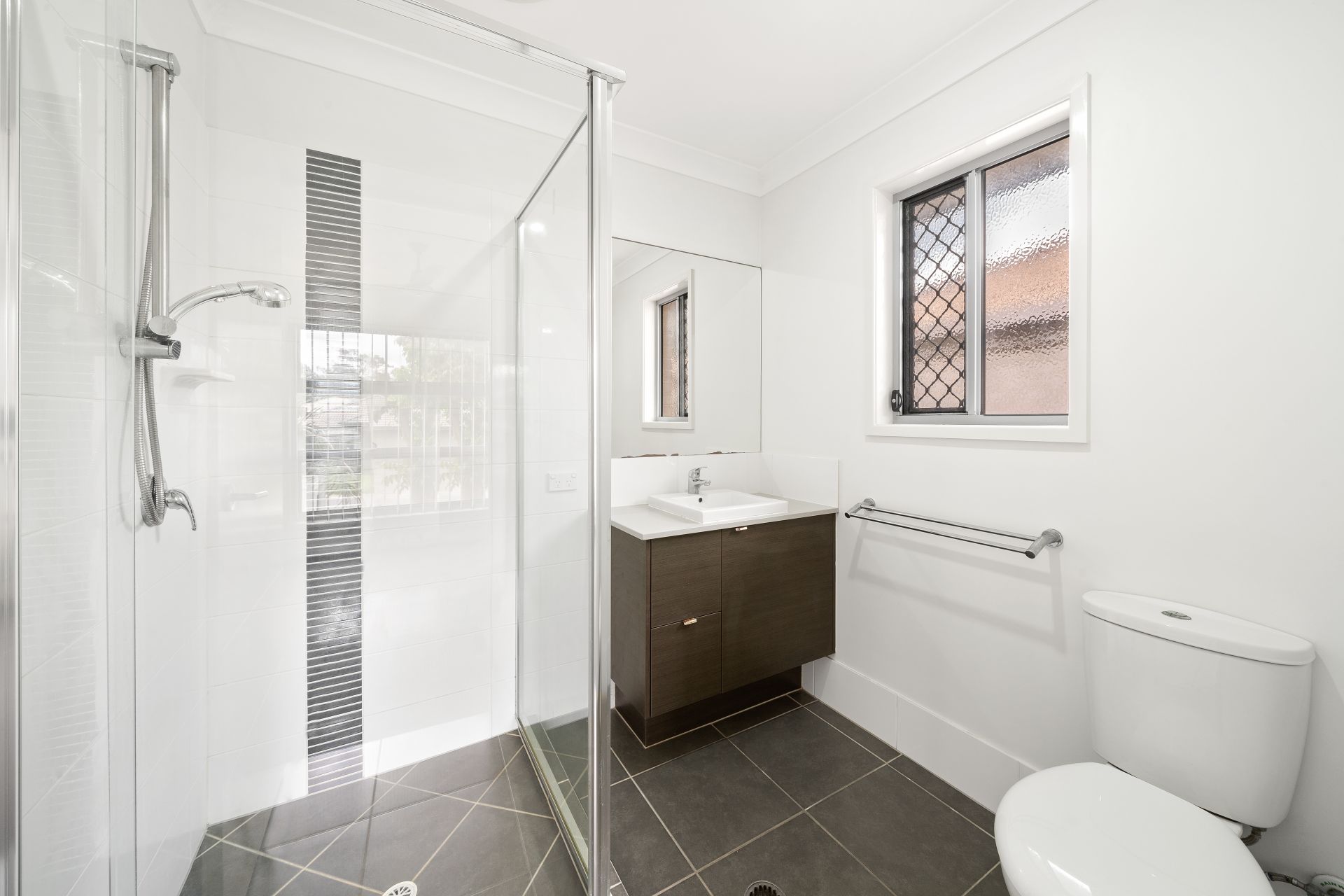 > The ensuite bathroom to the master offers single basin vanity with plenty of storage, wall mounted vanity mirror, shower with detachable showerhead, light & extractor, towel rail and toilet.