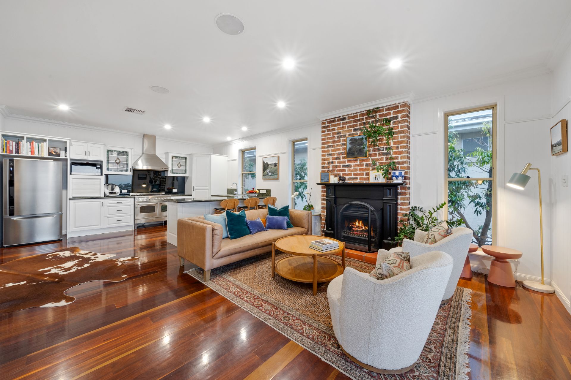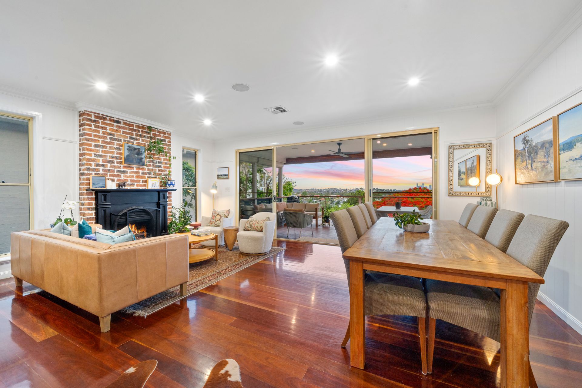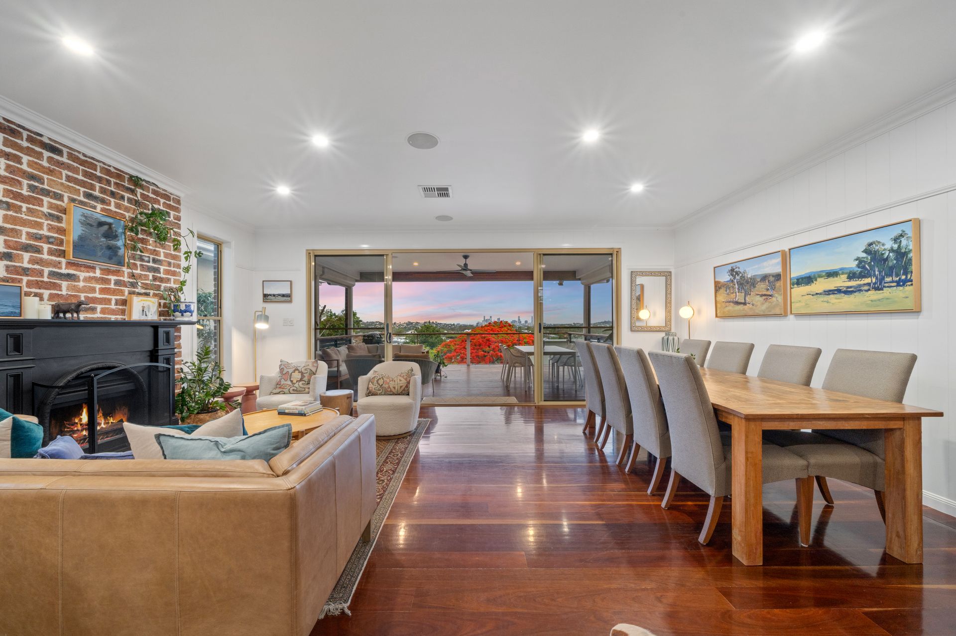 > The open plan main living/dining areas located on the top level of the home flow effortlessly to the kitchen and through to the first the outdoor entertaining areas. The light and contemporary colour scheme adds to the expansive nature of the home, featuring Panasonic ducted air-conditioning, down-lighting, rich timber flooring, VJ walls, picture railing, working fire place, large glass sliding doors and sash windows.