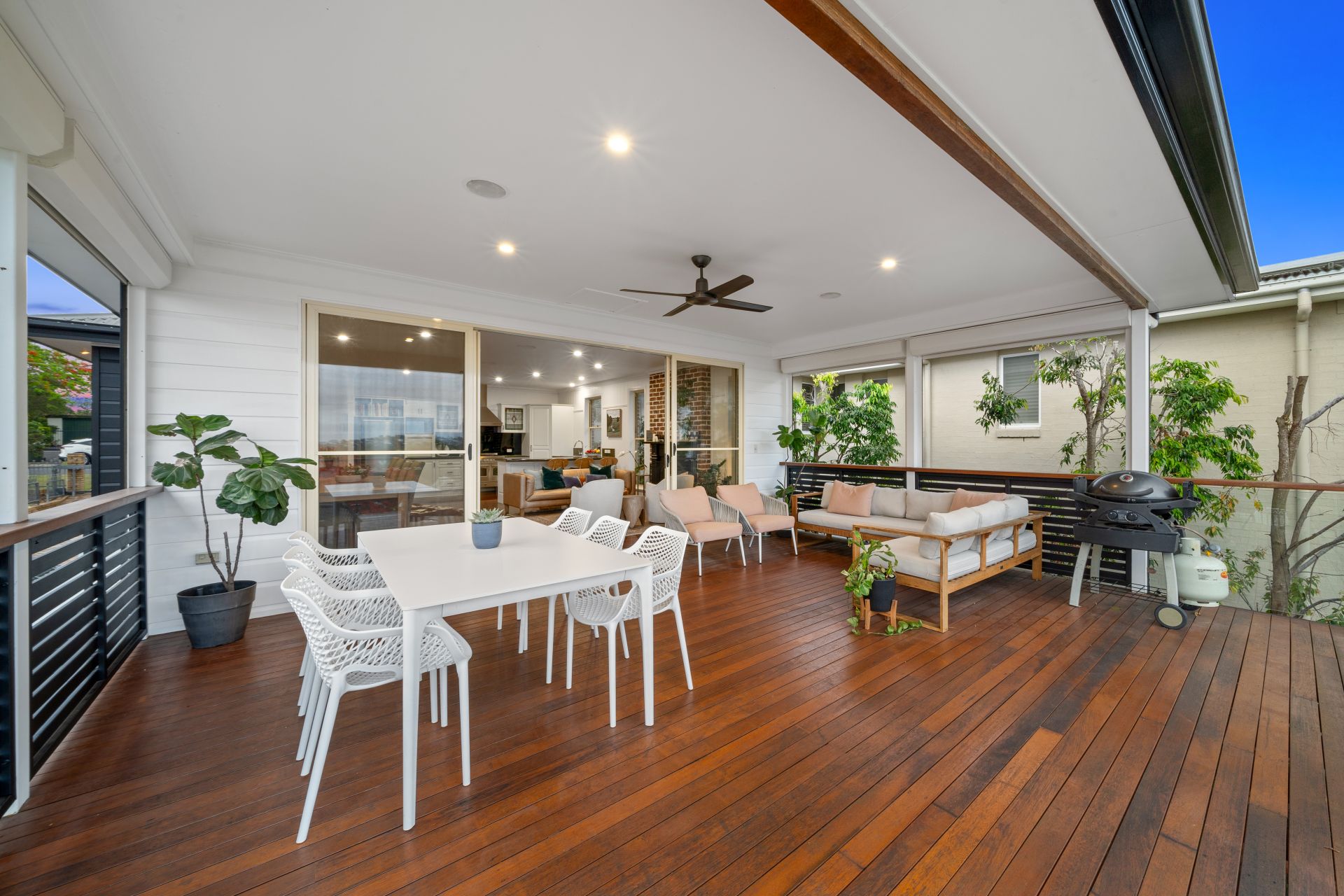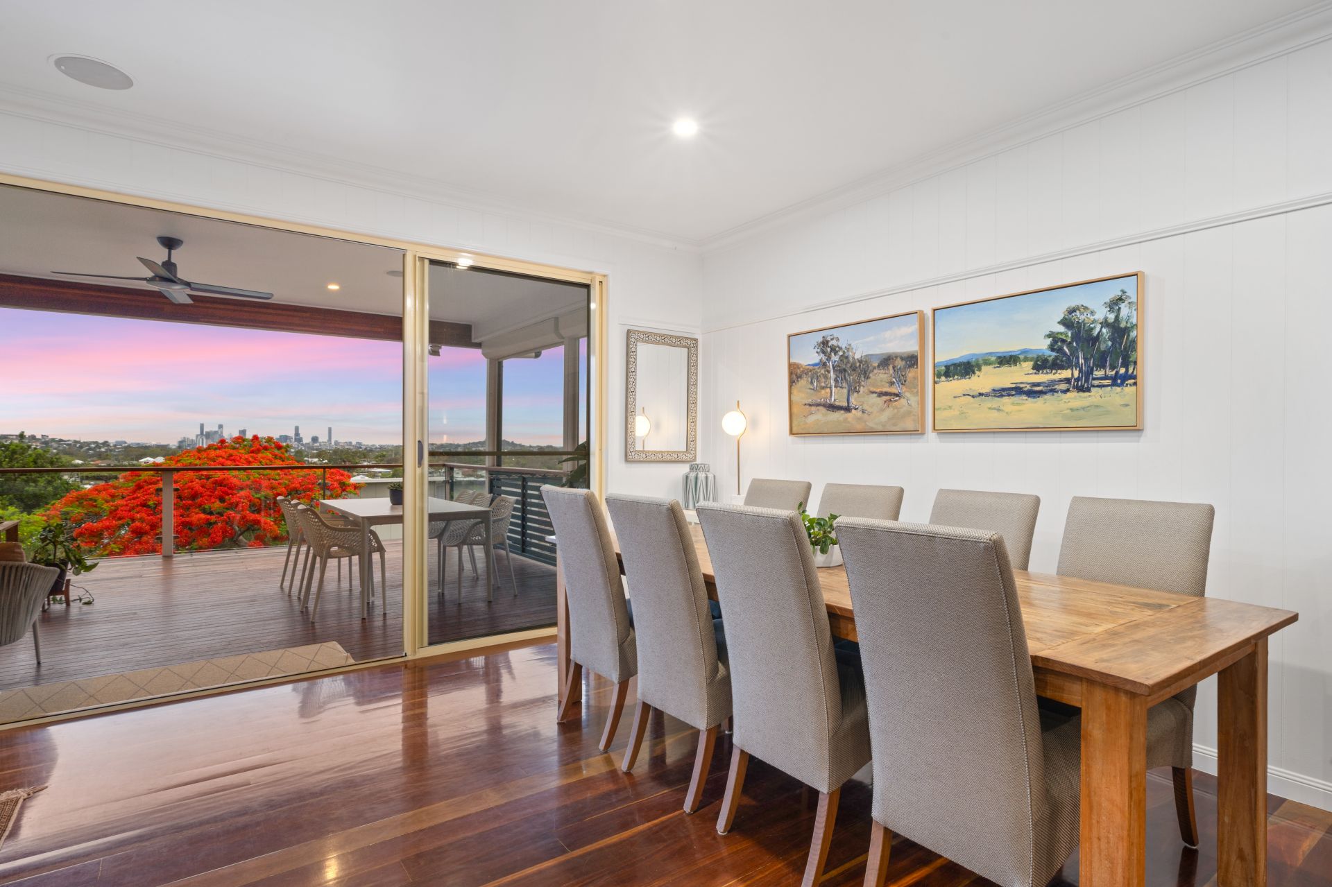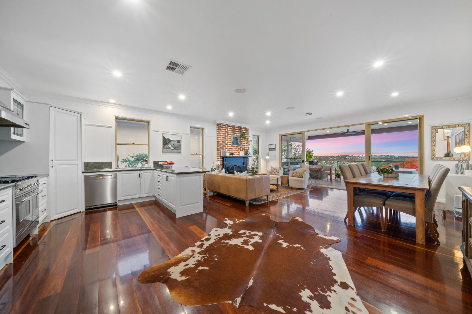 > The open plan main living/dining areas located on the top level of the home flow effortlessly to the kitchen and through to the first the outdoor entertaining areas. The light and contemporary colour scheme adds to the expansive nature of the home, featuring Panasonic ducted air-conditioning, down-lighting, rich timber flooring, VJ walls, picture railing, working fire place, large glass sliding doors and sash windows.