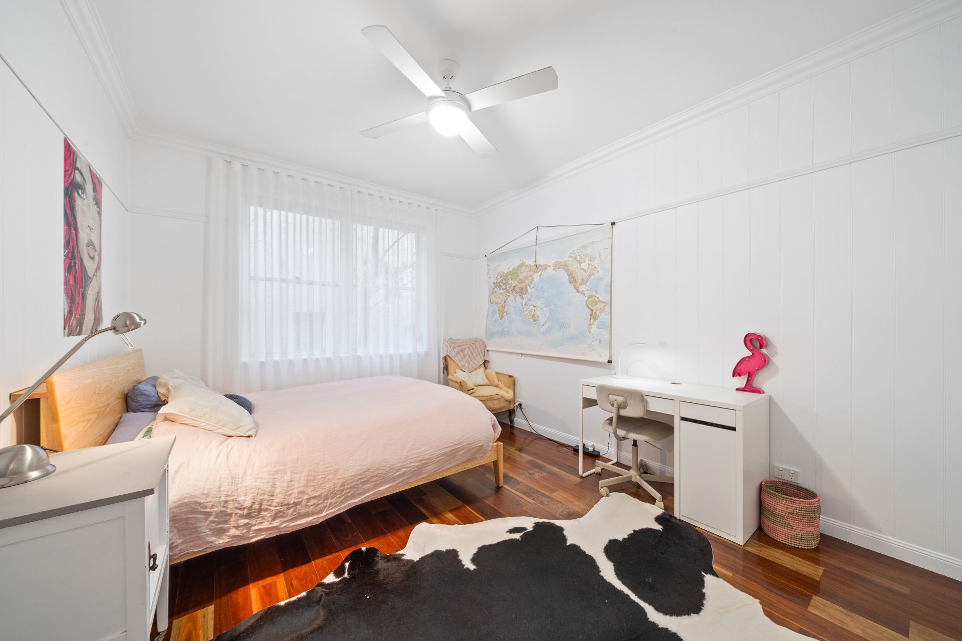 > Bedroom 3 located on the entry level features Panasonic ducted air-conditioning, extra-high ceilings, VJ walls, picture railing, rich timber flooring, ceiling fan, built-in-robe, down-lighting, sash windows and sheer curtains.