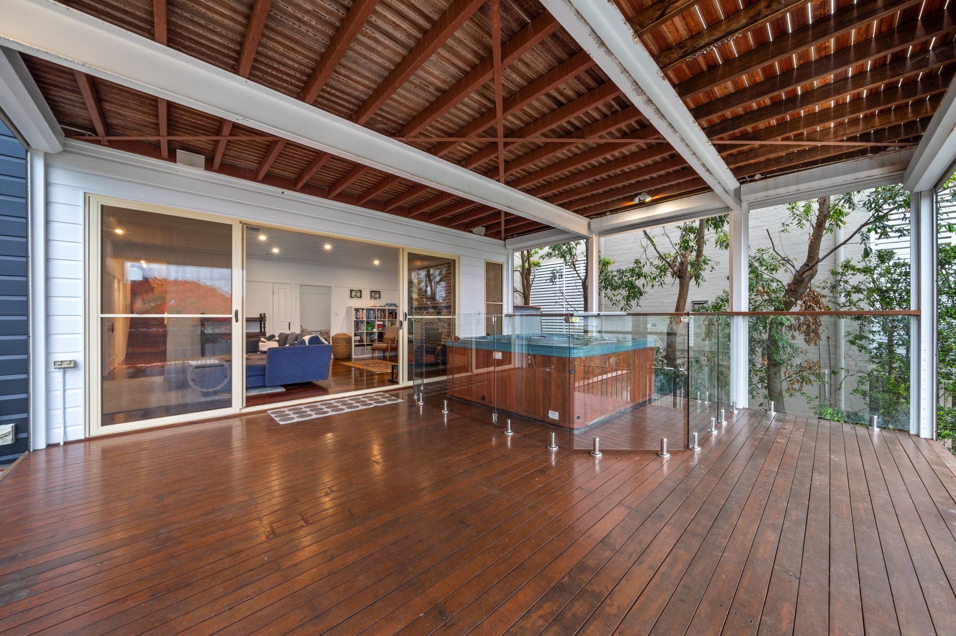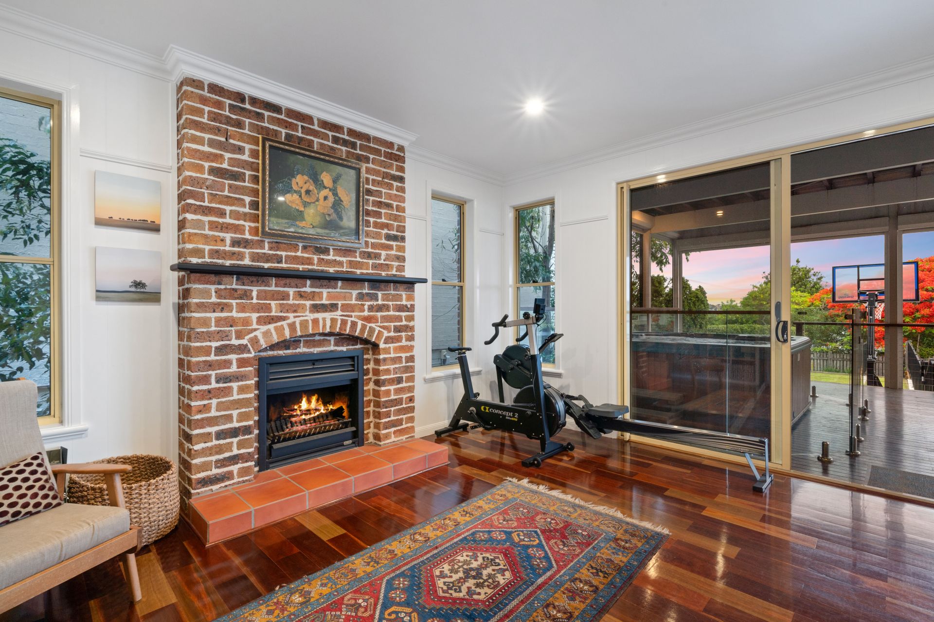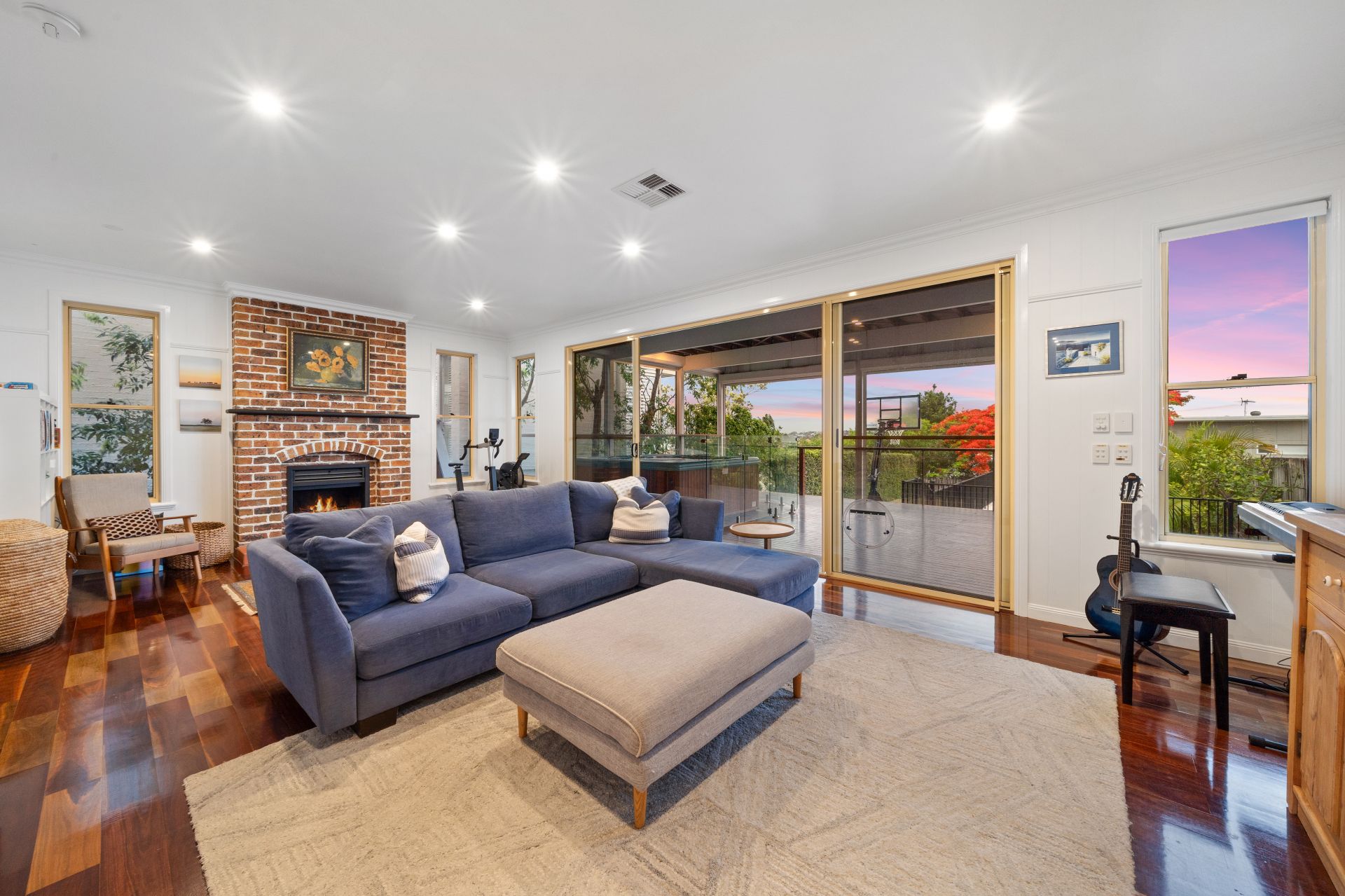 > Located on the lower level of the home is the second living room featuring Panasonic ducted air-conditioning, down-lighting, rich timber flooring, VJ walls, picture railing, working fire place, large glass sliding doors and sash windows.