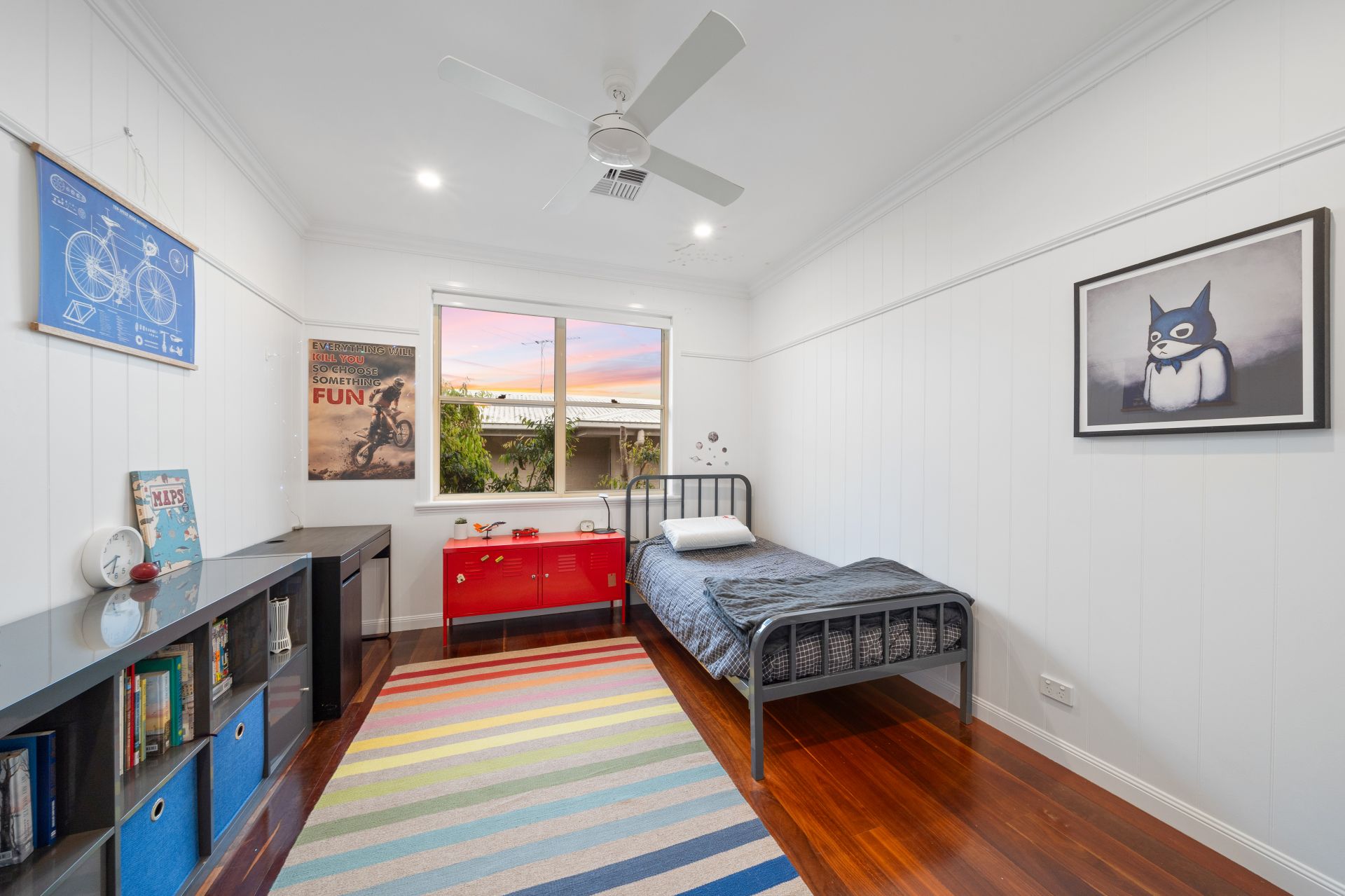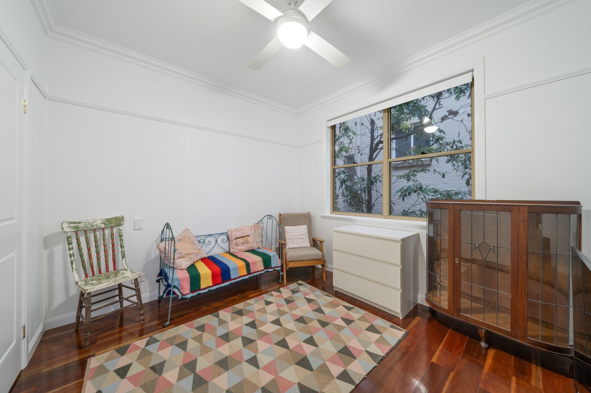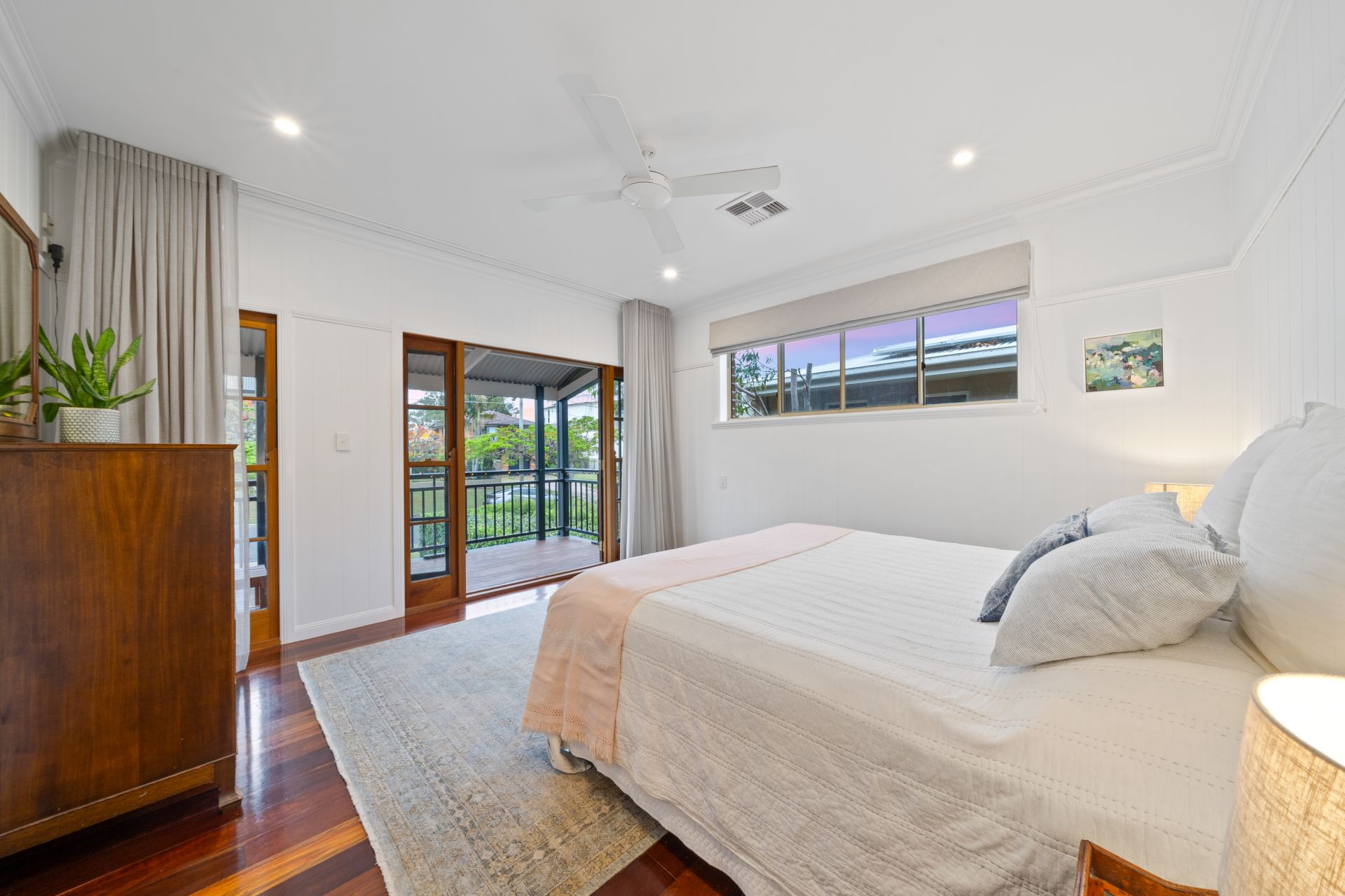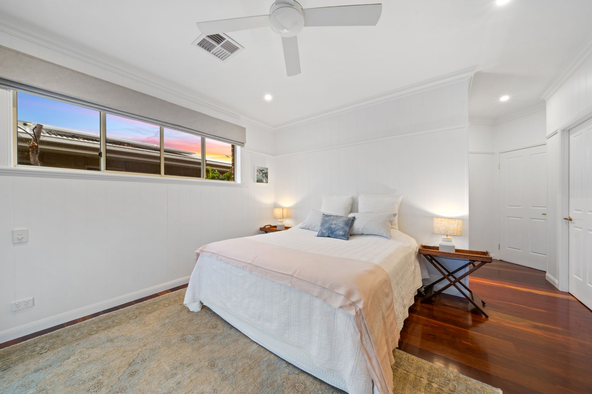 > Bedroom 4 located on the lower level features Panasonic ducted air-conditioning, extra-high ceilings, VJ walls, picture railing, rich timber flooring, ceiling fan, built-in-robe, down-lighting, sash windows and roller blind.