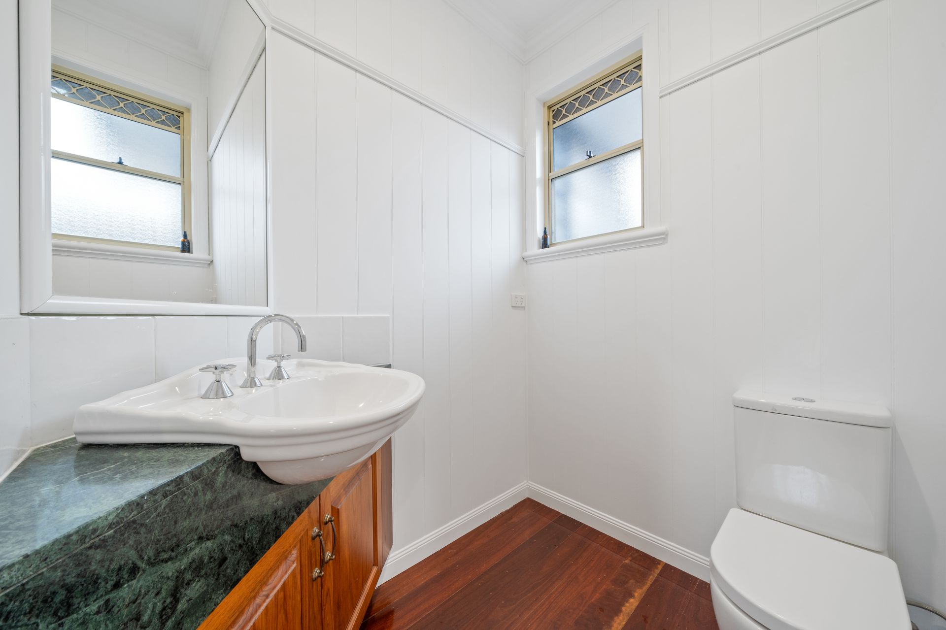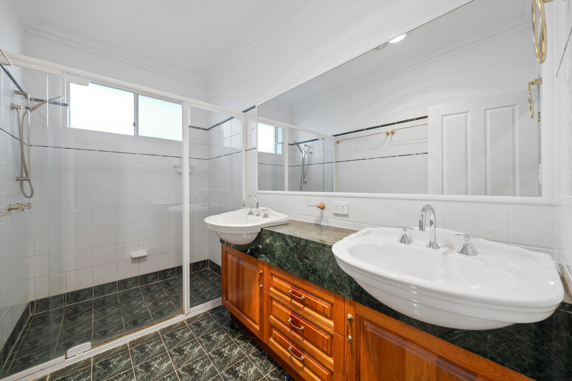 > The ensuite to the master boasts a huge shower with detachable showerhead, granite topped dual basin vanity with plenty of storage, large framed vanity mirror, quad towel racks, heat/light/extractor combo, sliding window and separate powder room.