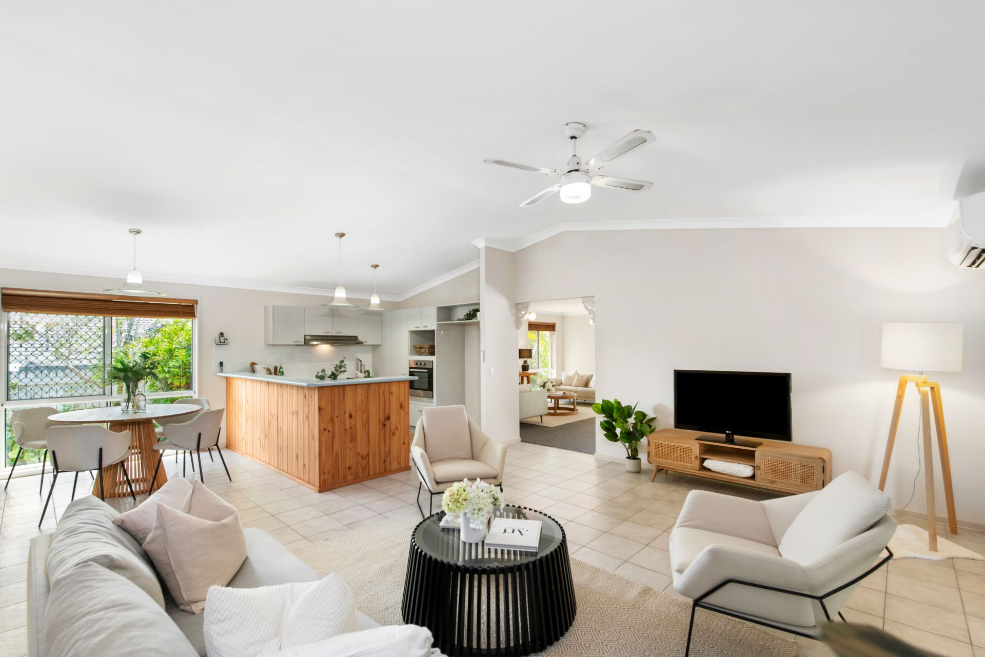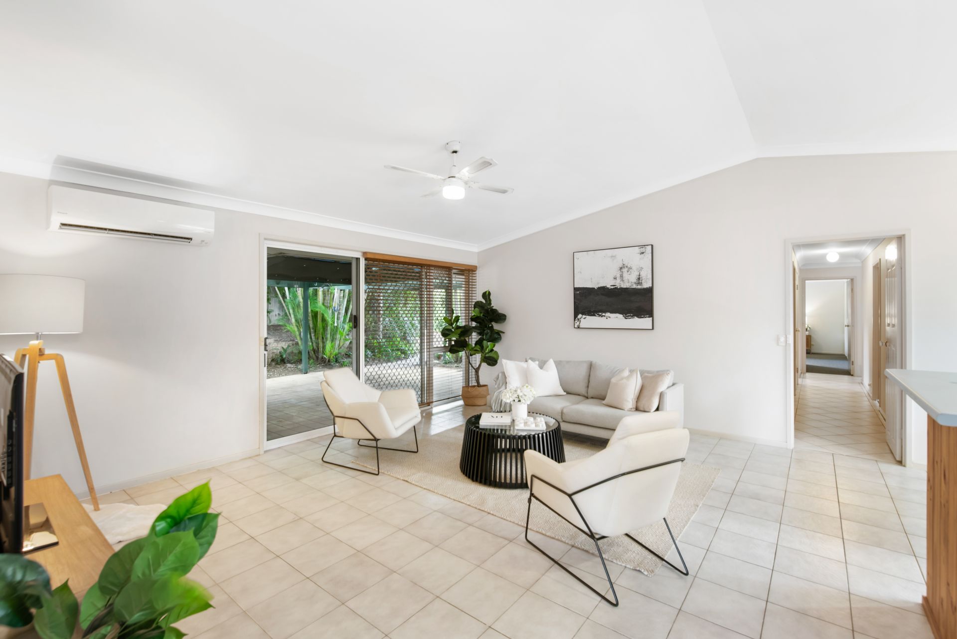 > Family room shares an open plan living space with the home's kitchen and dining room, featuring tiled flooring, 3m high Cathedral ceiling, split system air-conditioning, ceiling fans and access to the covered entertaining deck and back yard.