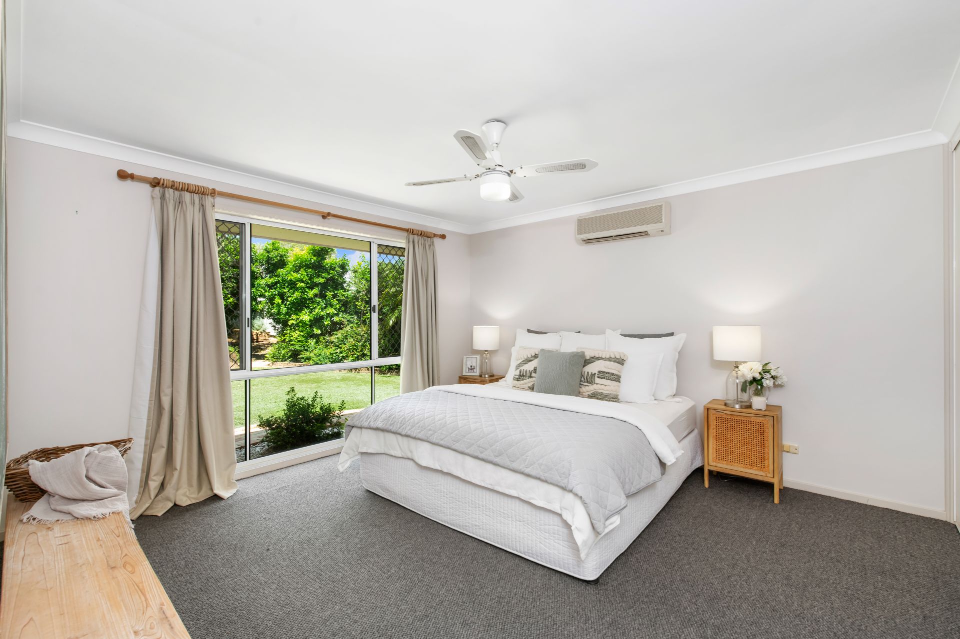 > Bedroom one is the home's large Master bedroom and features freshly carpeted flooring, ensuite, walk-thru-robe with safe, split system air-conditioning, ceiling fan and curtains.