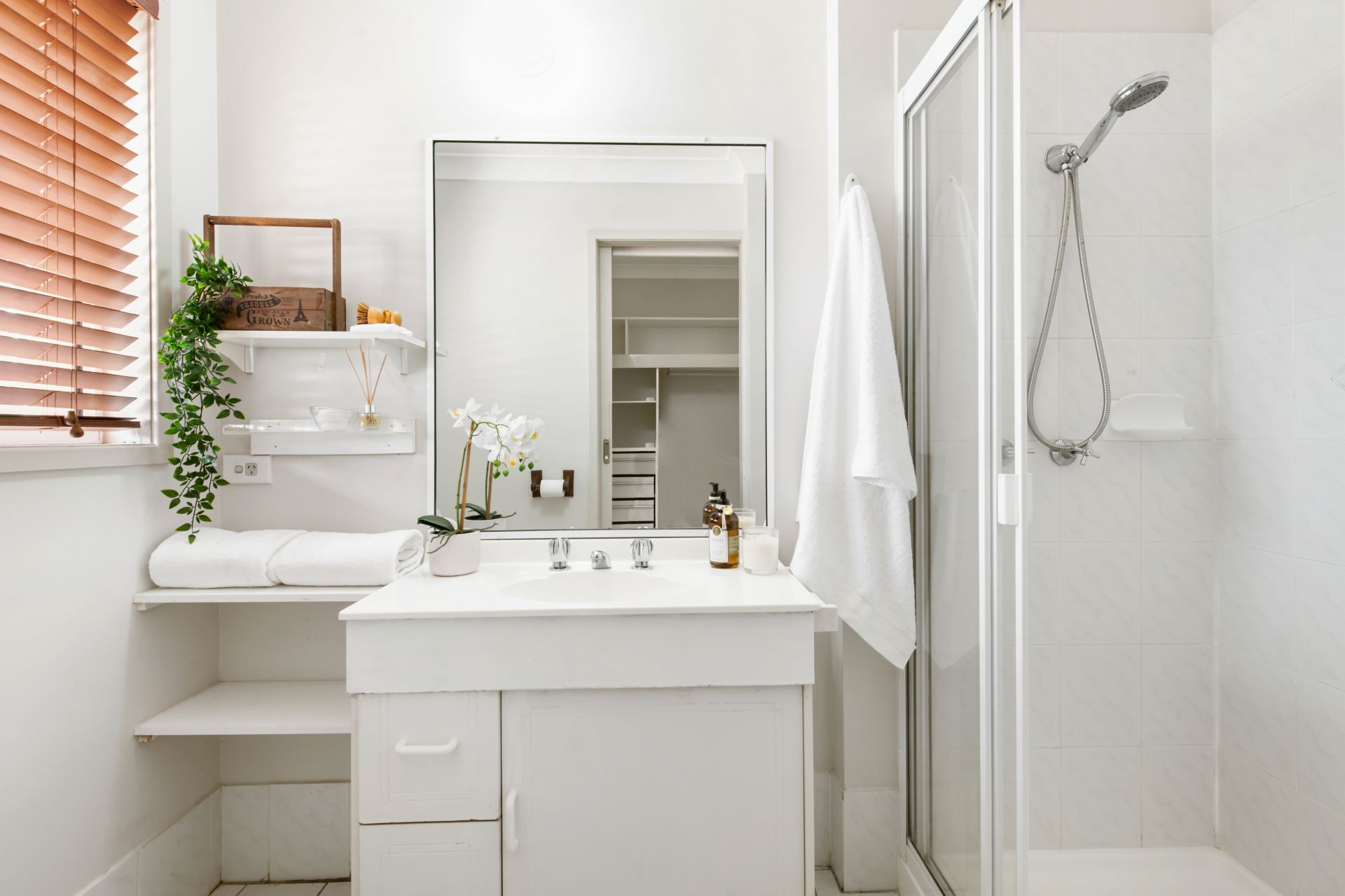 > Bathroom two is the ensuite to the master bedroom and features tiled flooring, oversized shower, single vanity, and toilet.