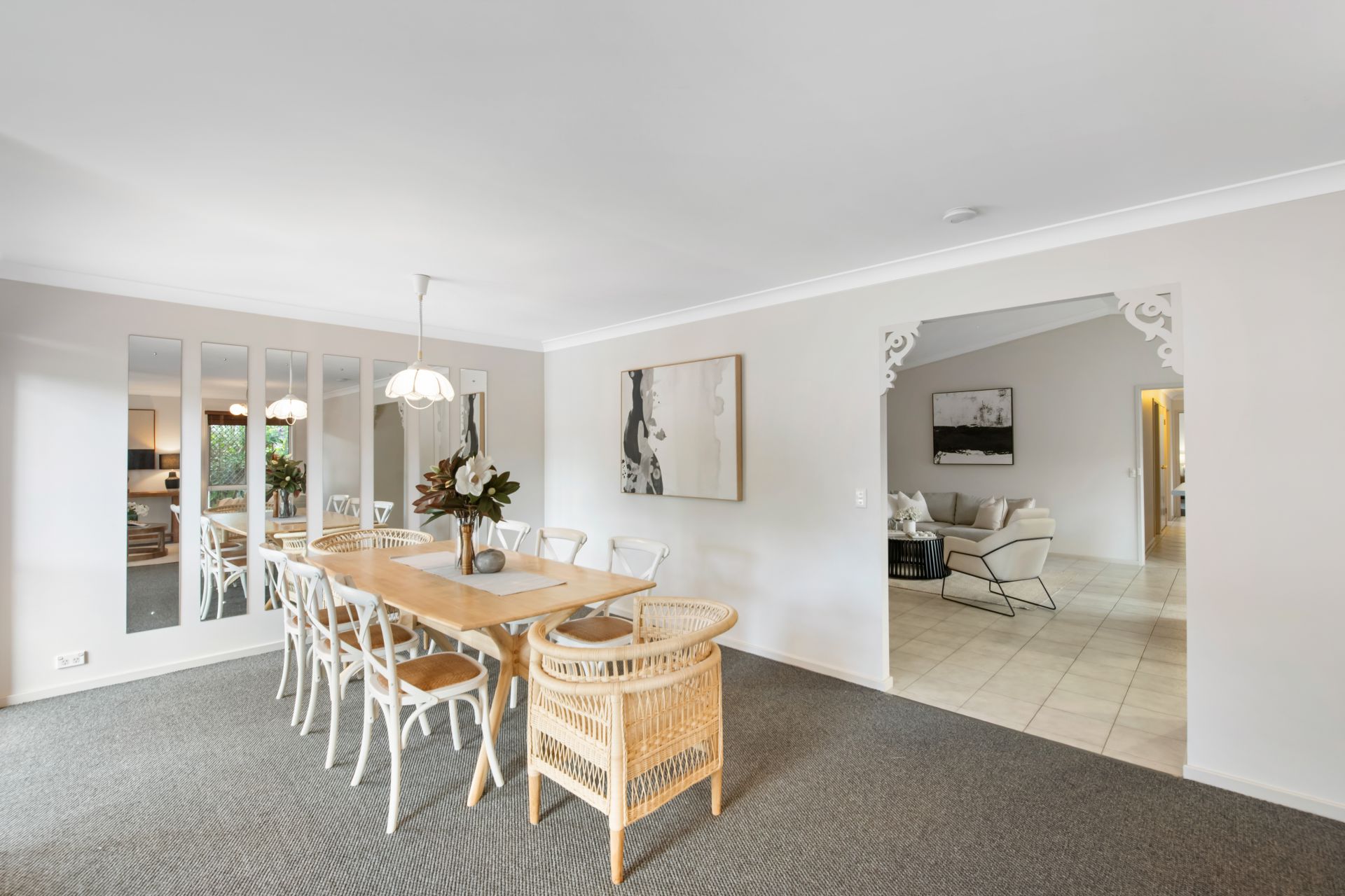 > Formal lounge and dining room share a large, light-filled space at the front of the home featuring carpeted flooring and blinds.