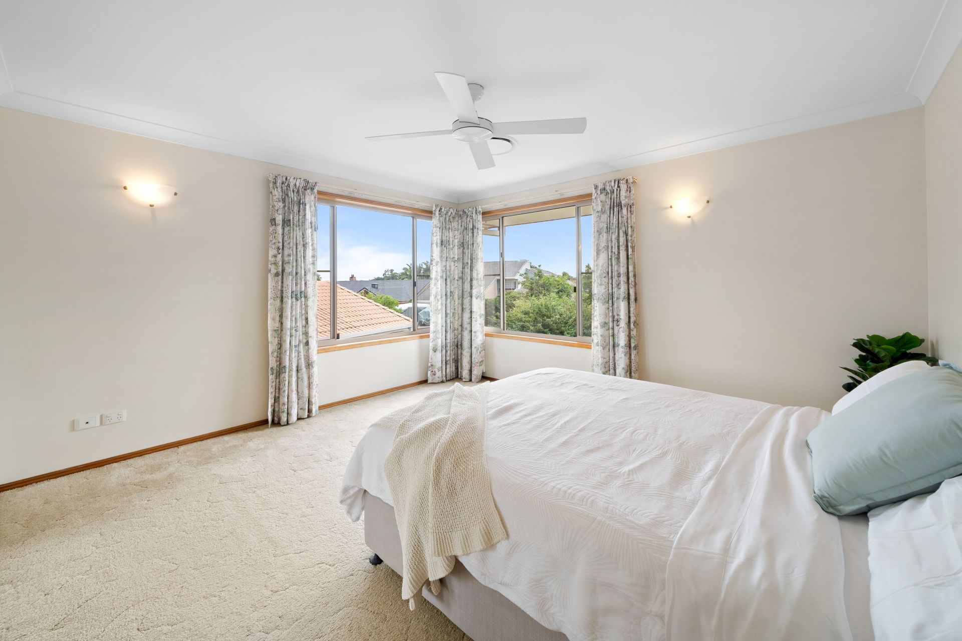 > Bedroom five is located on the lower level and features ducted air-conditioning, a ceiling fan with lighting, carpet flooring, a built-in robe, sliding windows with curtains.