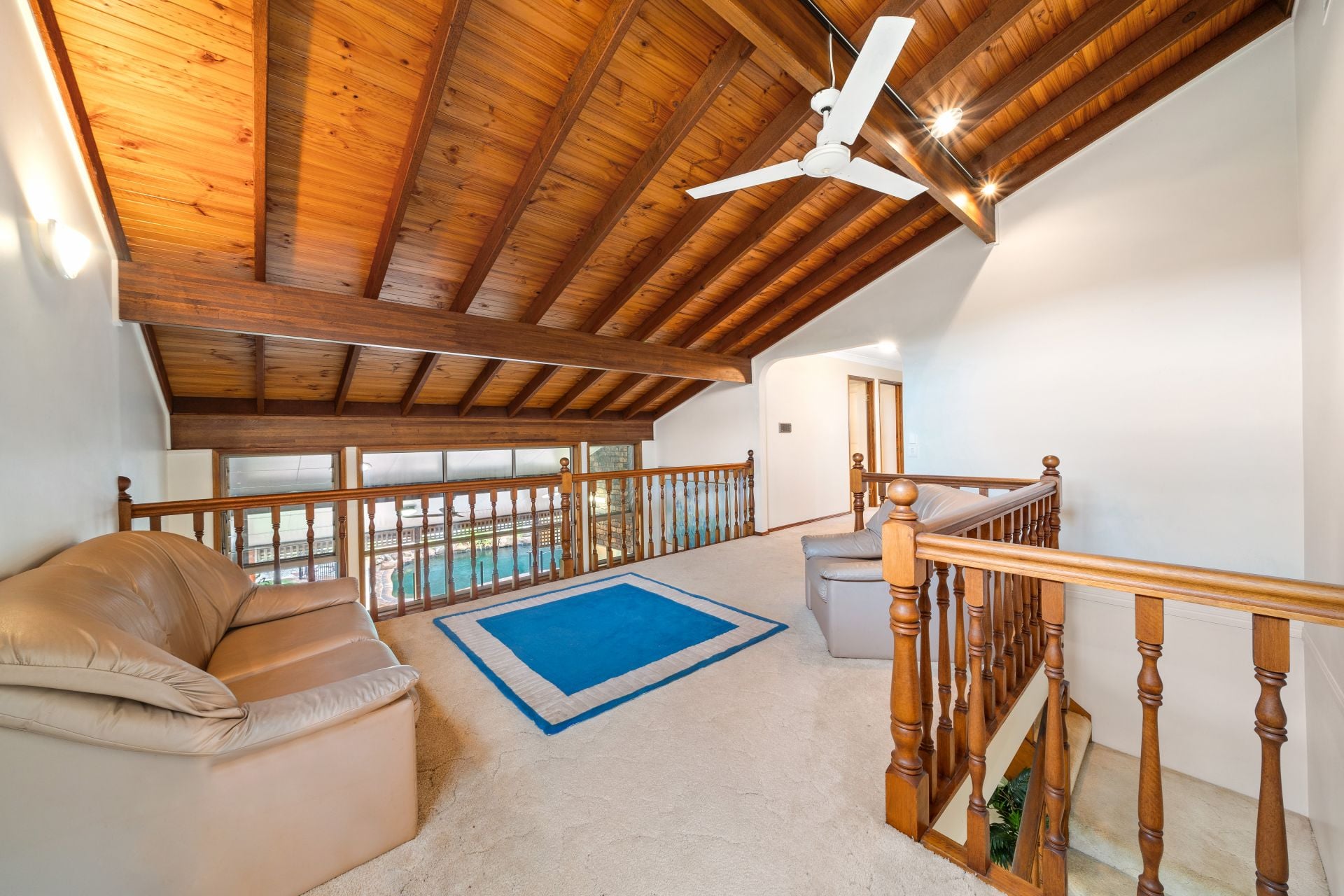 > Located on the top-level is the retreat featuring 3.6m raked ceiling, ducted air-conditioning, a ceiling fan, sliding windows, a combination of scone and gallery lighting.