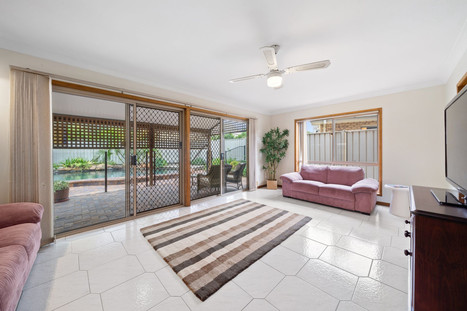 > Located at the rear of the property is the living room featuring tiled flooring, ceiling fan with lighting, sconce lighting, a built-in wet bar, sliding windows, glass sliding doors giving you access to the outdoor entertaining and pool.