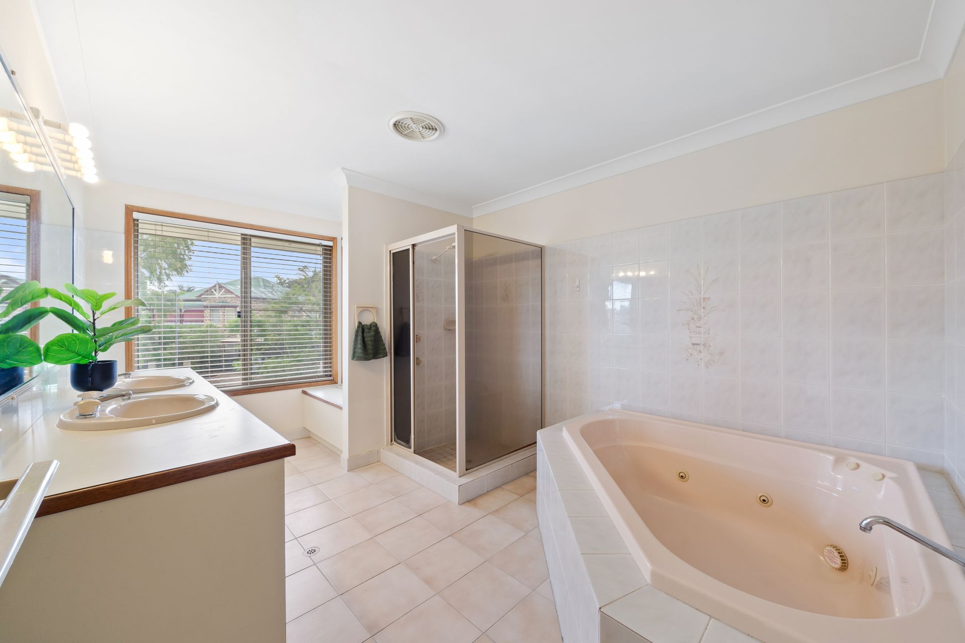 > The ensuite to the master features shower, separate spa bath configuration, double basin vanity with plenty of storage, a towel rack, a large vanity mirror, an extractor fan, Hollywood lighting and a toilet.