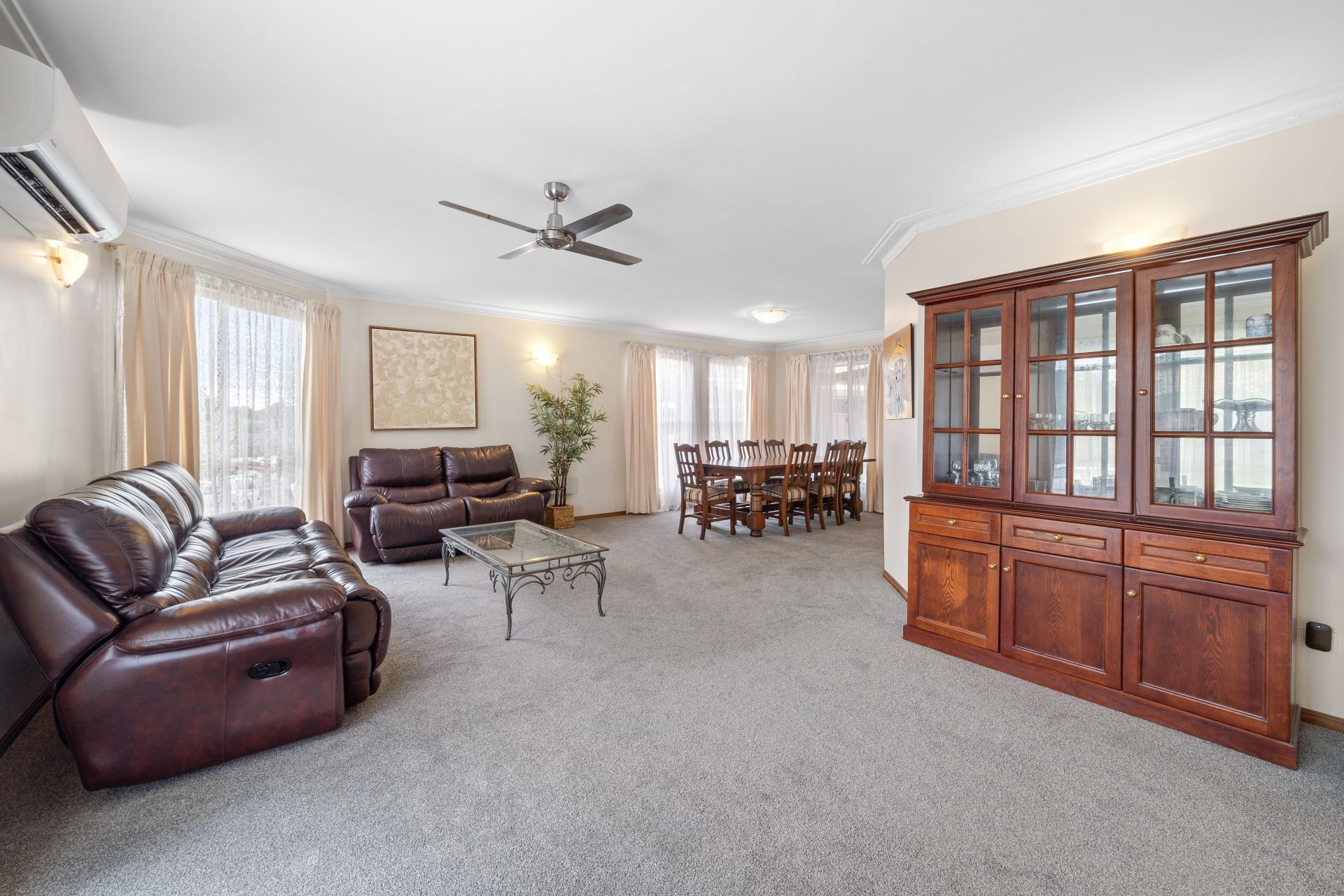 > Located at the front of the property is the lounge room, featuring carpet flooring, Daikin air-conditioning, oyster as well as scone lighting, sliding windows with solid and sheer curtains.