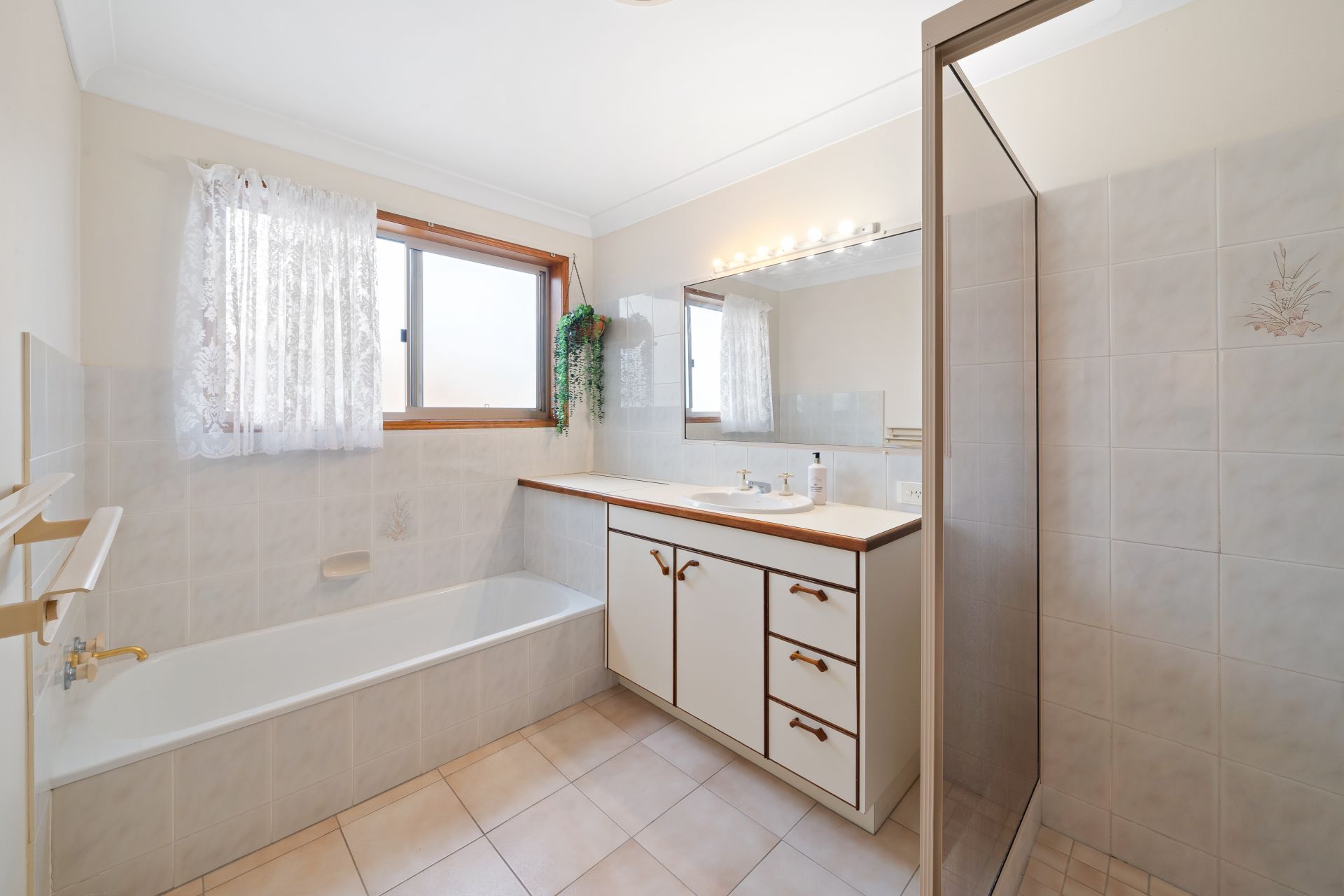 > The main bathroom, located on the top-level, features a shower, separate bath configuration, single basin vanity with plenty of storage, a towel rack, a large vanity mirror, an extractor fan, Hollywood lighting and separate a toilet.