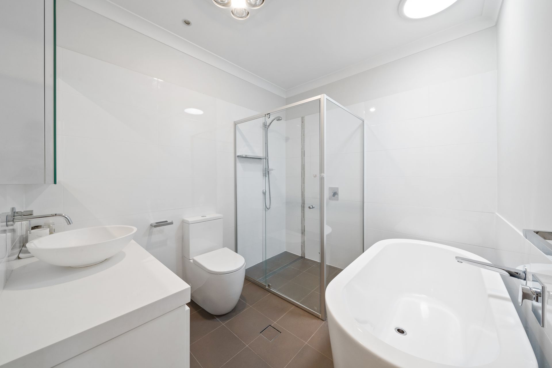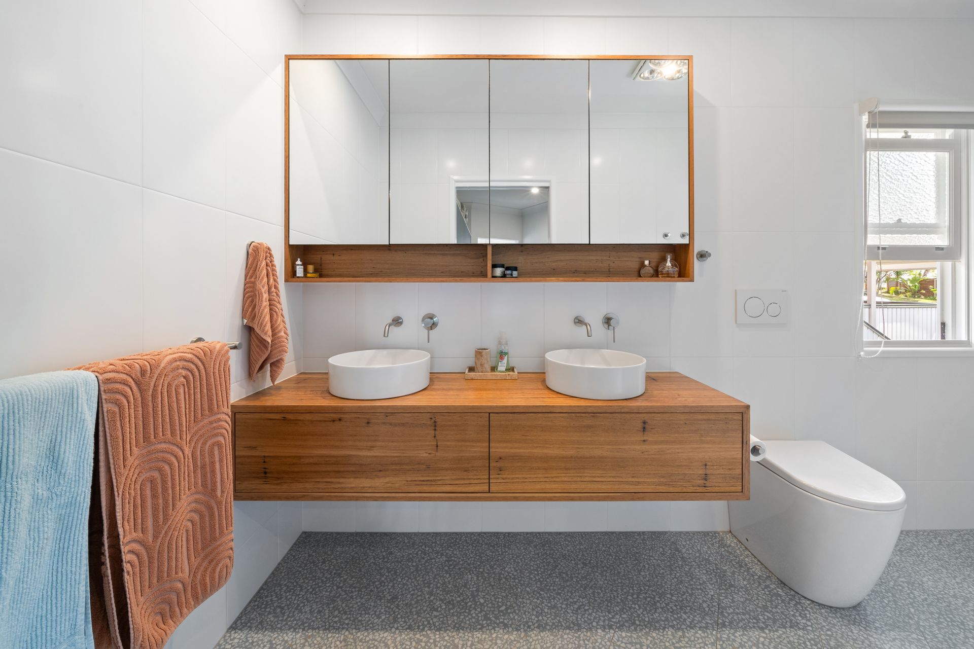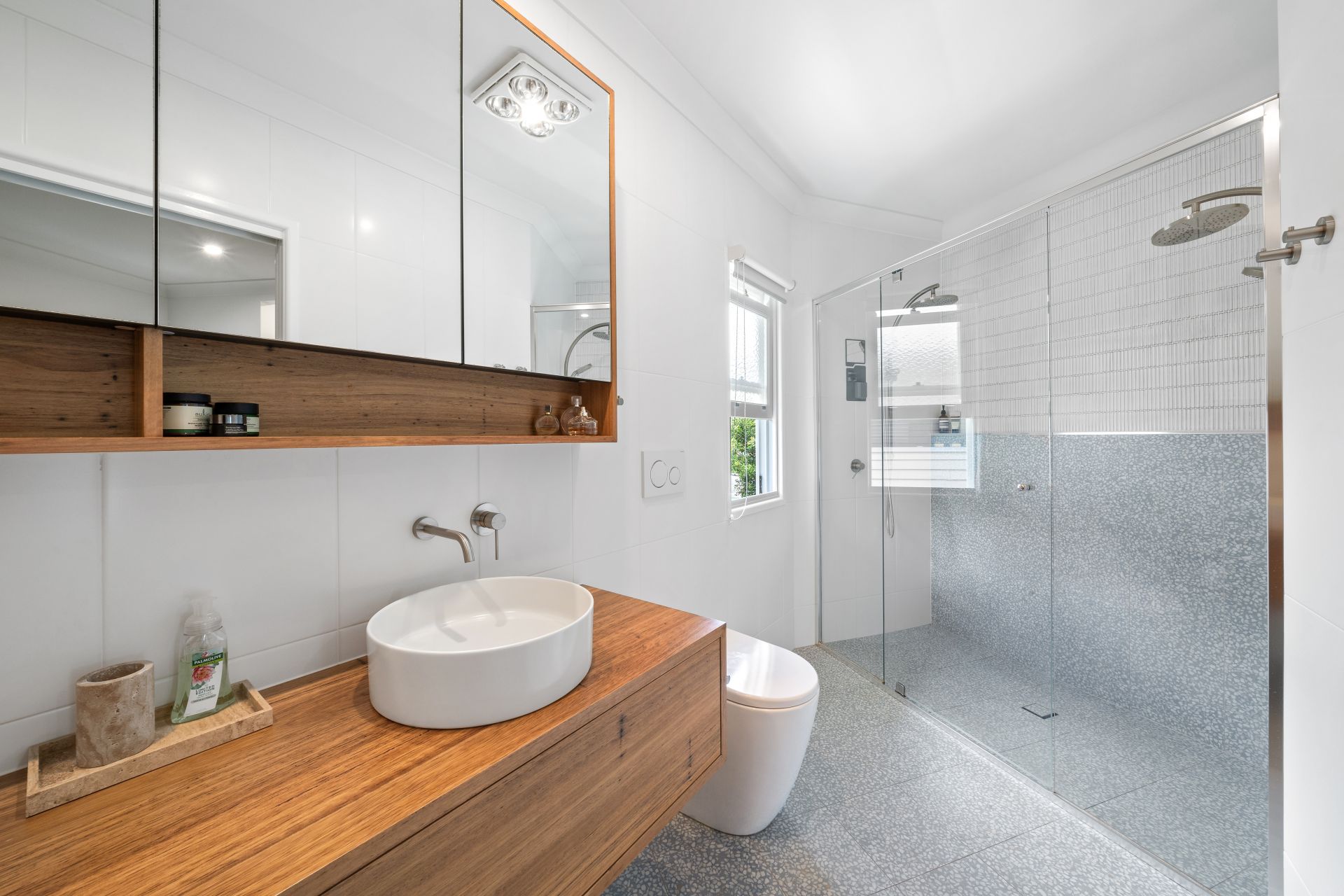 > The main bathroom features a vessel basin vanity with stone benchtop and storage, a mirrored cabinet, downlighting, a combination ceiling heat/light/fan, a skylight, a shower with a detachable showerhead, a separate bath and a toilet.