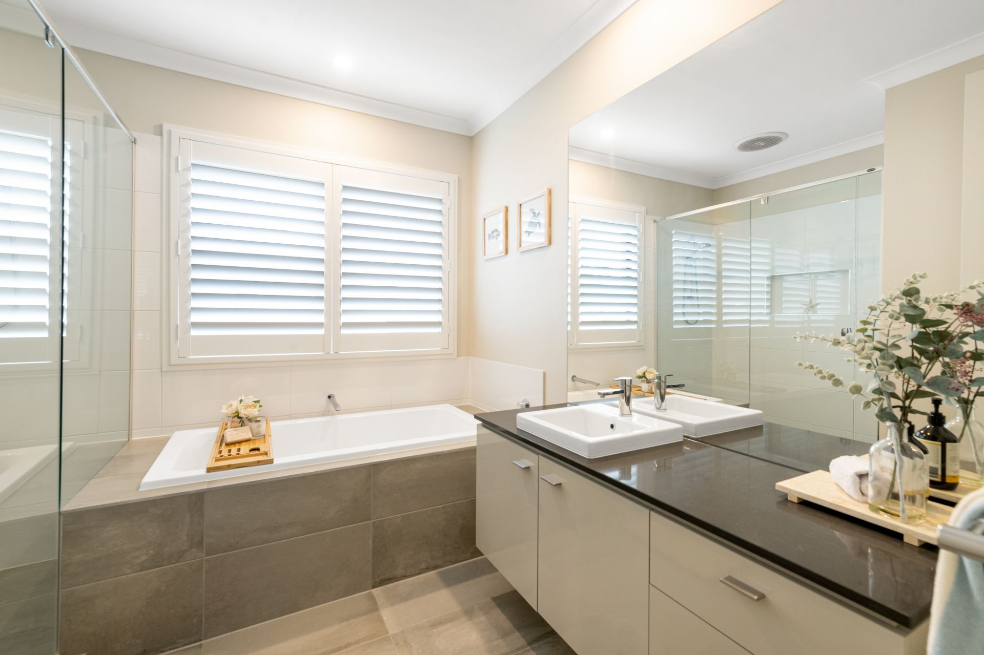 > Bathroom one is the home's main bathroom featuring tiled flooring, oversized shower, separate deep-soaker bath, single vanity with stone benchtops and soft-close cabinetry, plantation shutters and separate toilet.