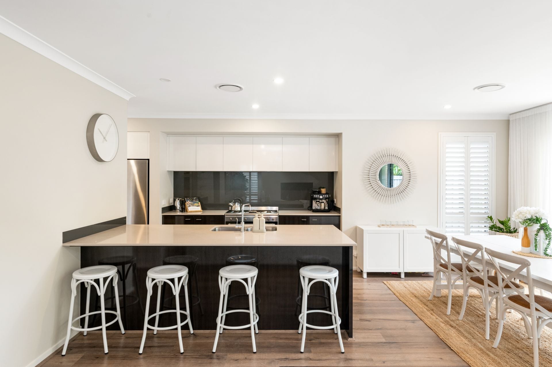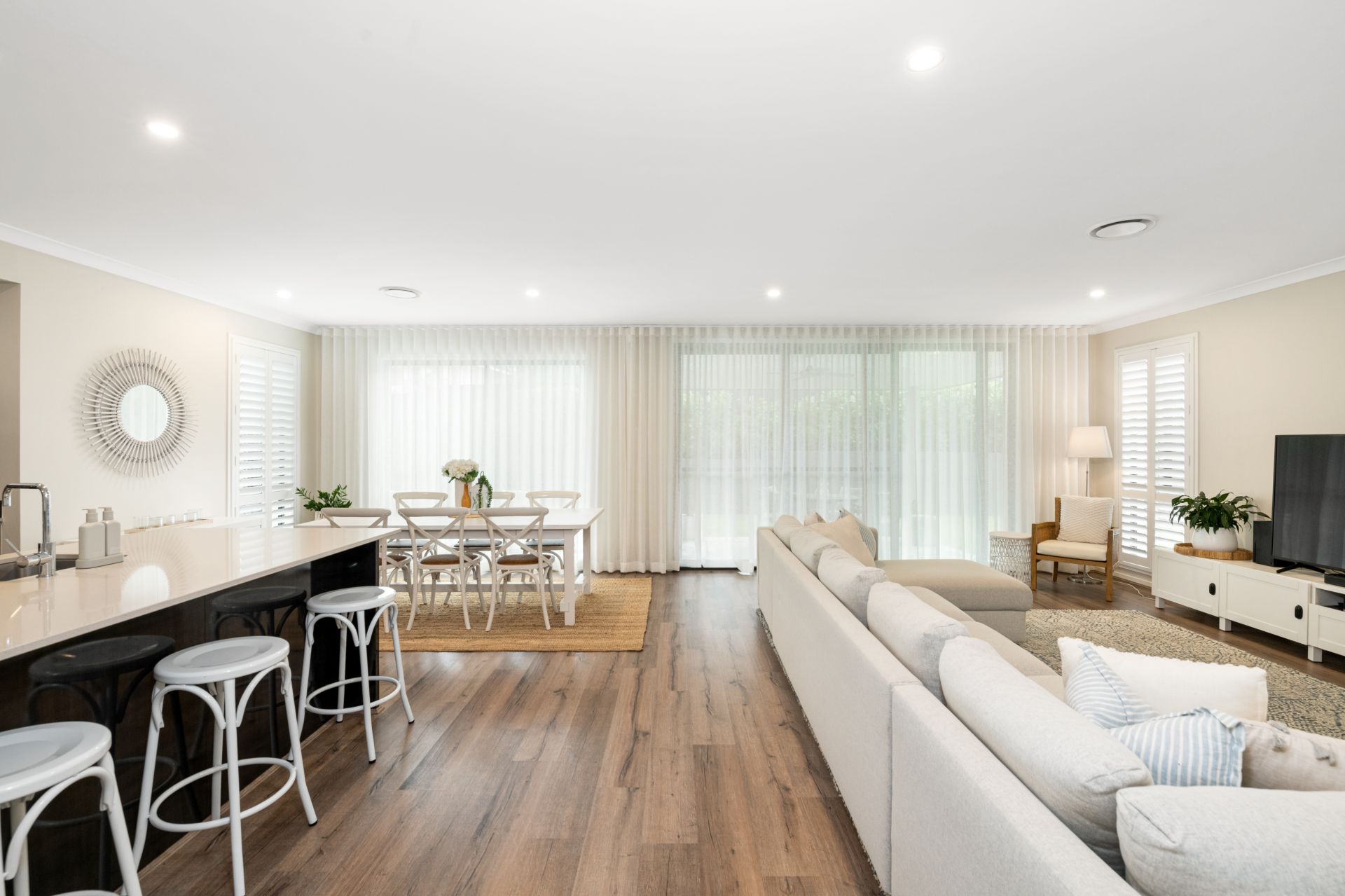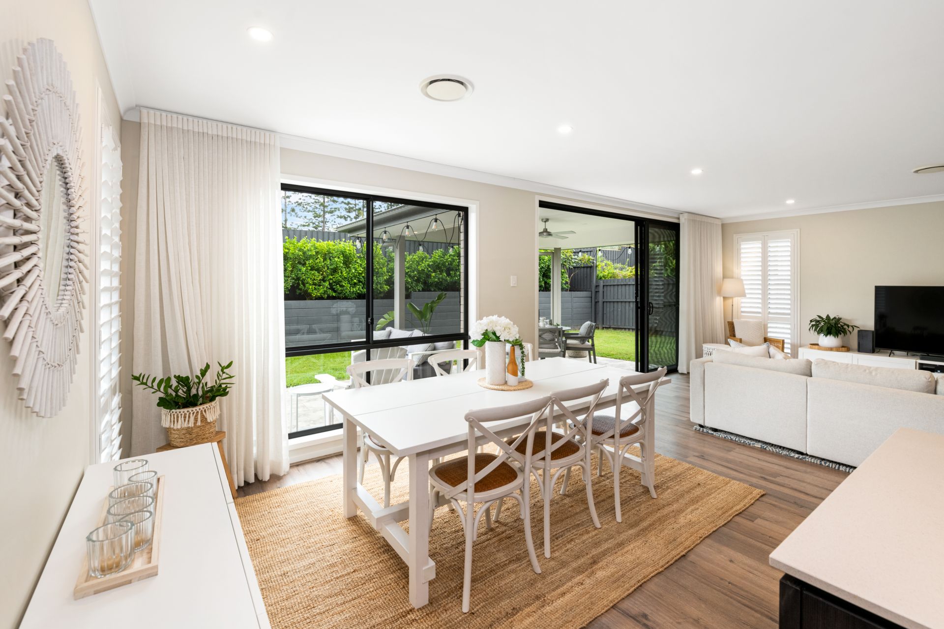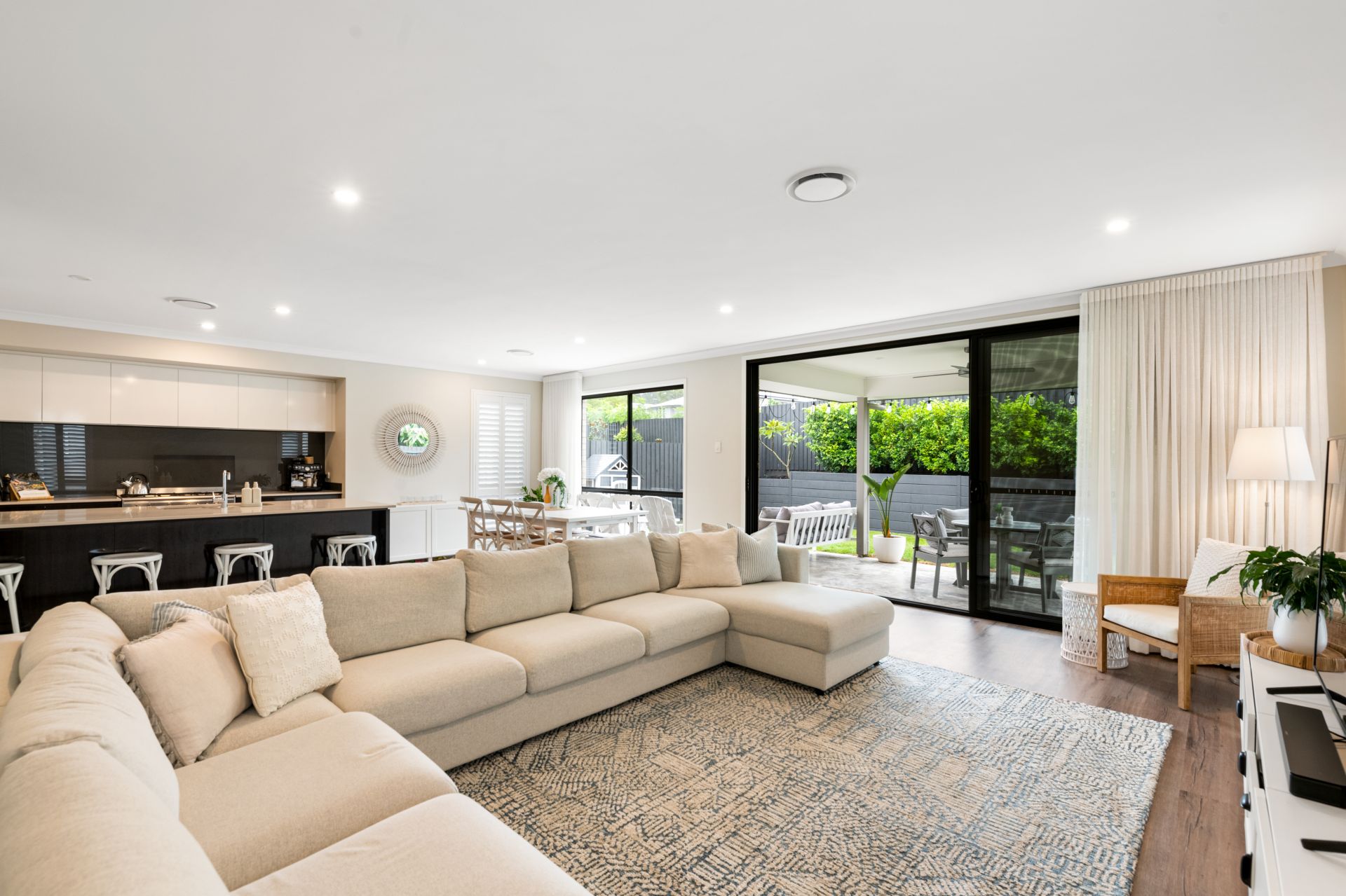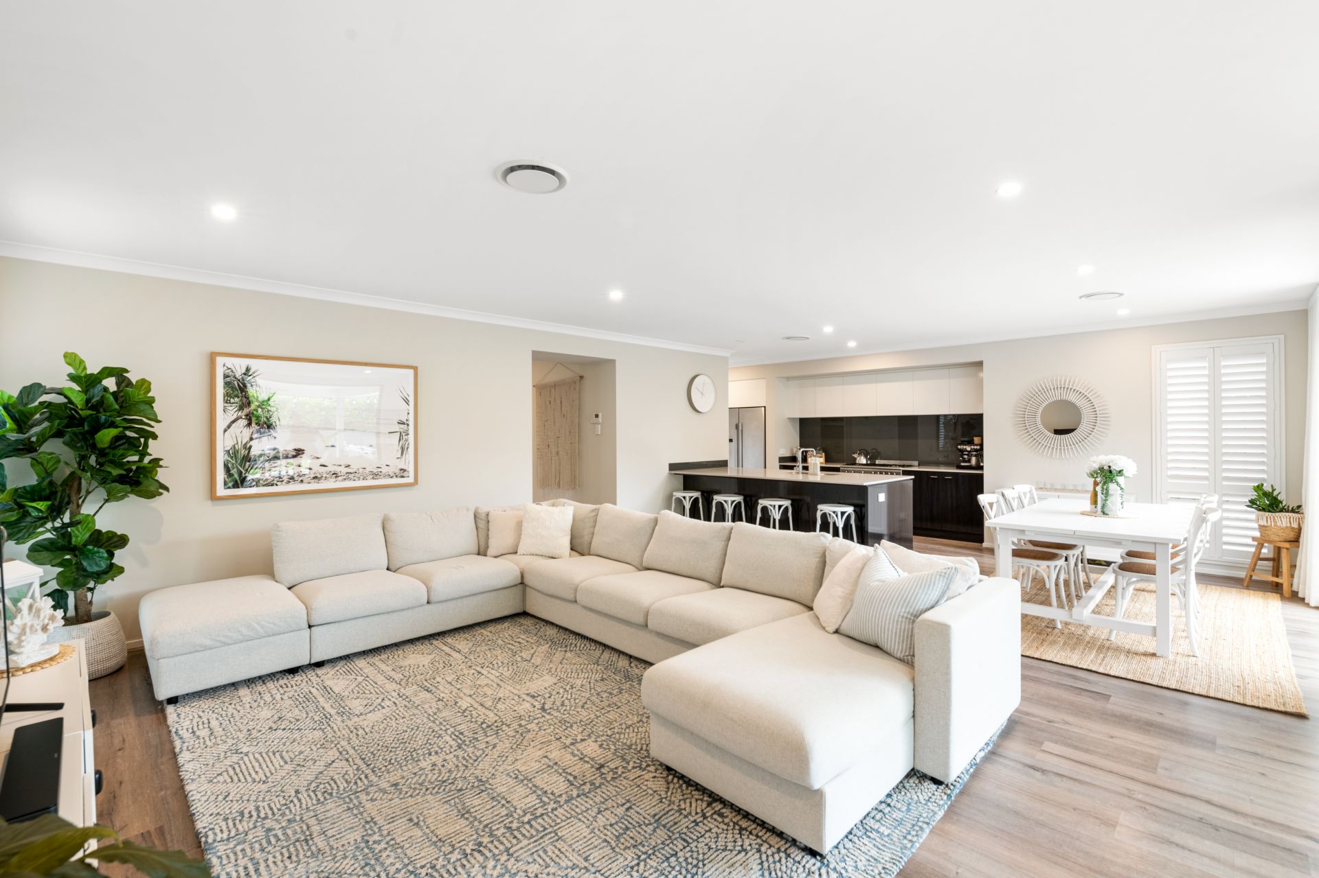 > Living and dining rooms occupy a large, shared space downstairs with the home's kitchen and features timber flooring, ducted air-conditioning, plantation shutters and large stacker doors leading to the covered outdoor entertaining area bringing together a fusion of indoor & outdoor living.