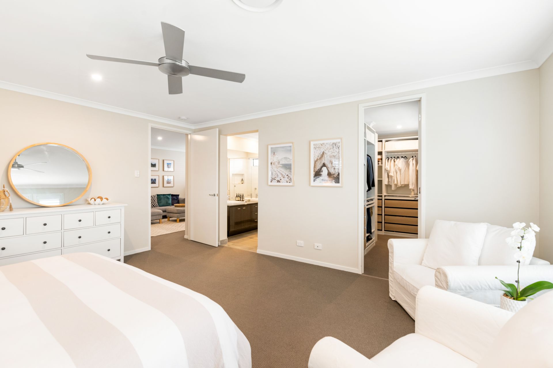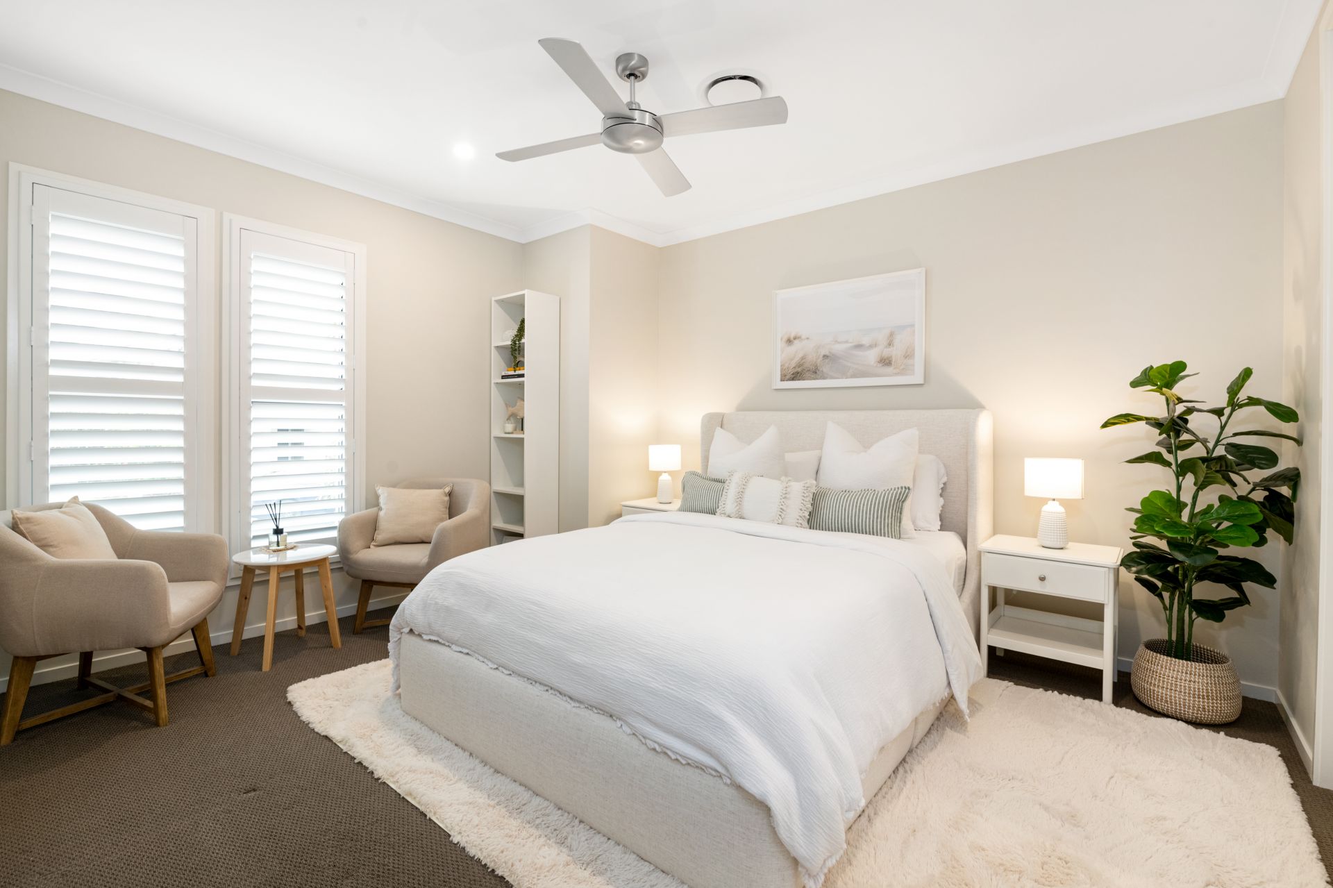 > Bedroom one is the home's stunning Master bedroom featuring carpeted flooring, ensuite, ceiling fan, custom walk-in-robe with built-in soft-close cabinetry and plantation shutters.