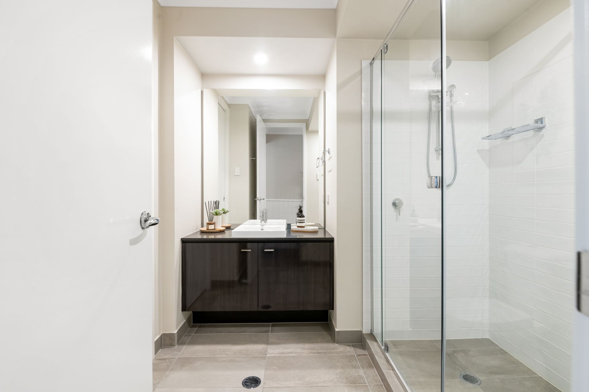 > Bathroom three is a 2-way bathroom, conveniently linked to the downstairs bedroom and features tiled flooring, shower, single vanity with stone benchtop and toilet.