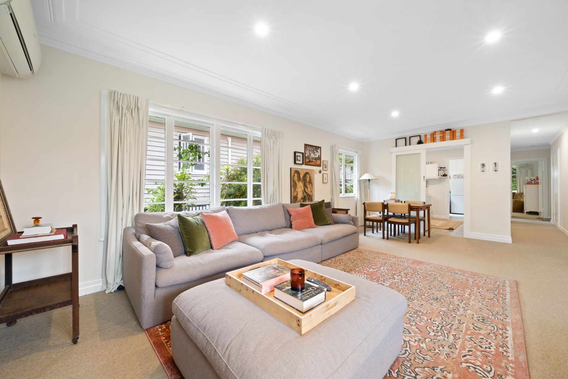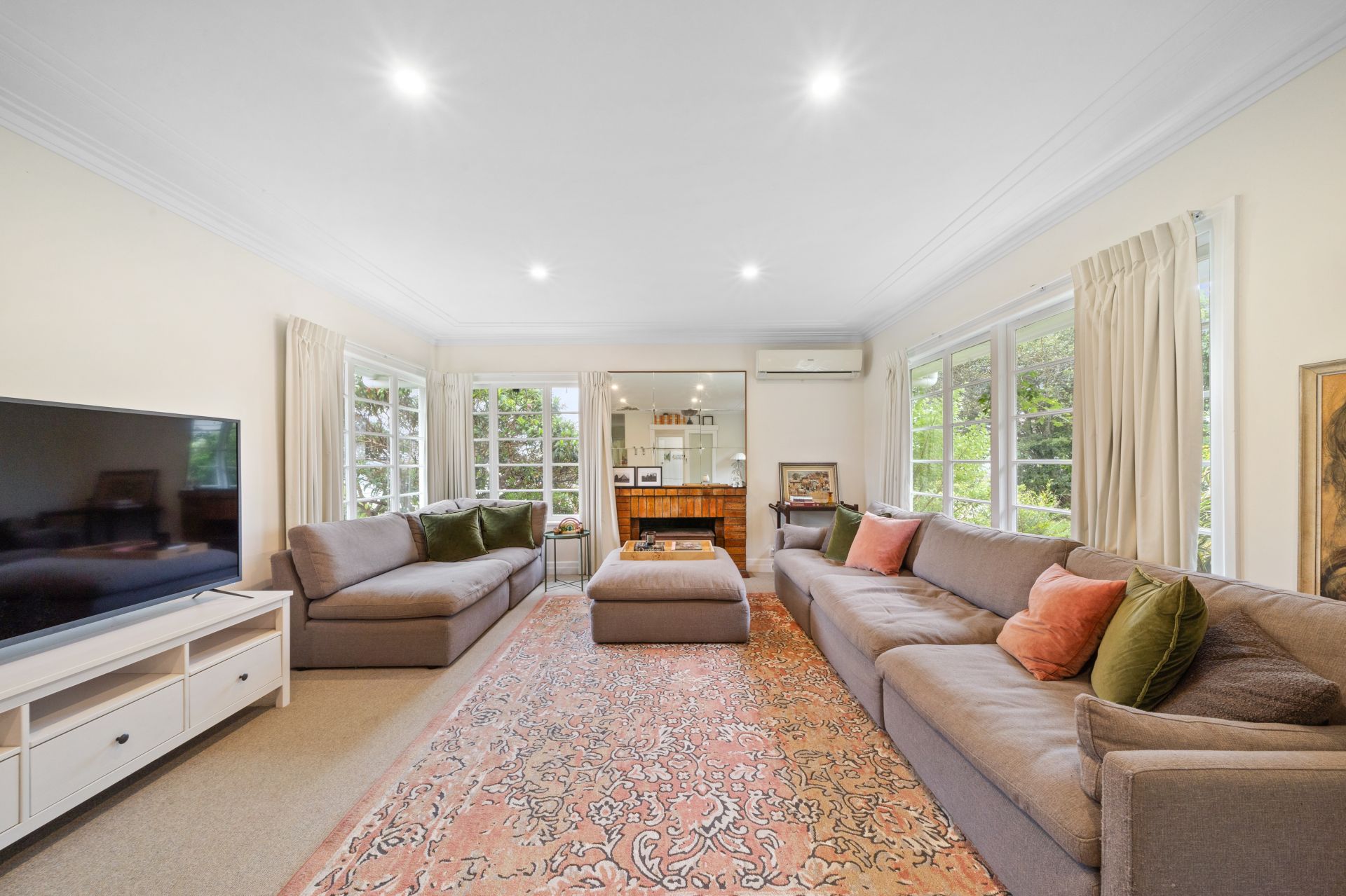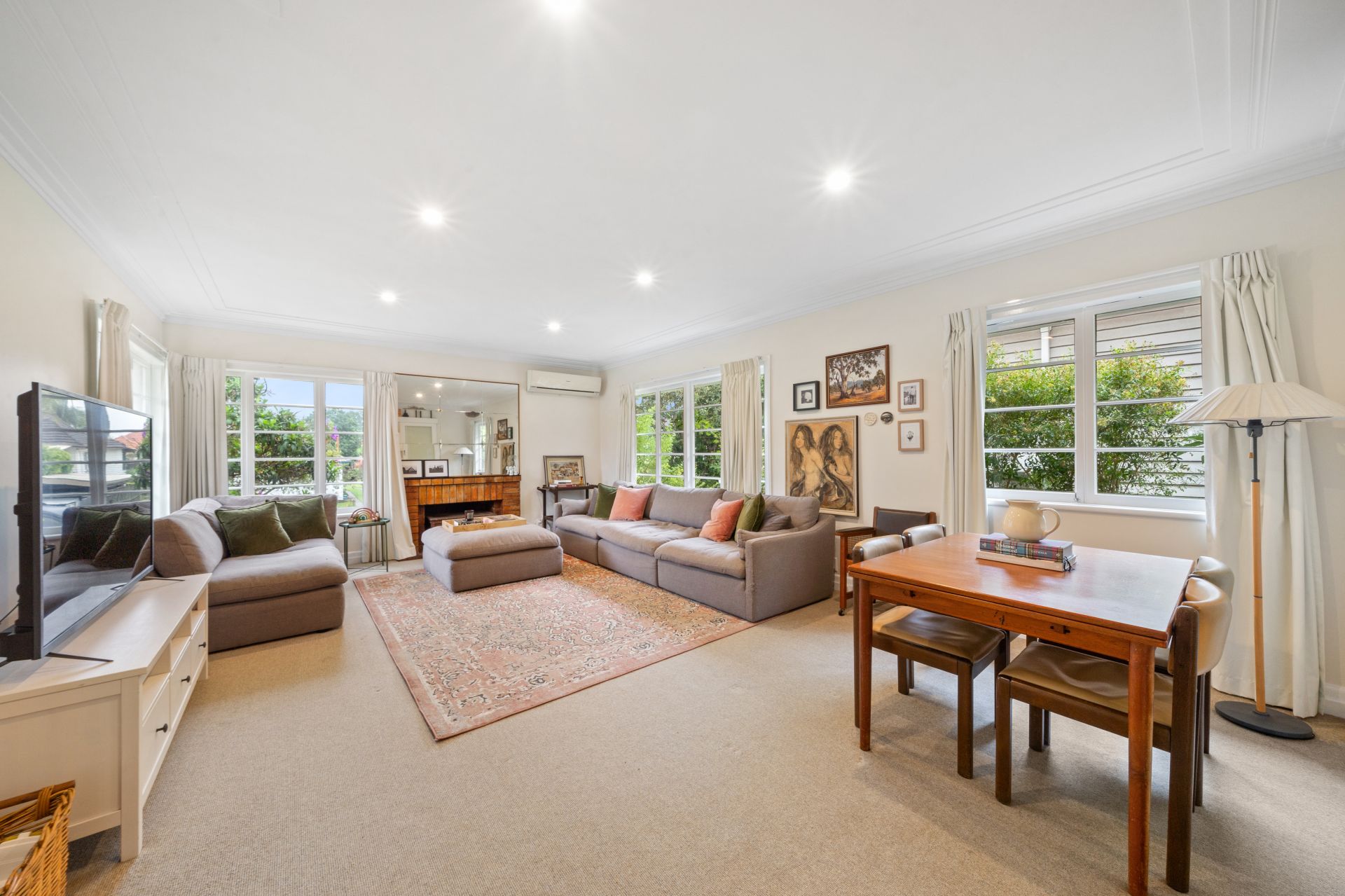 > The spacious living/dining room boasts a brick fireplace and split-system air conditioner ensuring comfort throughout the year. Enjoy the light-filled ambiance complemented by casement windows, ornate cornicing, curtains, and plush carpet flooring.