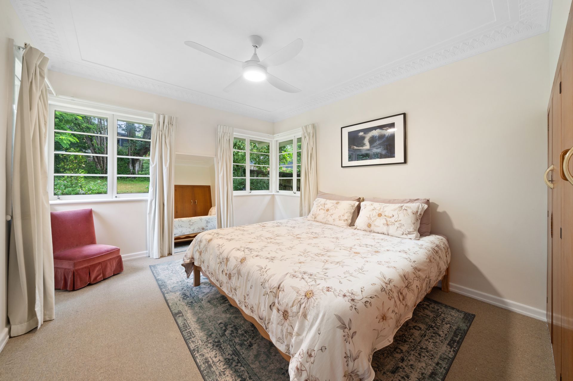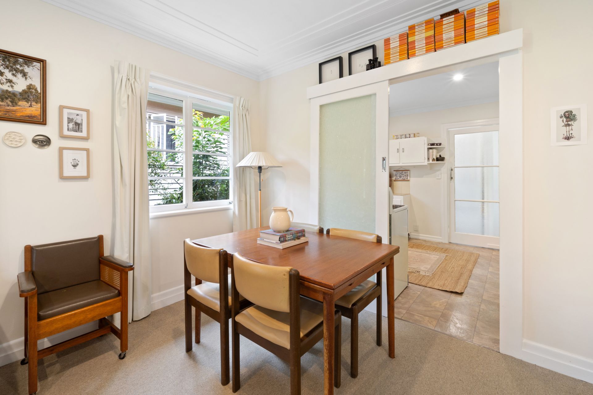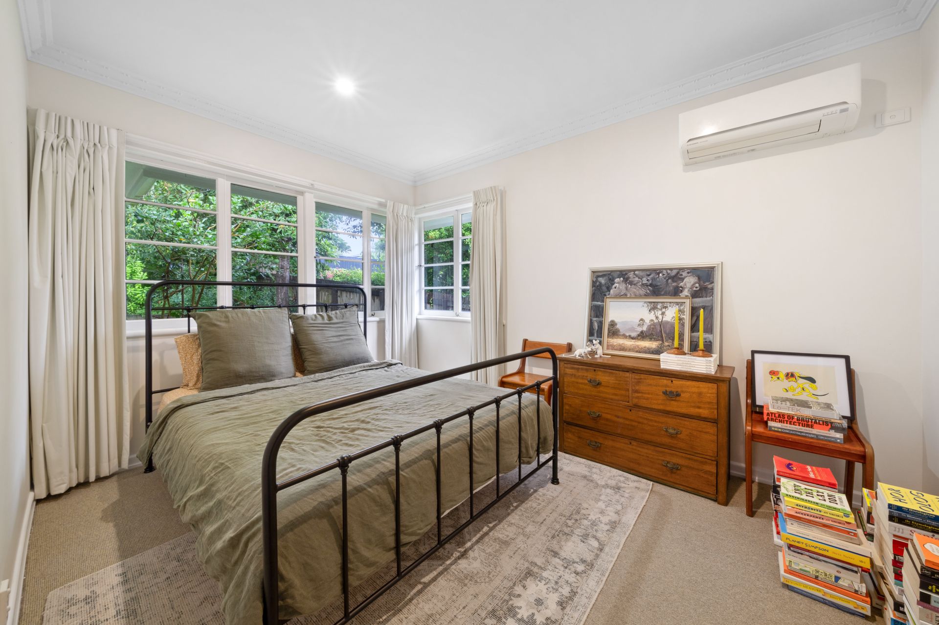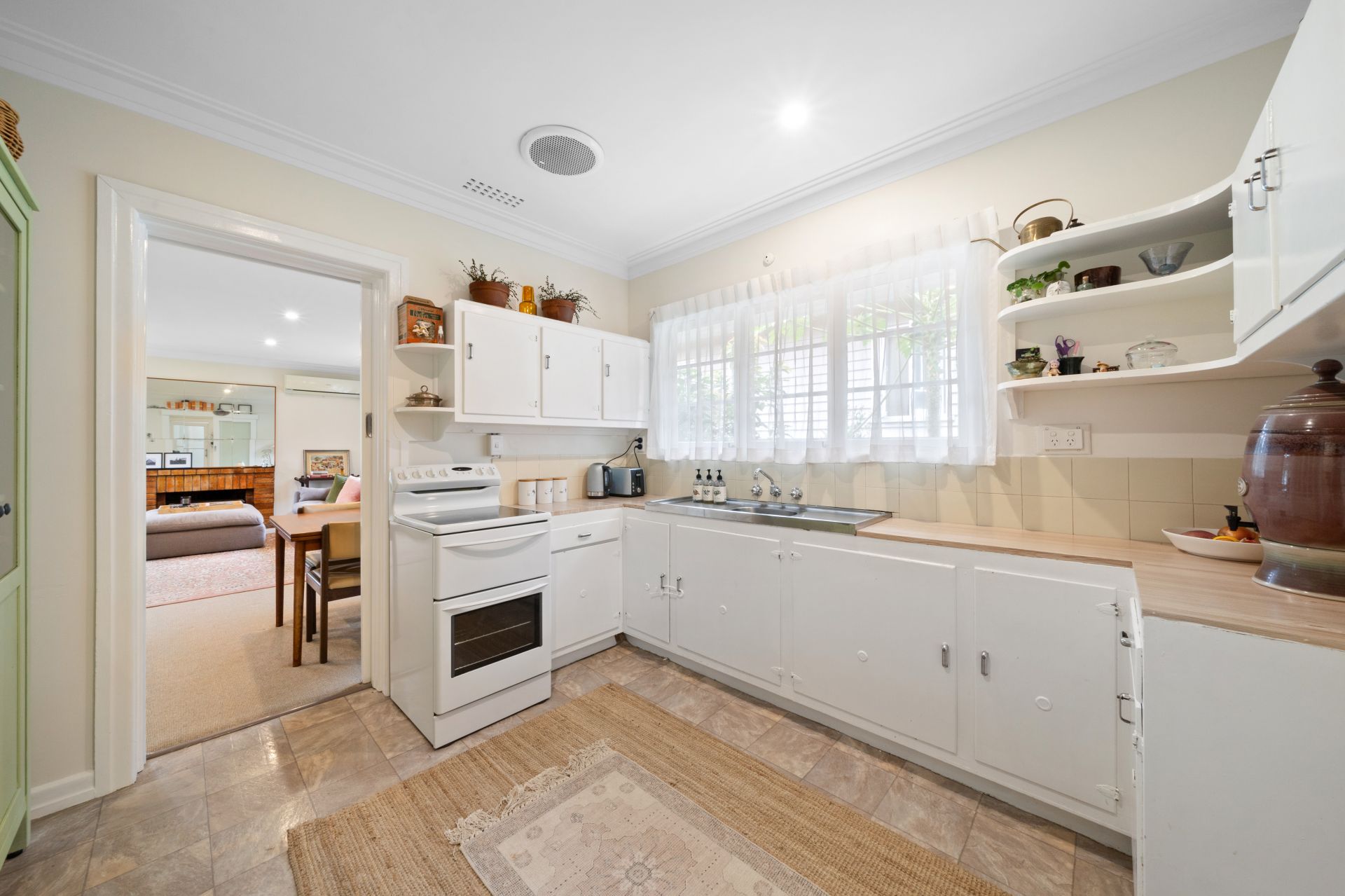 > The spacious living/dining room boasts a brick fireplace and split-system air conditioner ensuring comfort throughout the year. Enjoy the light-filled ambiance complemented by casement windows, ornate cornicing, curtains, and plush carpet flooring.
