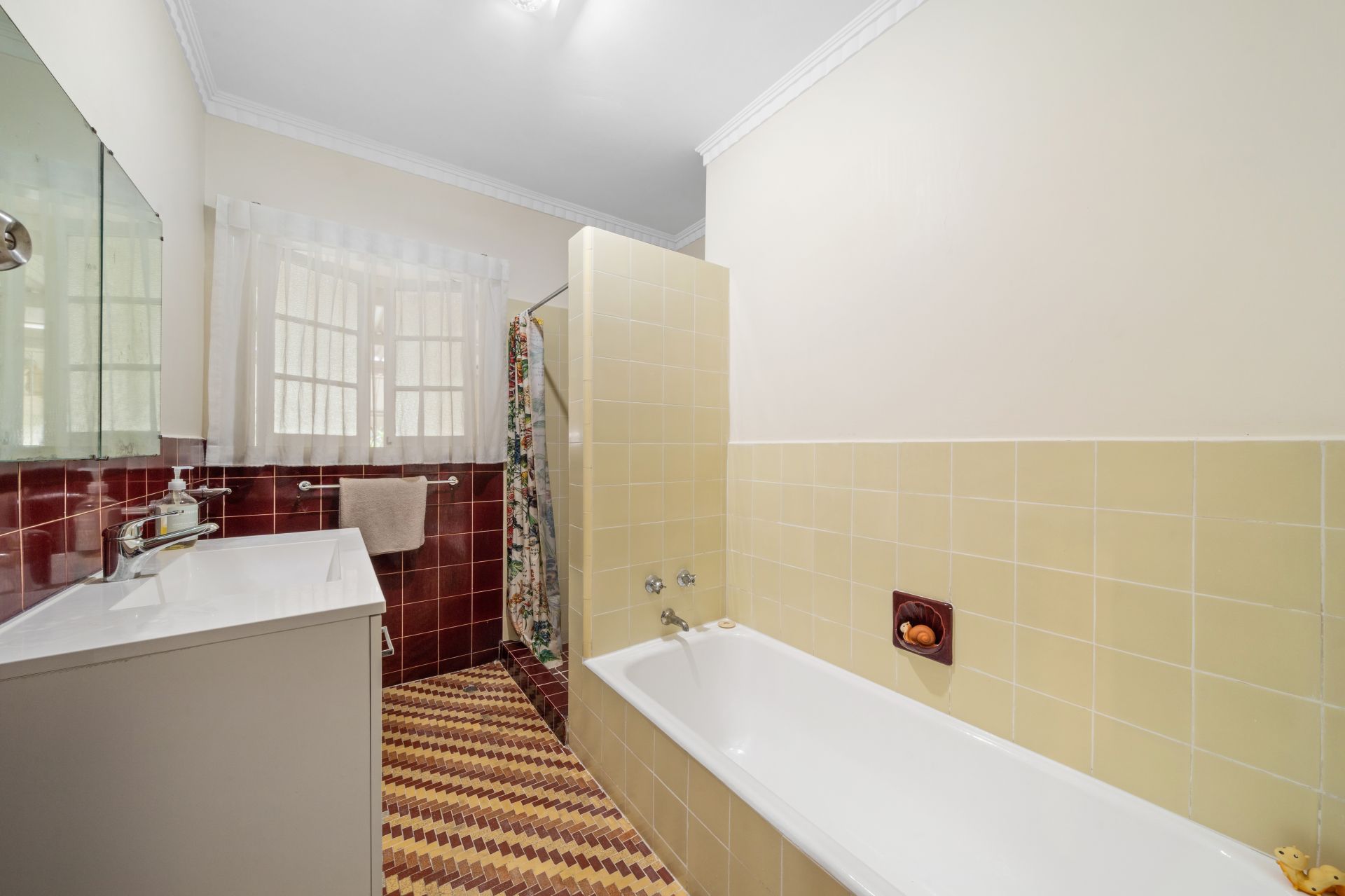 > Centrally located, the bathroom features tile flooring, a shower, a separate bath, single basin vanity with storage, mirrored medicine cabinet, casement windows, curtains, ornate cornicing, and towel rails.