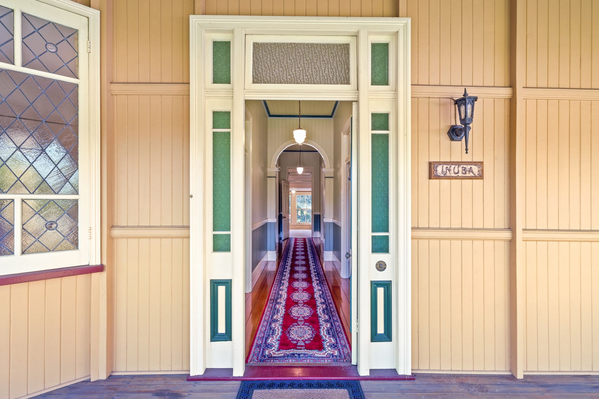 > The grand entrance, adorned with original fretwork and timber decking, welcomes you to an expansive veranda, where a 10m long hallway awaits, boasting 3.3m high ceilings and Georgian archways, setting the stage for the grandeur that lies beyond.