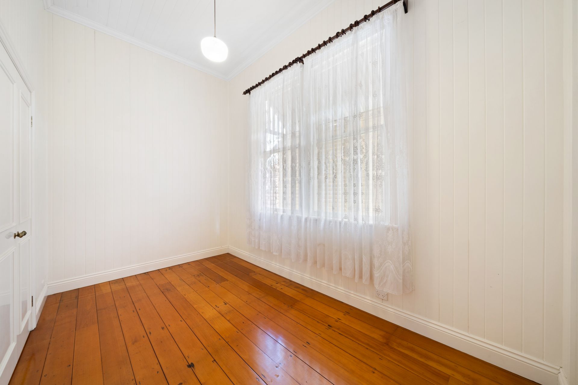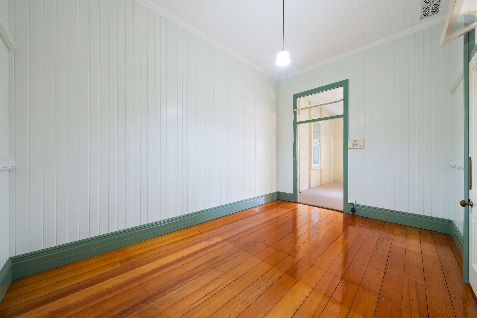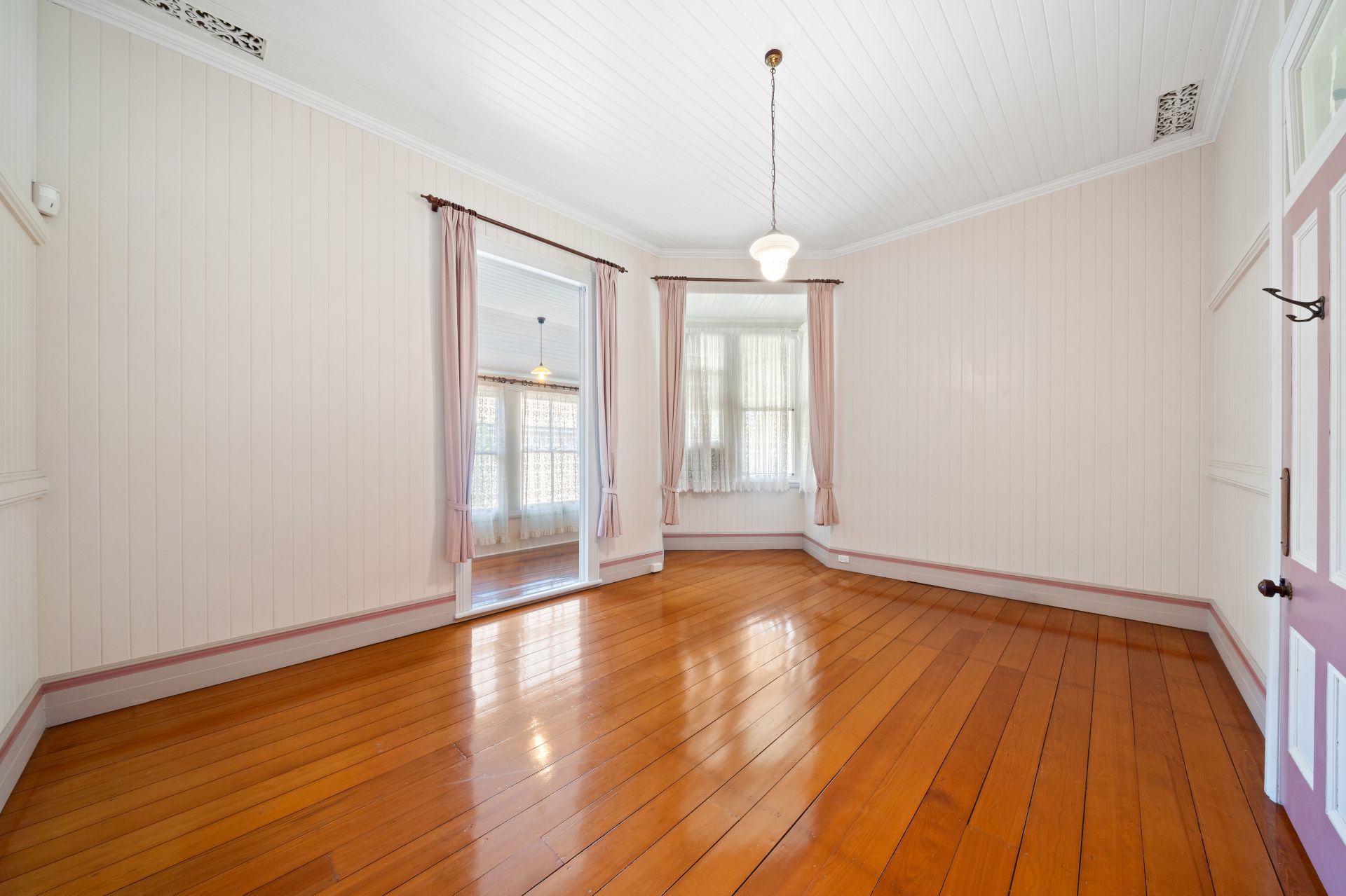 > Bedroom five, accessible from both the living room and grand hallway, impresses with its lofty high ceiling, polished timber flooring, and charming details including pendant lighting and vj panelling, offering a serene sanctuary for relaxation.