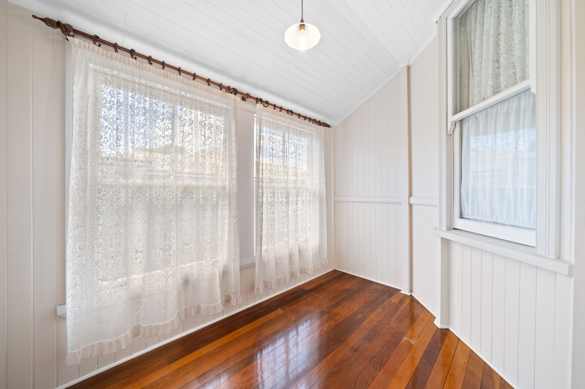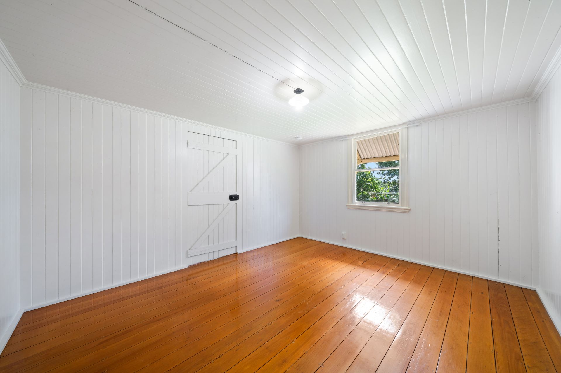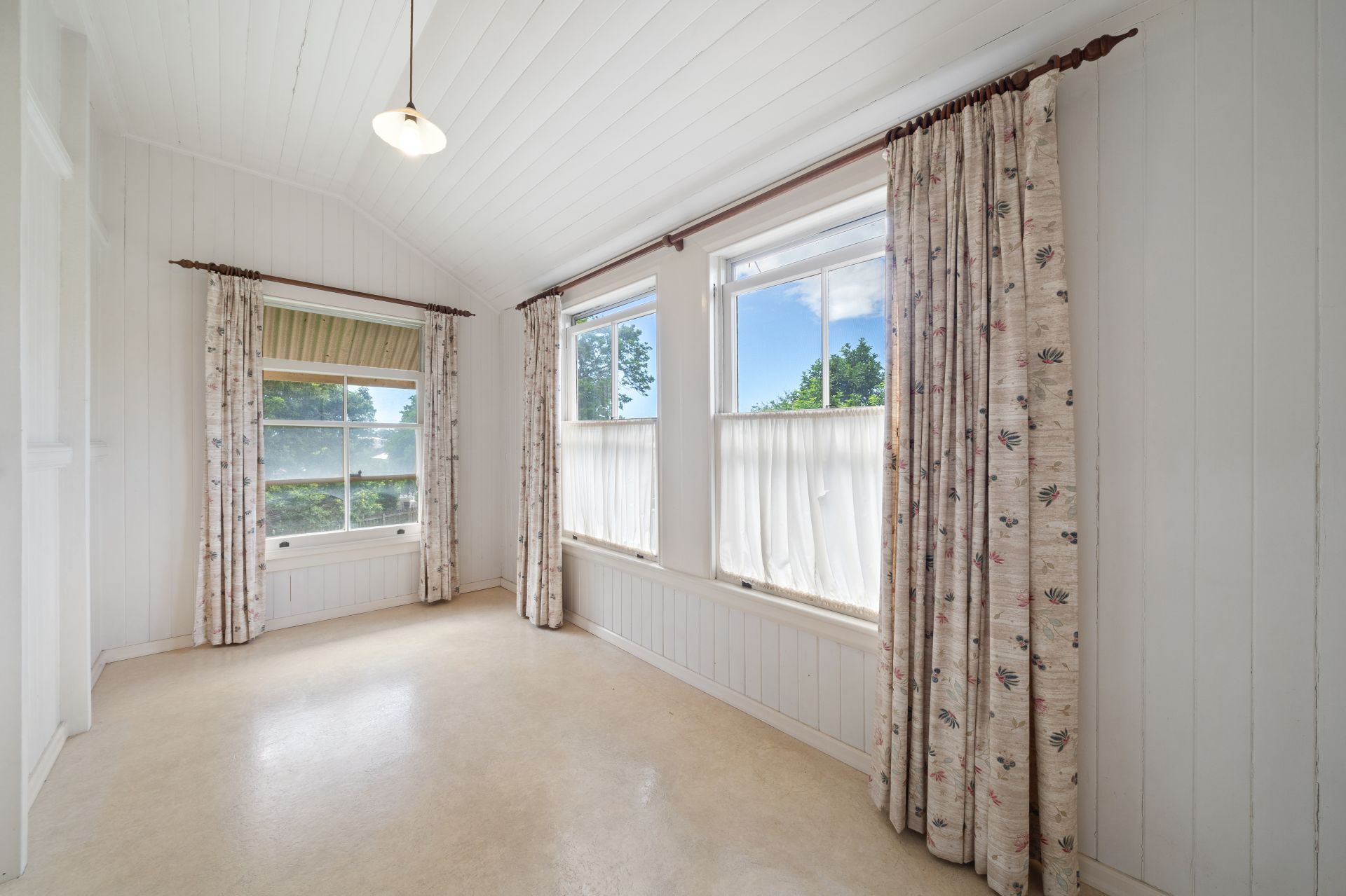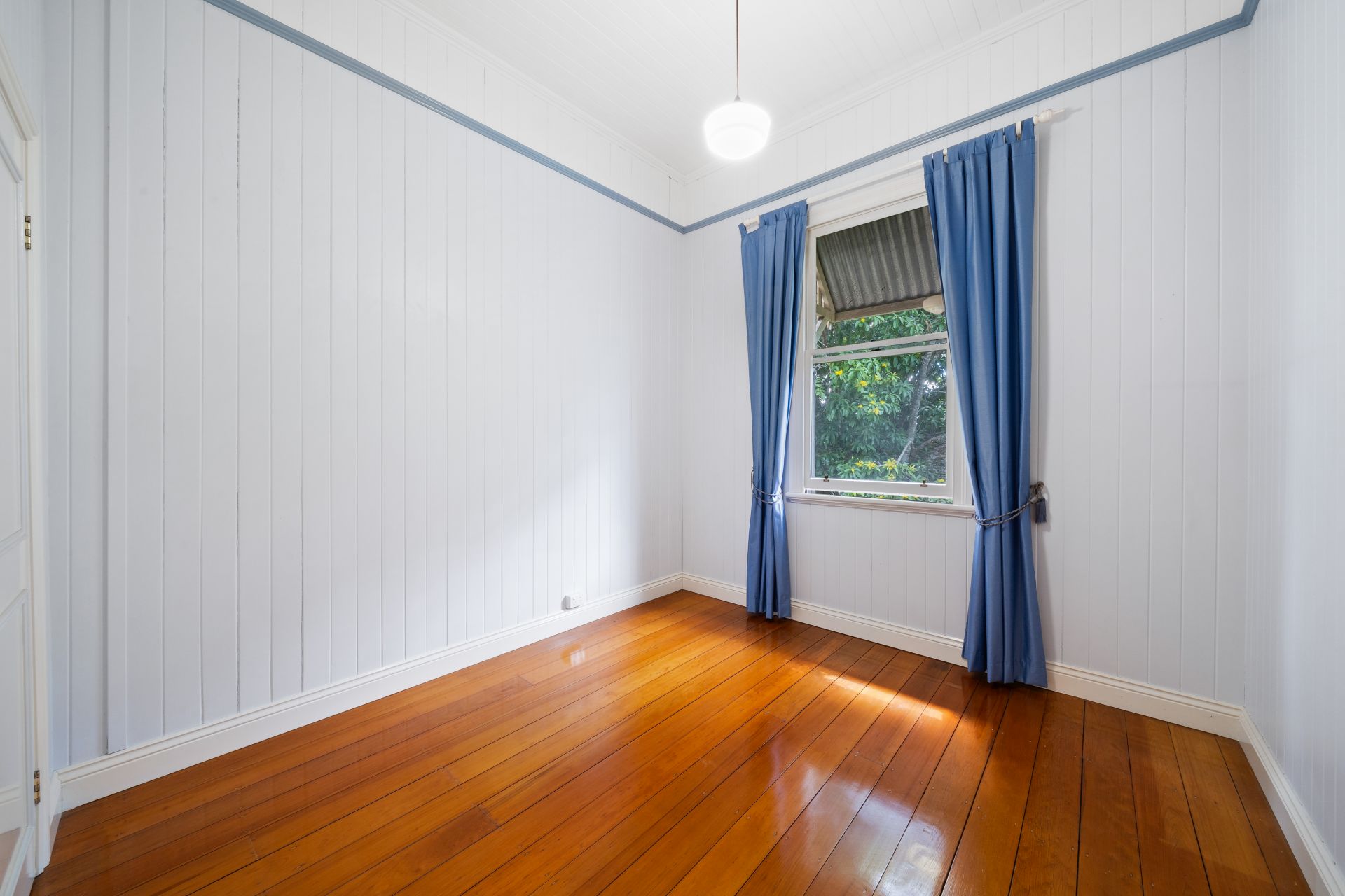 > Bedroom five, accessible from both the living room and grand hallway, impresses with its lofty high ceiling, polished timber flooring, and charming details including pendant lighting and vj panelling, offering a serene sanctuary for relaxation.
