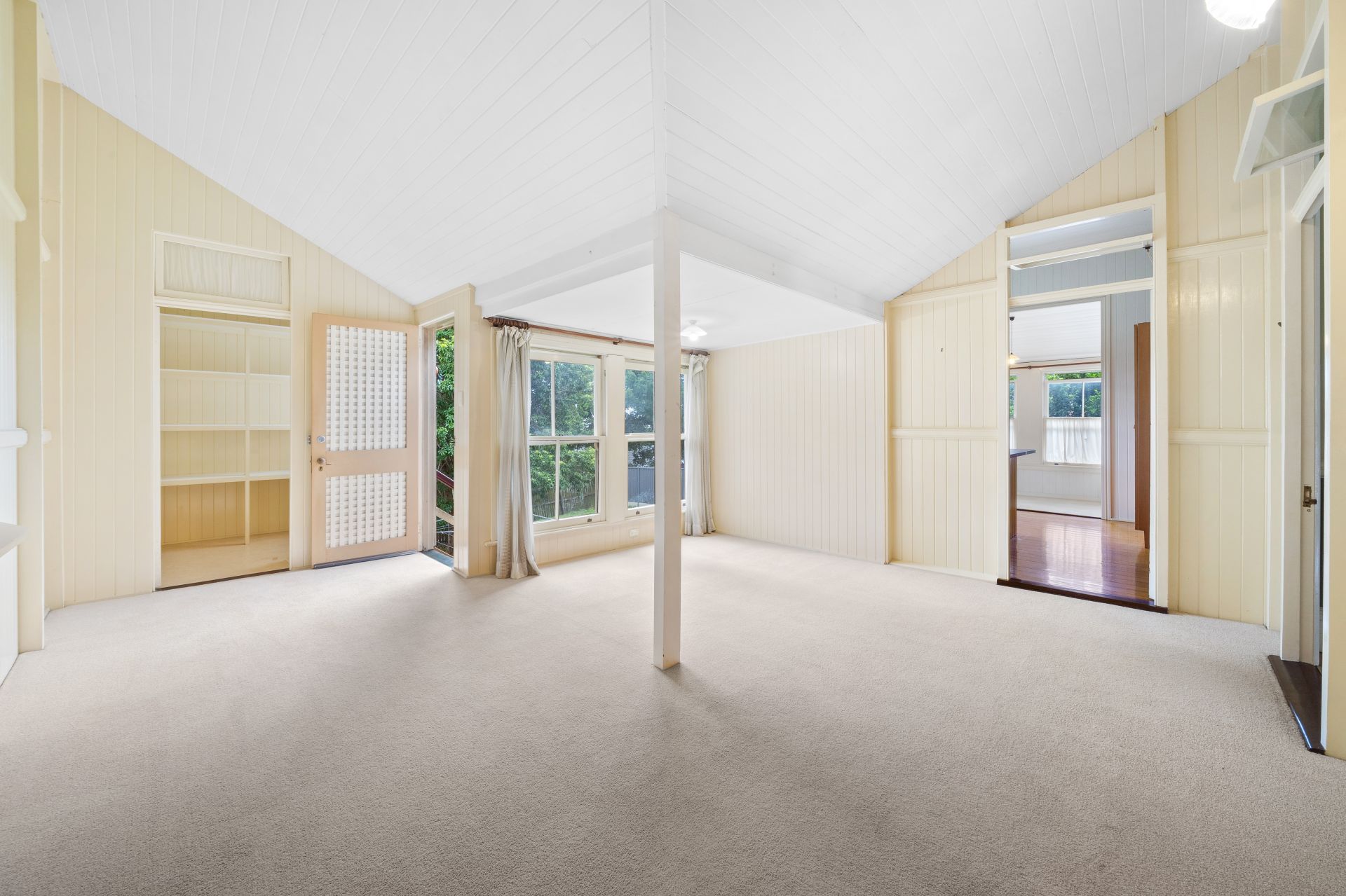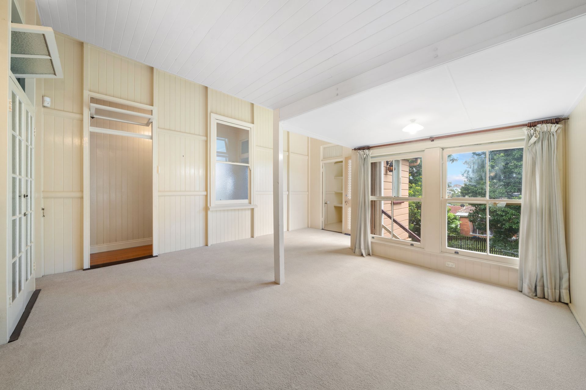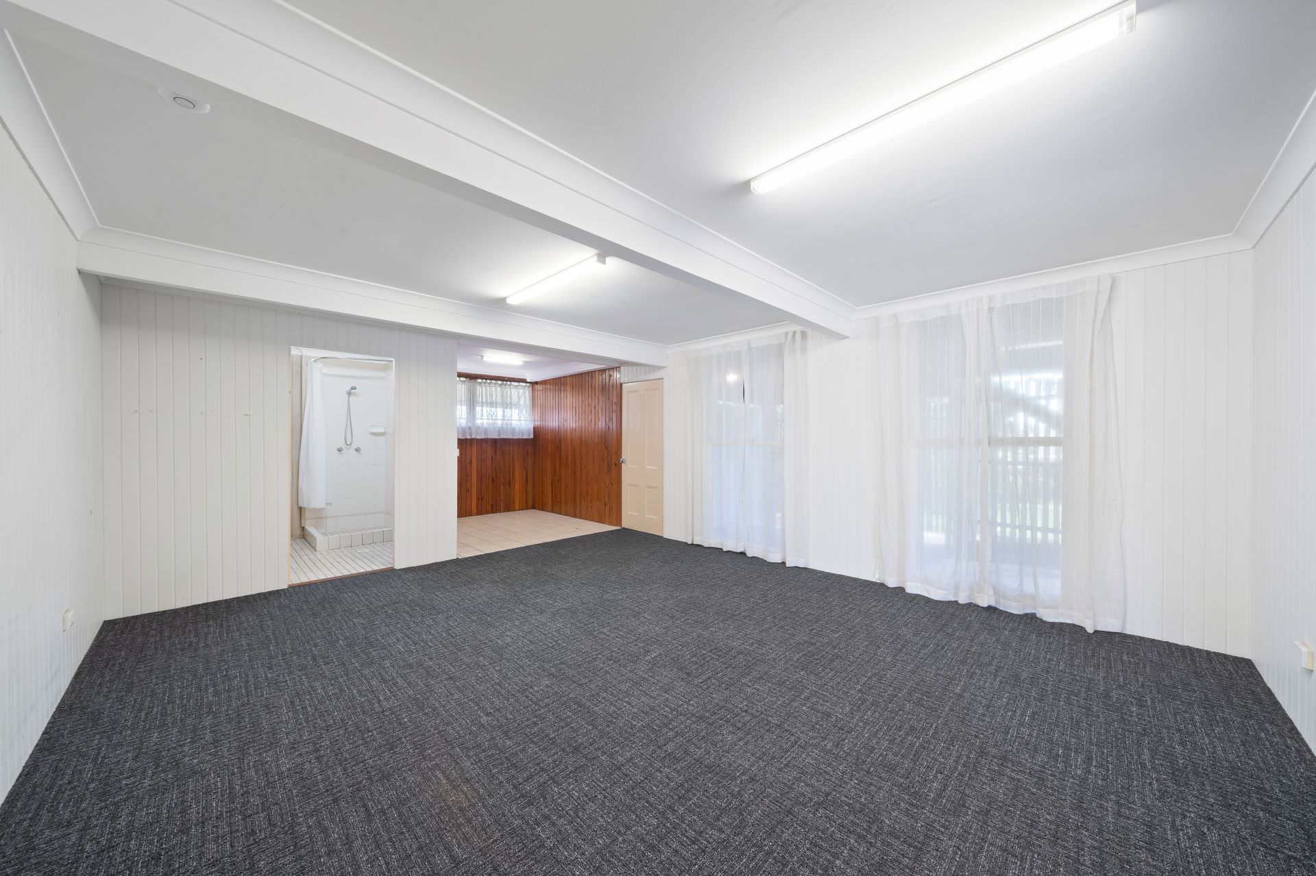 > Downstairs, versatile multipurpose rooms await, offering endless possibilities for customization, these rooms provide the flexibility to accommodate your lifestyle with ease. The single room offers dual entries with polished timber floors, vj paneling, sash window and globe light. The larger multipurpose room offers a robust space with carpet flooring, fluorescent lighting, sash windows with sheer curtains and access to the downstairs bathroom and laundry.
