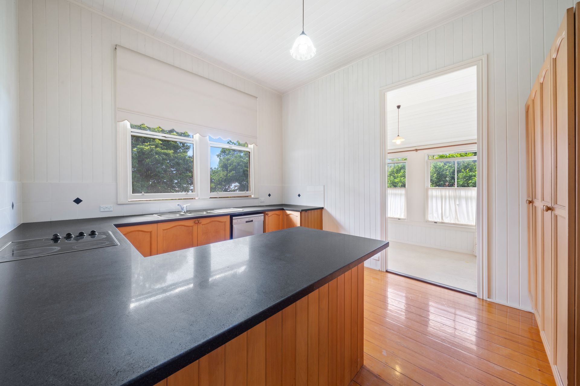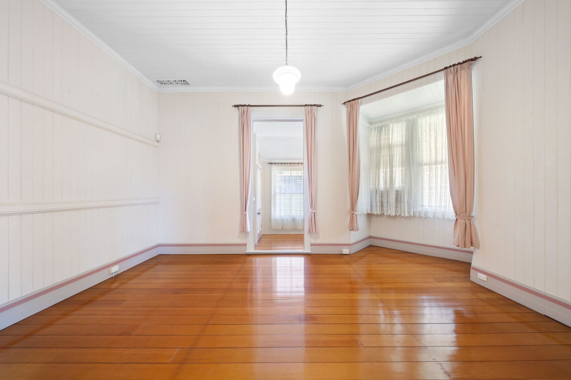 > Bedrooms three and four, nestled down the rear hall, boast polished timber flooring, transom window, ample natural light, and thoughtful touches such as large built-in wardrobes, pendant light, and vj panelling, ensuring both style and functionality.