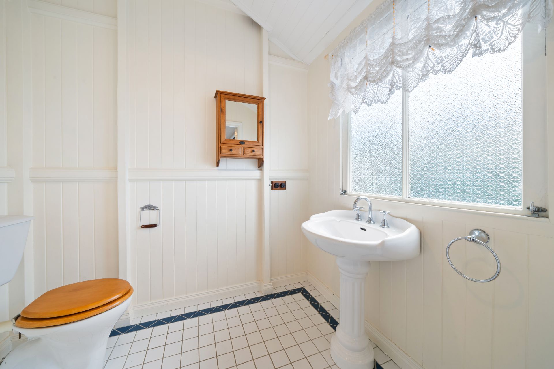 > The powder room to the second bedroom upstairs, adds a touch of elegance with its freestanding basin, tiled flooring, pendant lighting and a toilet.