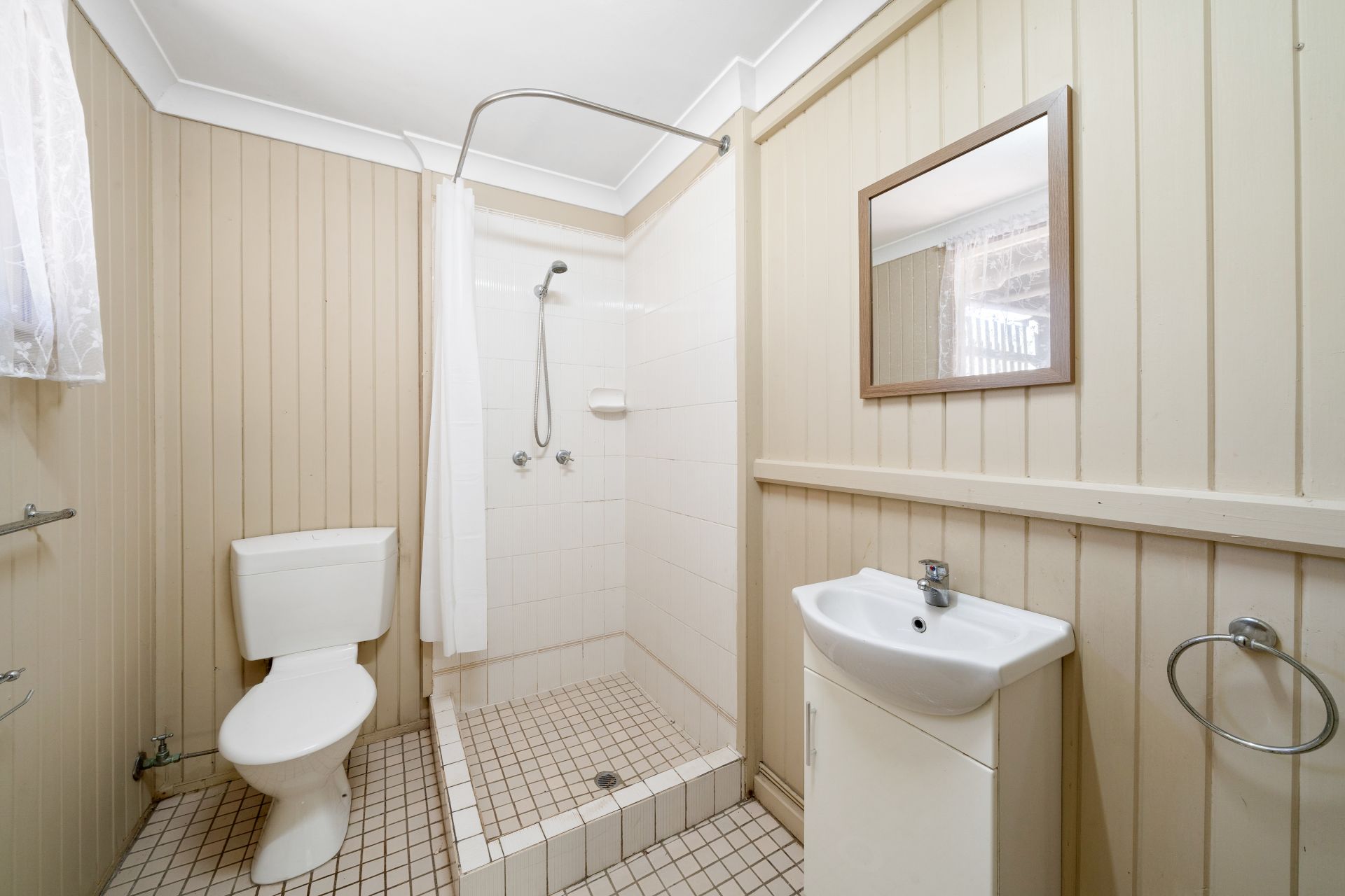 > Downstairs, a full bathroom awaits, boasting a shower with detachable showerhead, vj panelling, tile flooring, single basin vanity with storage and wall hung mirror.