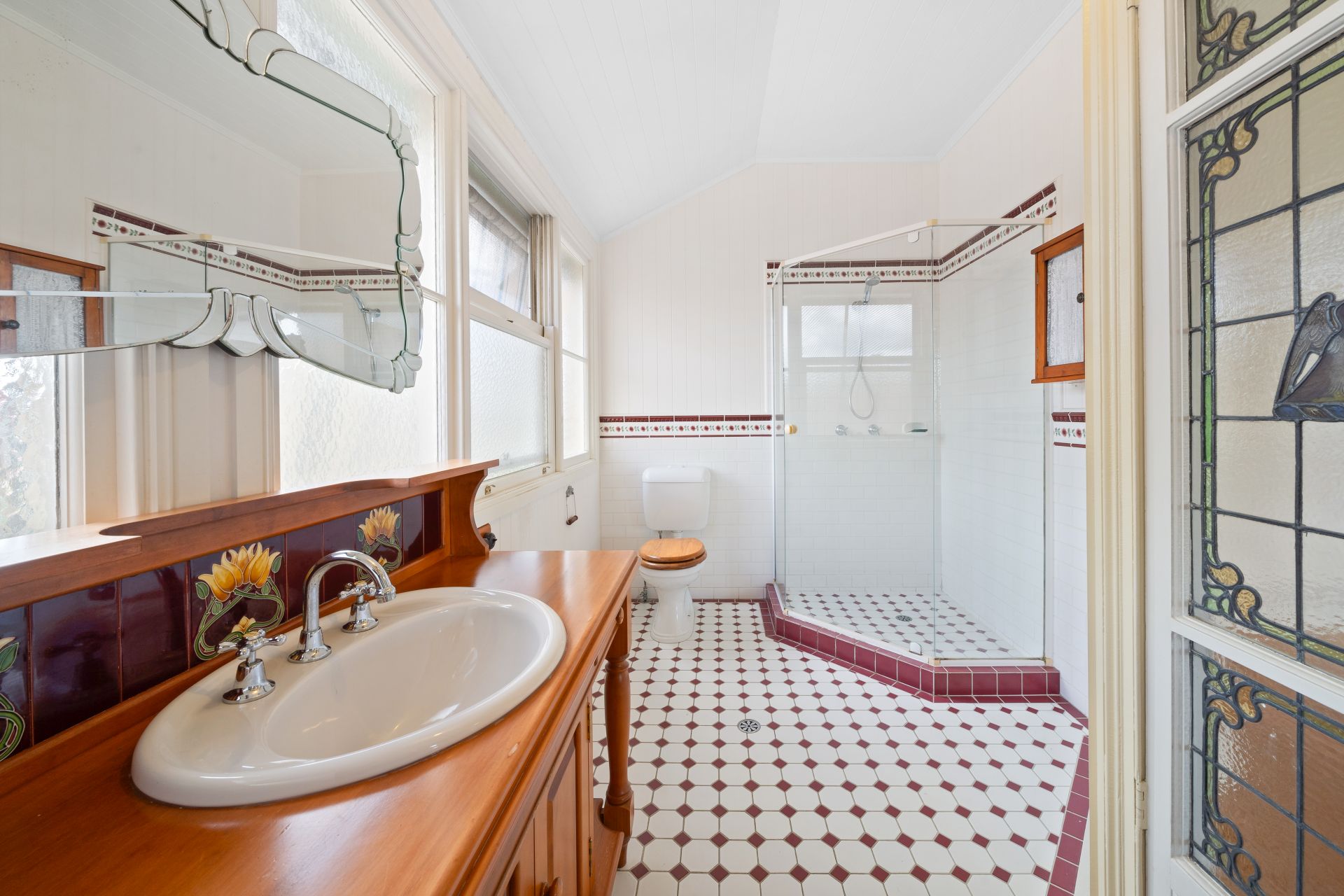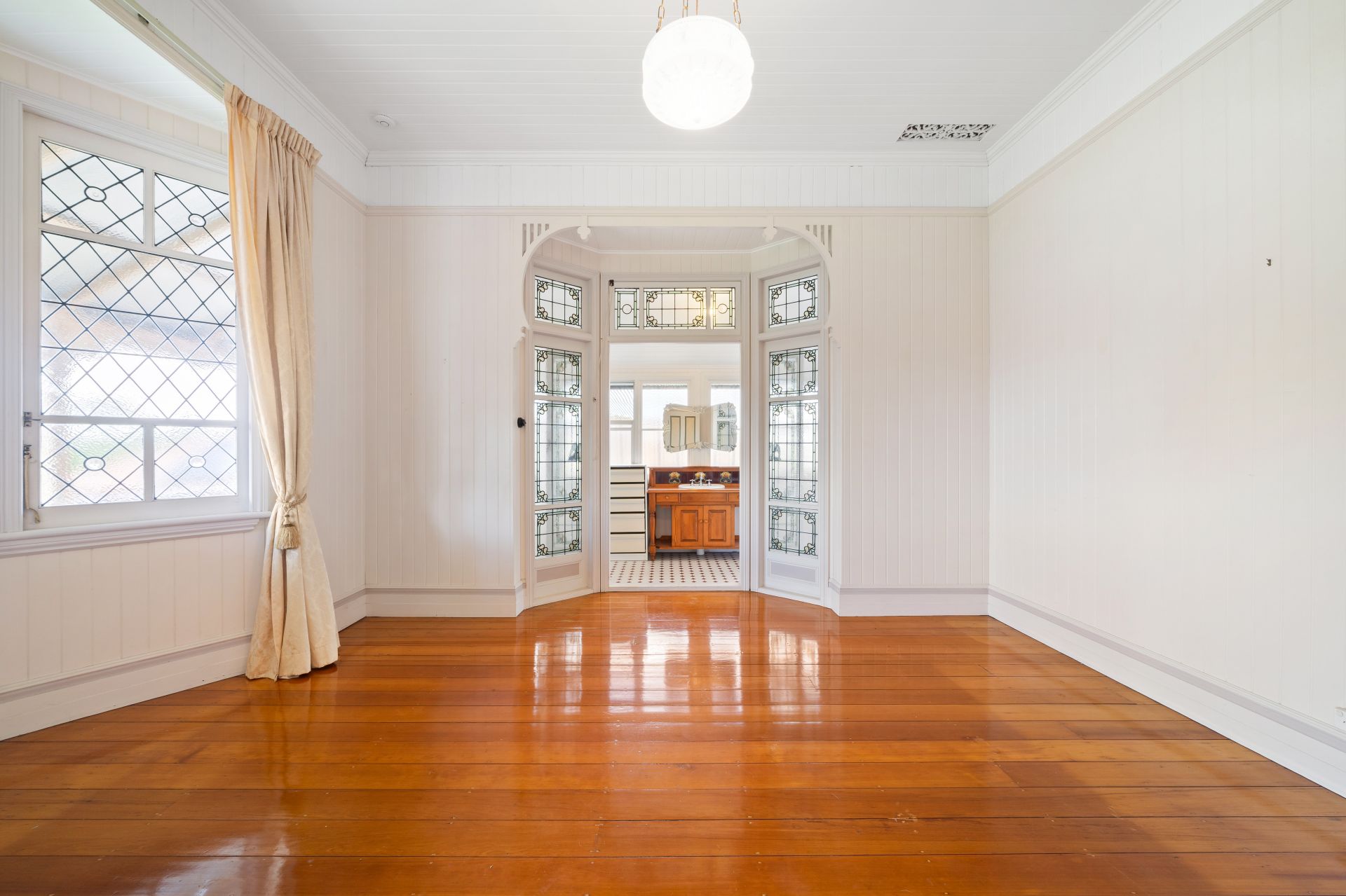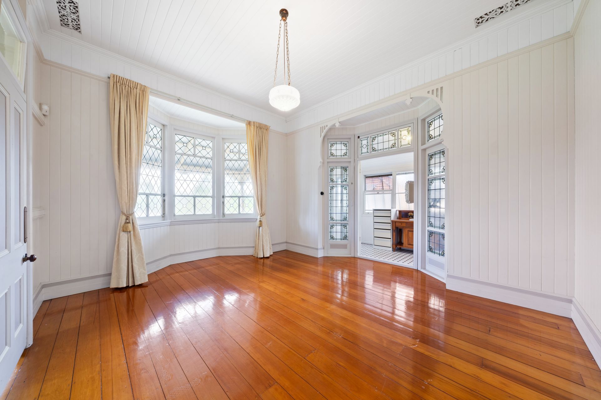 > The master bedroom sets a standard of opulence with polished timber flooring, soaring 3.3m ceilings with transom window, and exquisite features including picture railing, casement windows adorned with curtains, and pendant lighting. Step through stunning stained glass doors to discover a serene ensuite retreat and built-in robe.