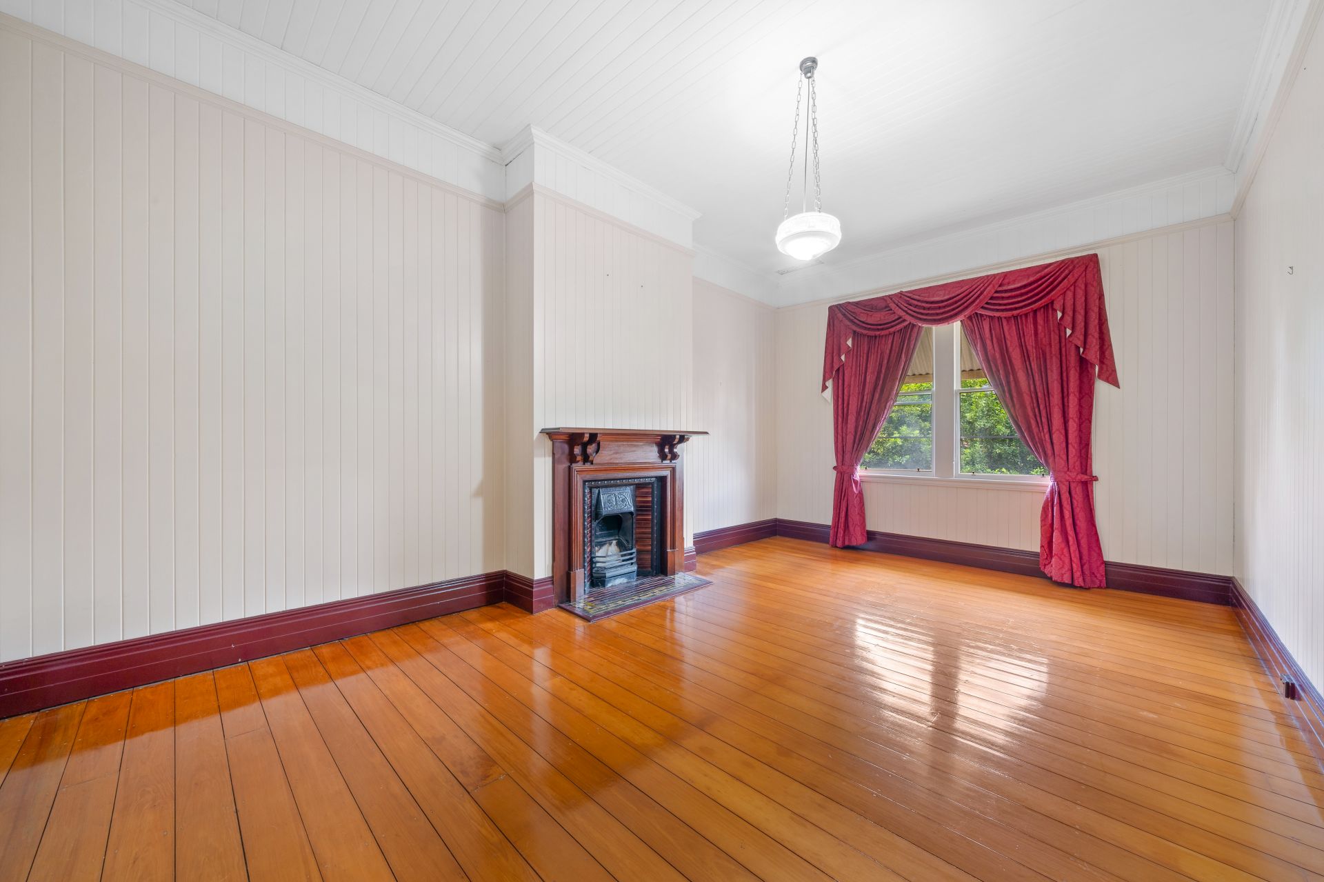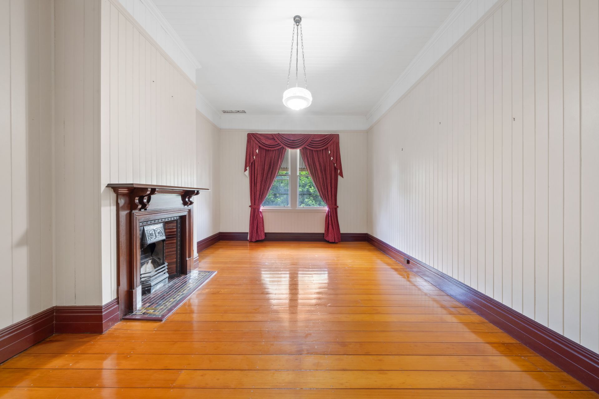 > The grand living room, with its soaring ceilings and brick fireplace, offers a warm and inviting atmosphere, perfect for entertaining guests or simply relaxing with loved ones. Offering polished timber flooring, sash windows with curtains and pendant lighting.