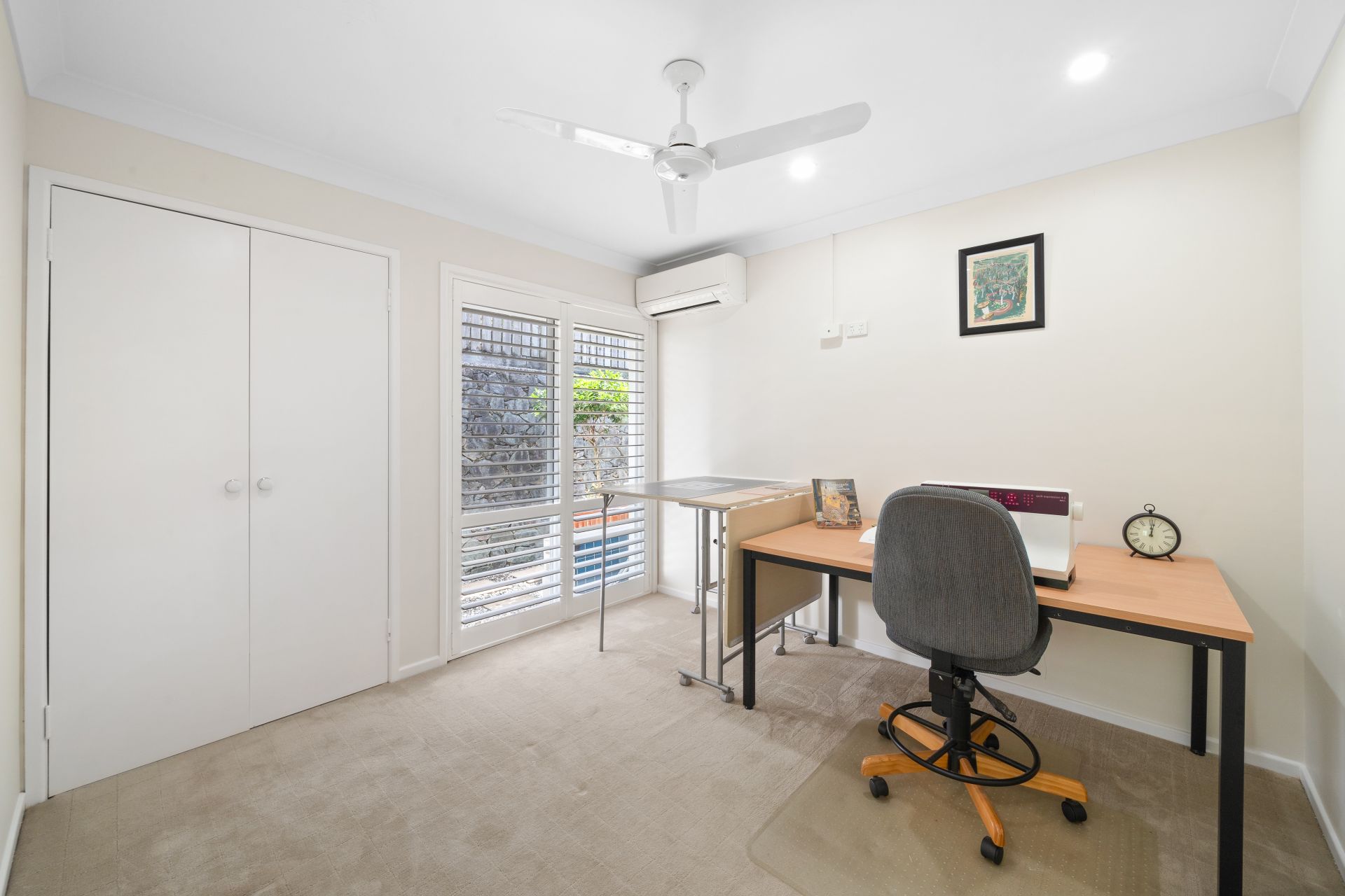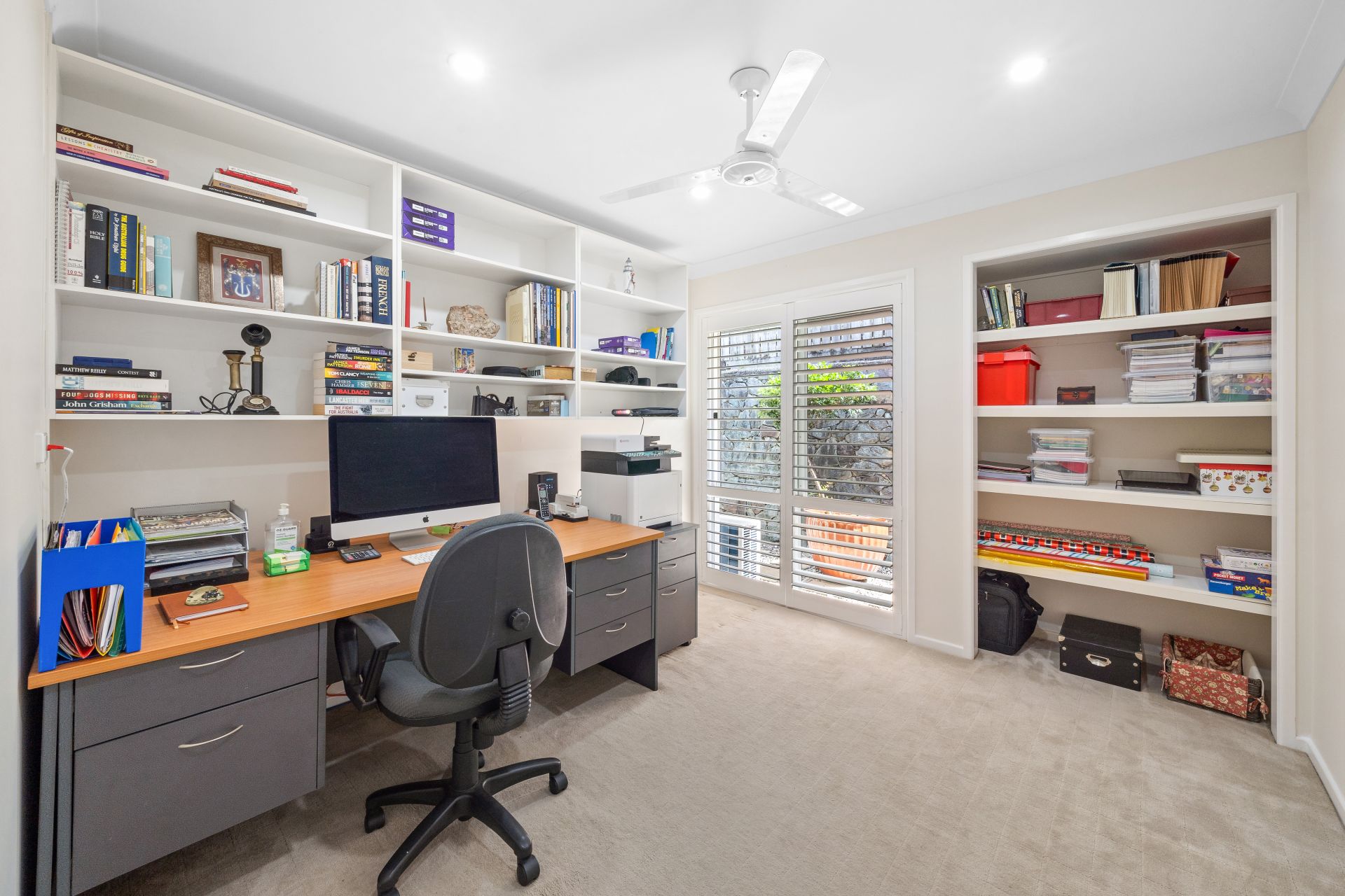 > Bedroom 3 features carpet flooring, ceiling fan, standard lighting, plantation shutters, sliding windows, security mesh, wall mounted shelves and book shelf.